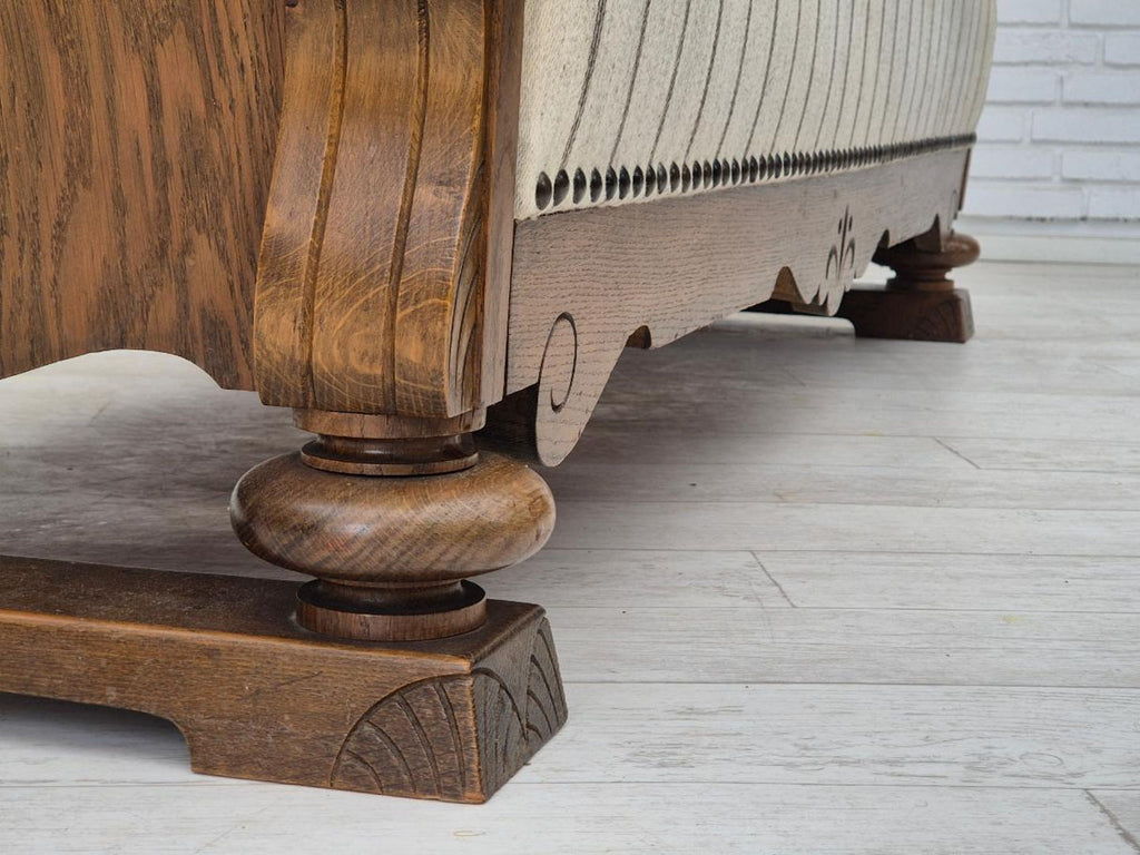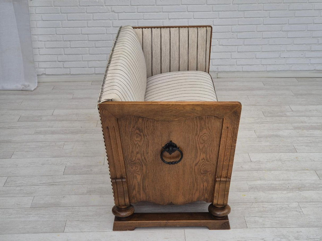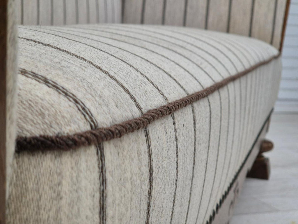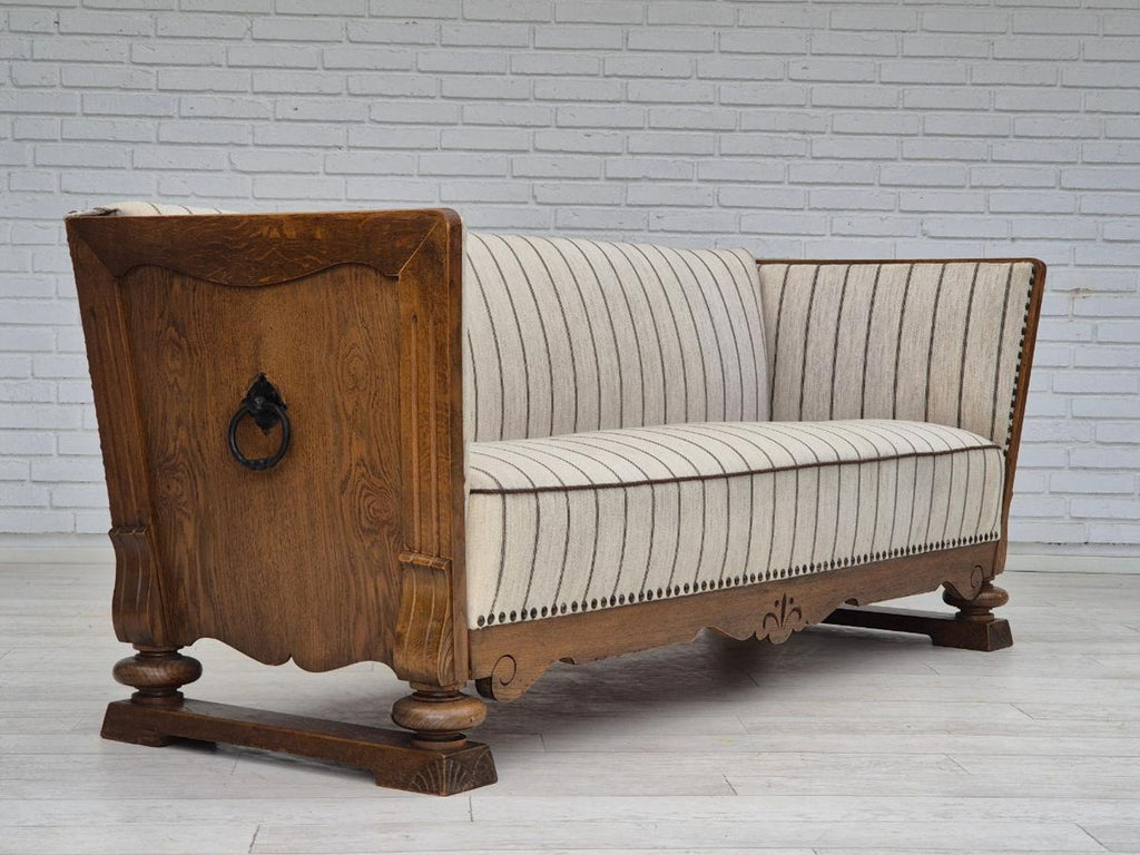 1950년대, 덴마크산 고급 가구 양모 소재의 2인용 소파. 소파는 약 20년 전에 다시 덮개를 씌웠습니다. 상태 아주 좋습니다: 냄새도 없고 얼룩도 없습니다. 재생된 참나무, 시트의 황동 스프링. 측면의 황동 손잡이. 1950~55년대 덴마크 가구 제조업체에서 제조되었습니다.