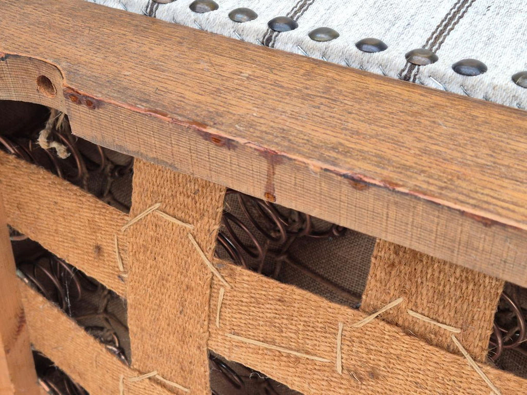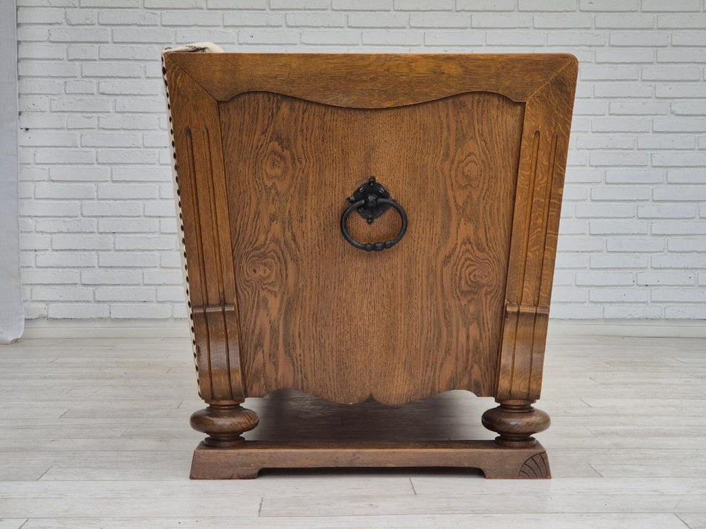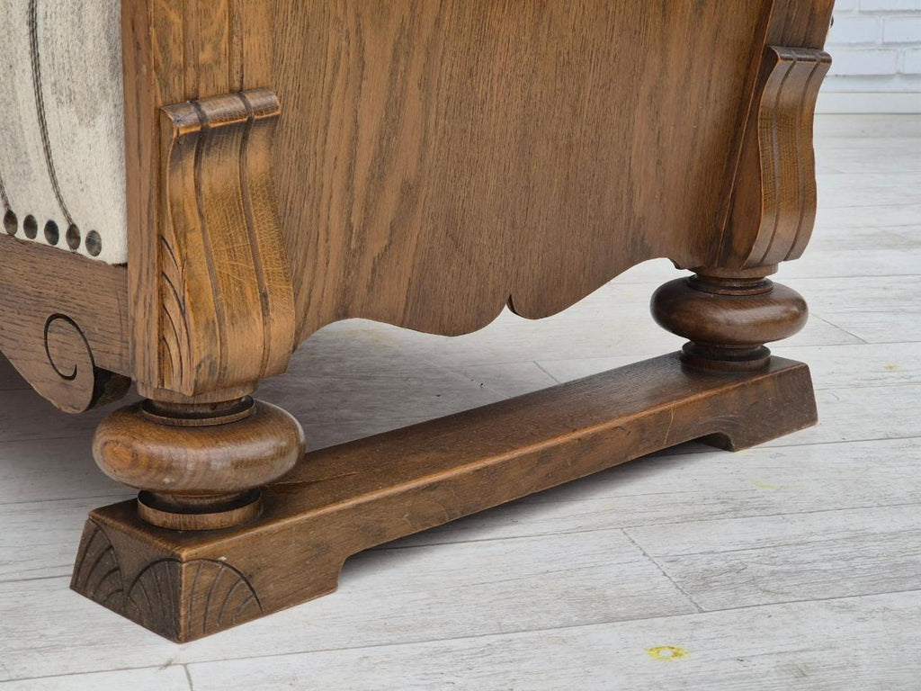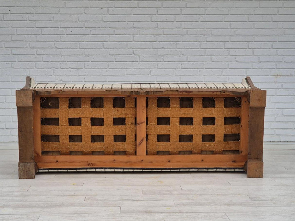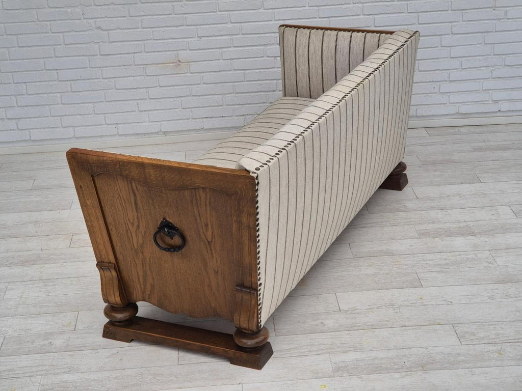1950년대, 덴마크산 고급 가구 양모 소재의 2인용 소파. 소파는 약 20년 전에 다시 덮개를 씌웠습니다. 상태 아주 좋습니다: 냄새도 없고 얼룩도 없습니다. 재생된 참나무, 시트의 황동 스프링. 측면의 황동 손잡이. 1950~55년대 덴마크 가구 제조업체에서 제조되었습니다.