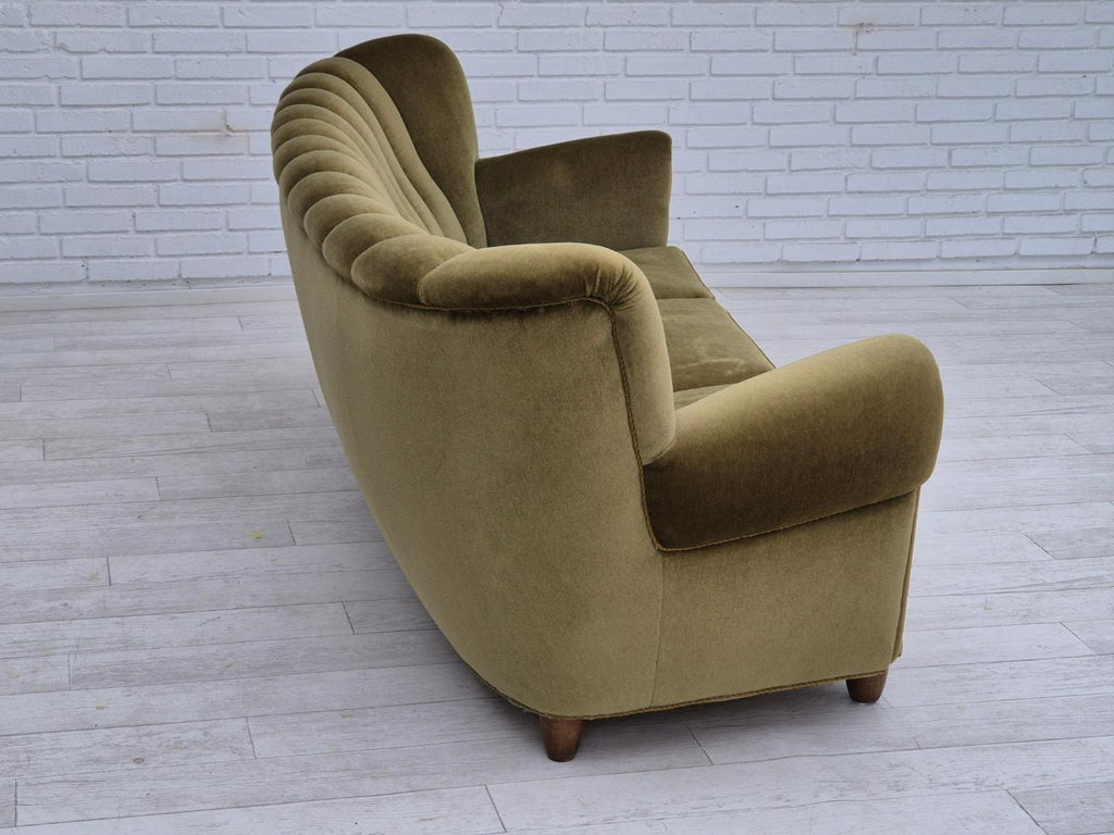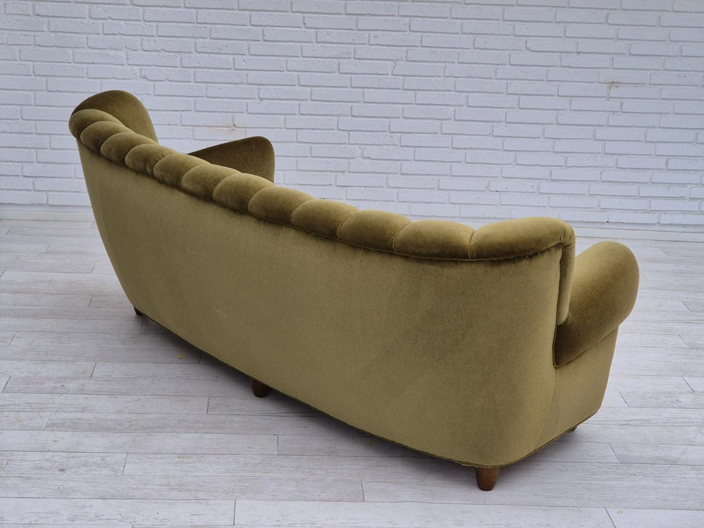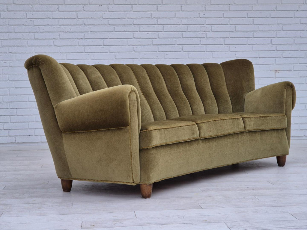 1960s, Danish 3 seater sofa in original very good condition: no smells and no stains. Danish design for Central Møbler Odense. Green furniture velour, beech wood legs, brass springs in the seat and back. Manufactured by Danish furniture maker in about 1965s.
