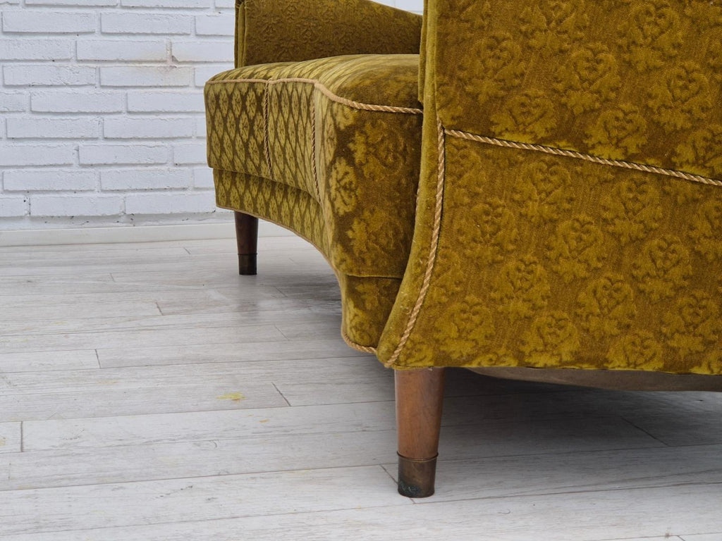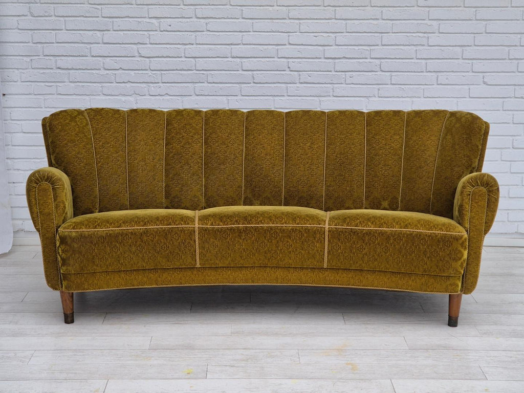 1960s, Danish 3 seater curved sofa in original very good condition: no smells and no stains. Original green furniture velour, beech wood legs with brass plugs. Brass springs in the seat. Manufactured by Danish furniture manufacturer in about 1960-65s.