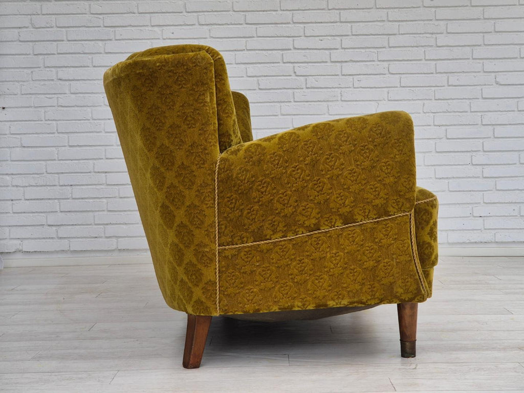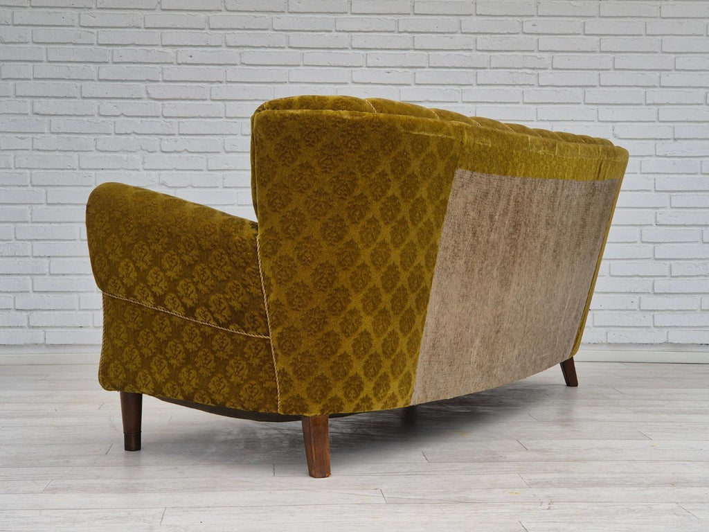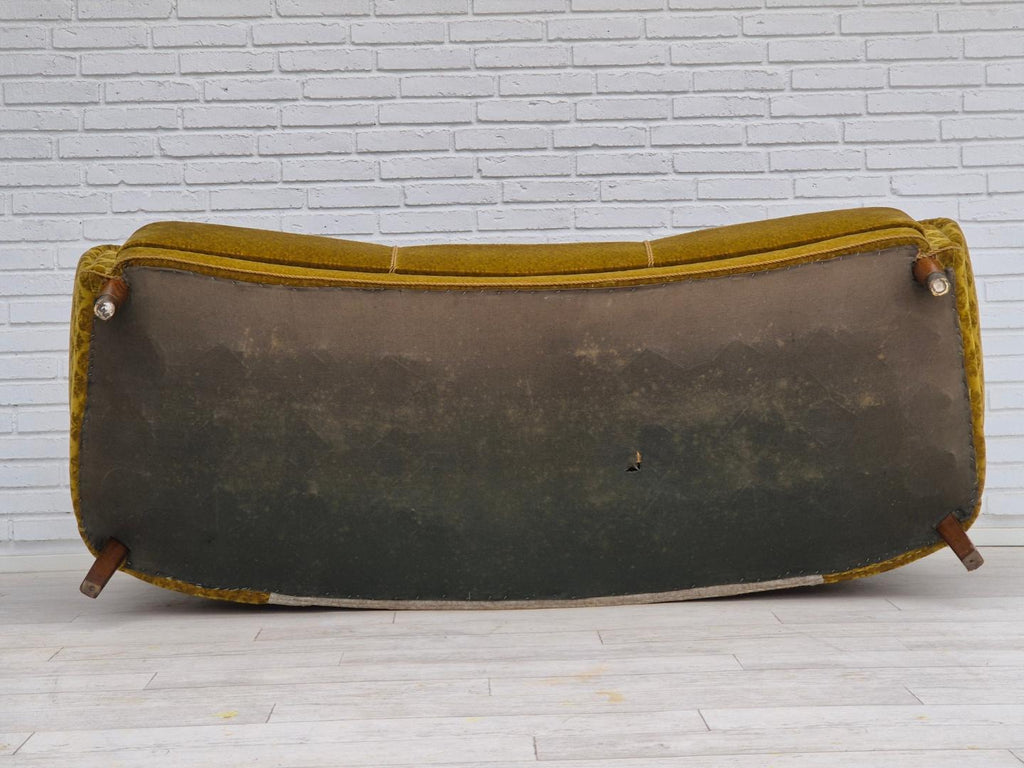 1960년대, 덴마크산 3인용 곡선형 소파, 원래 상태 매우 양호함: 냄새도 얼룩도 없습니다. 오리지널 그린 가구 벨루어, 너도밤나무 다리, 황동 플러그. 좌석에 황동 스프링이 있습니다. 1960~65년대 덴마크 가구 제조업체에서 제조되었습니다.