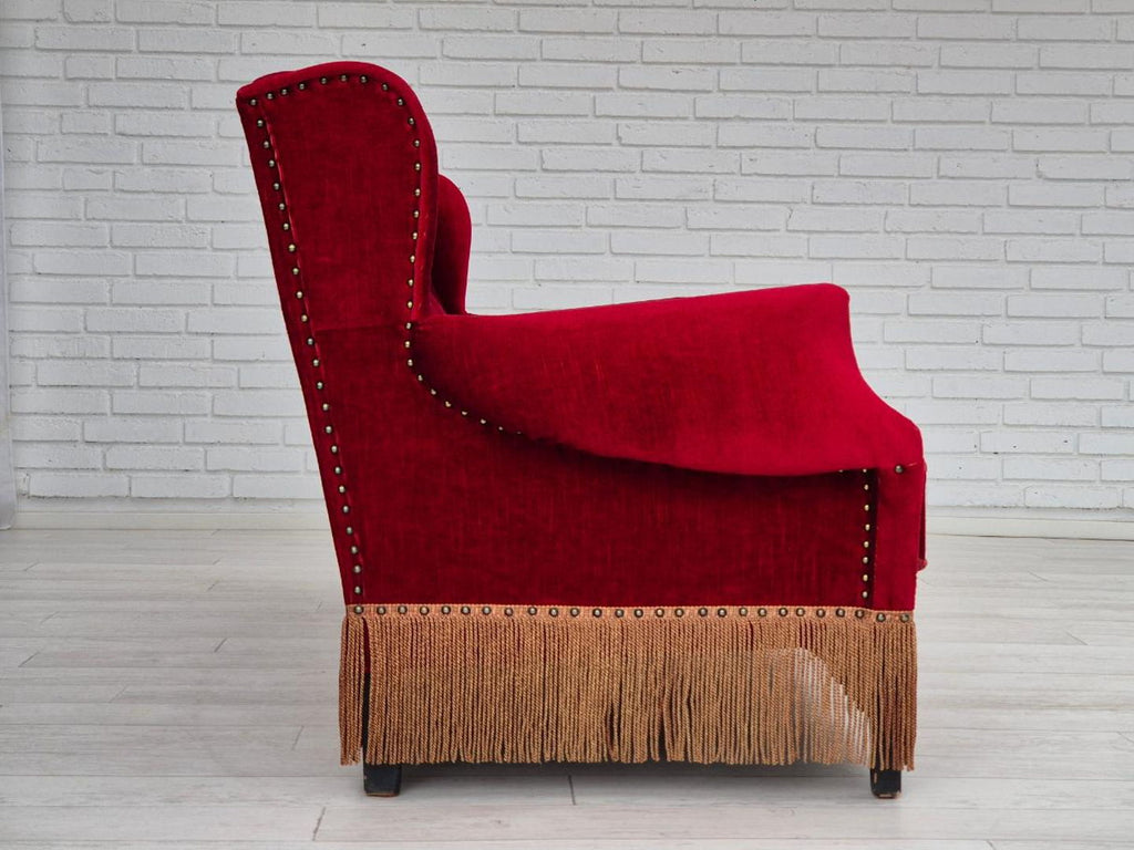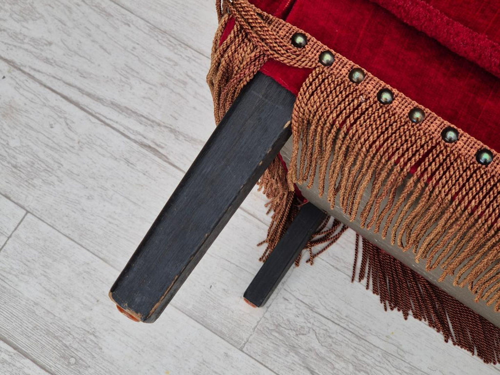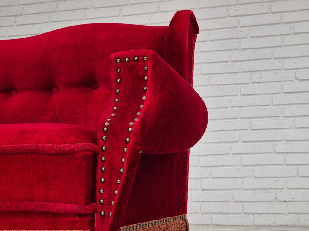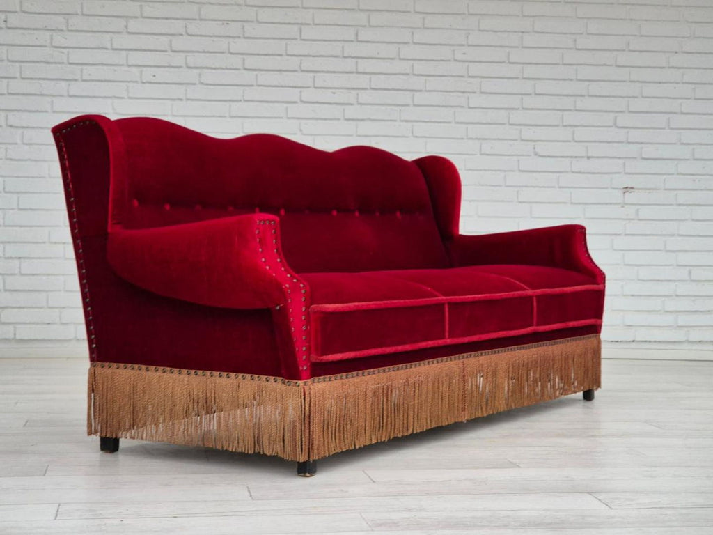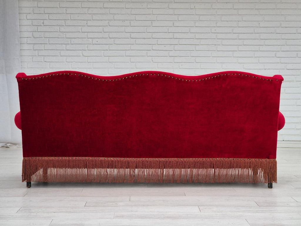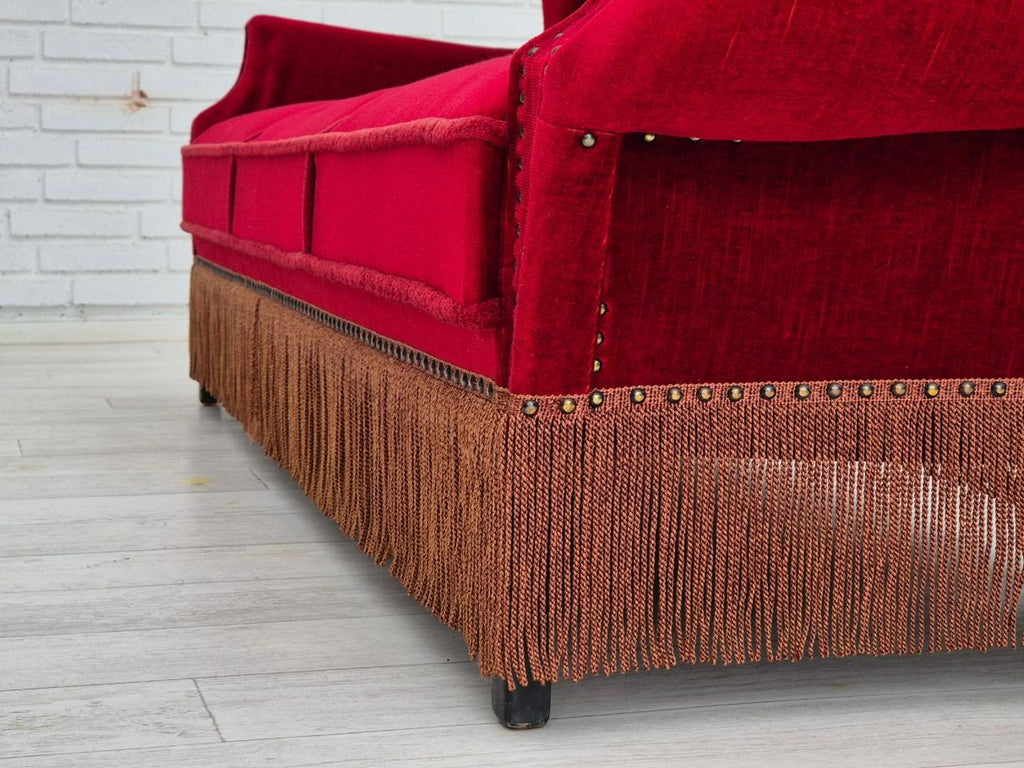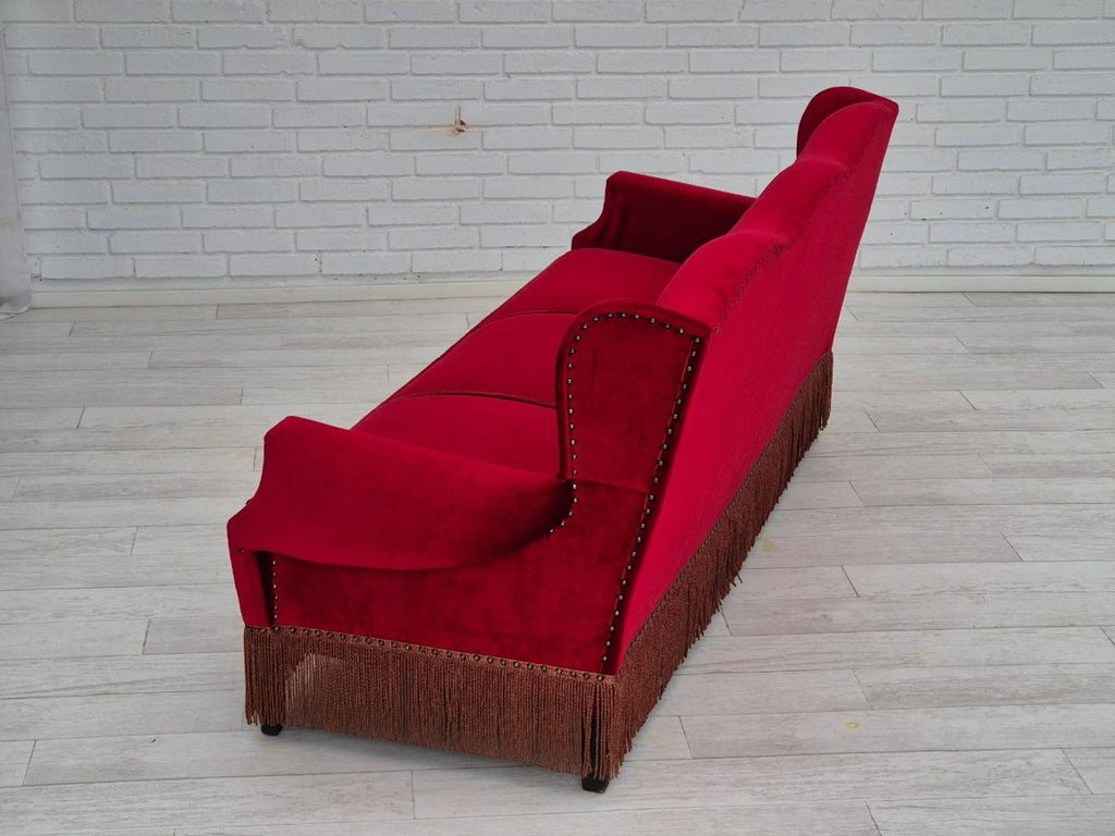 1960s, Danish 3 seater sofa in original very good condition: no smells and no stains. Cherry-red furniture velour, oak wood legs. Springs in the seat. Manufactured by Danish furniture manufacturer in about 1960s.
