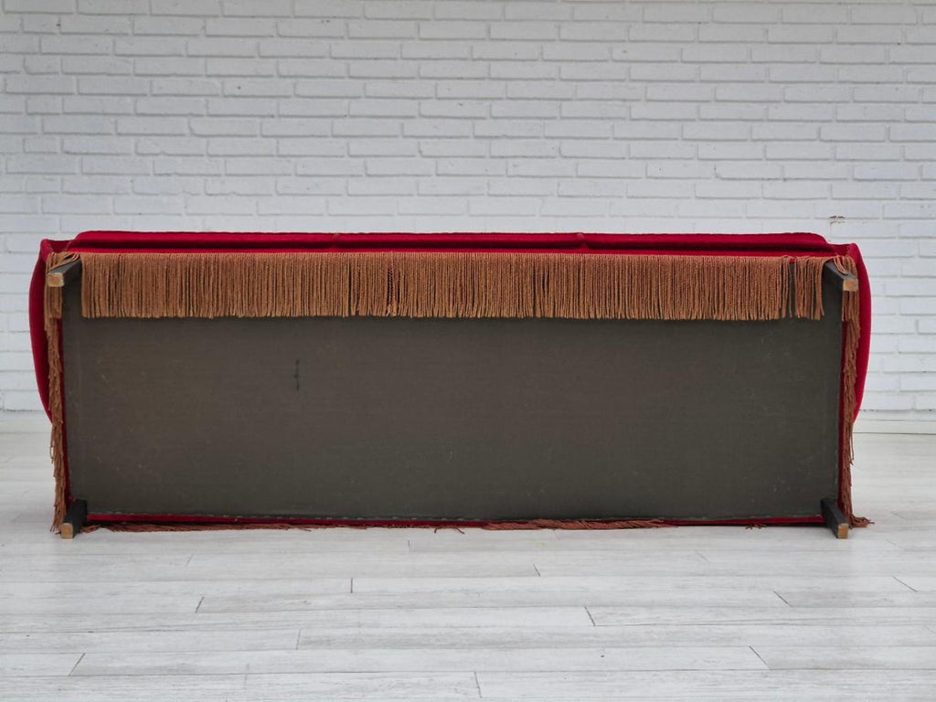 1960년대 덴마크산 3인용 소파 오리지널 상태 매우 양호함: 냄새도 얼룩도 없습니다. 체리 레드 가구 벨루어, 참나무 다리. 좌석에 스프링이 있습니다. 1960년대경 덴마크의 가구 제조업체에서 제조되었습니다.