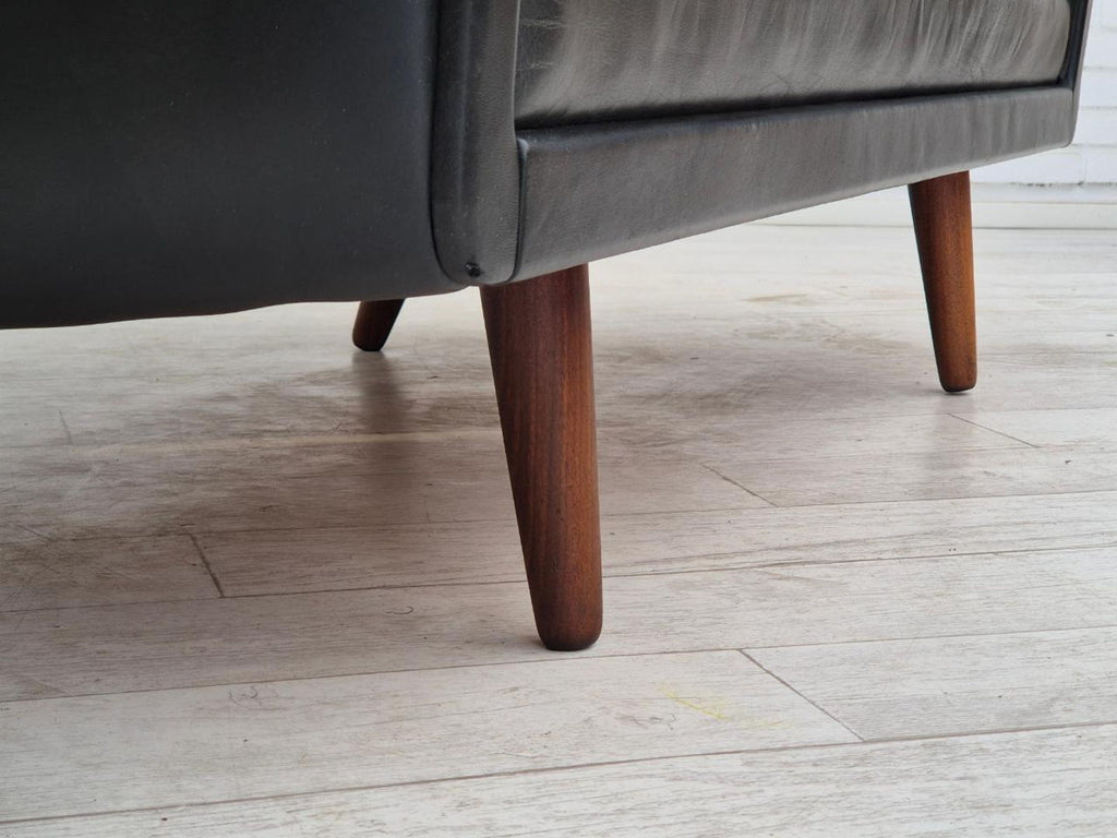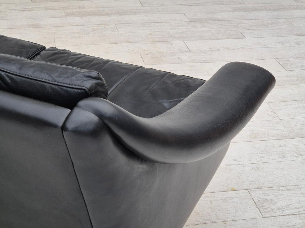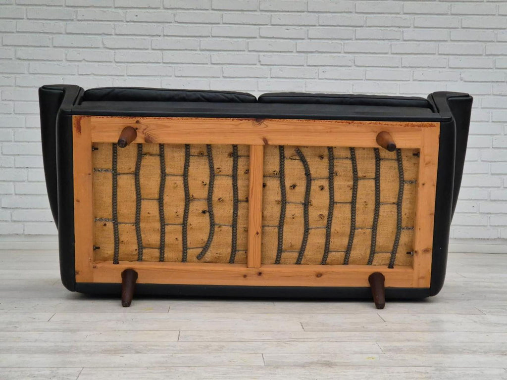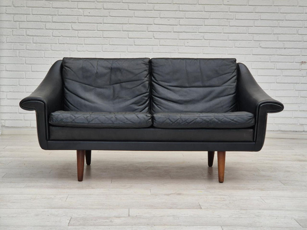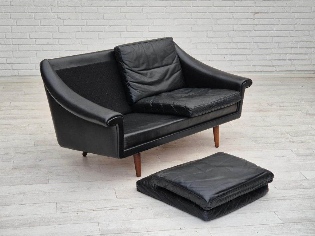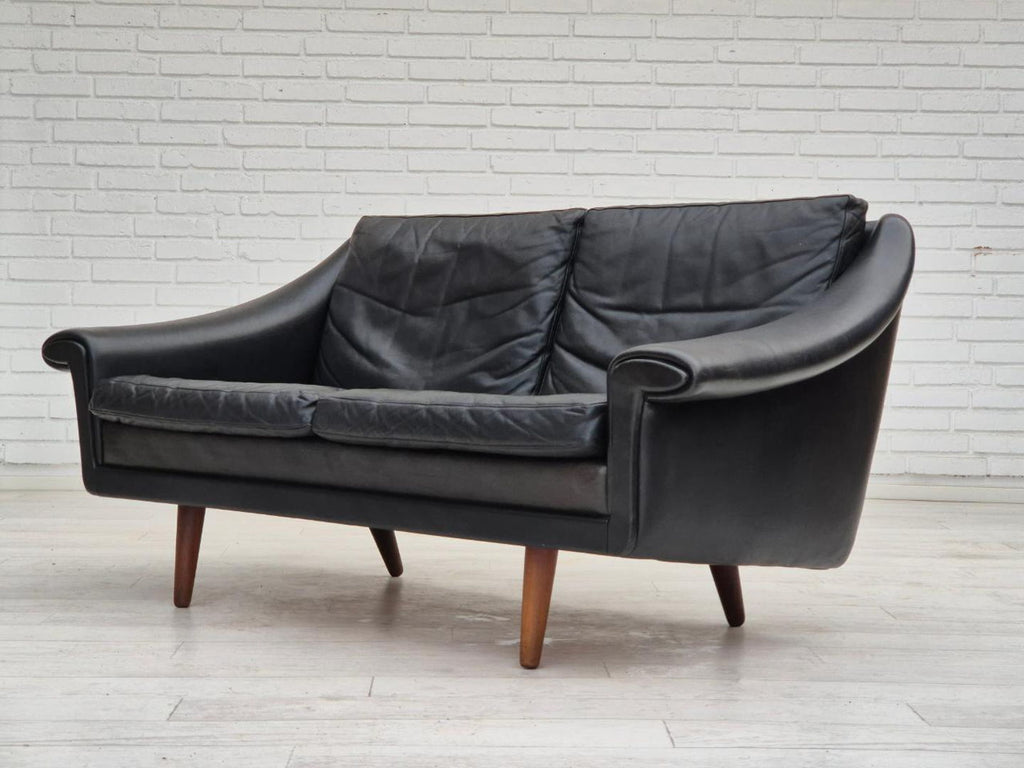1960년대, Aage Christiansen이 Erhardsen & Andersen을 위해 덴마크 디자인, Nykøbing Mors. 2인용 소파 모델 "투우사"는 원래 상태가 매우 양호합니다. 냄새도 얼룩도 없습니다. 가볍고 멋진 녹청이 있는 고급 검정색 가죽. 티크재 다리. 1965~70년대 덴마크 가구 제조업체인 Erhardsen & Andersen에서 제조되었습니다.