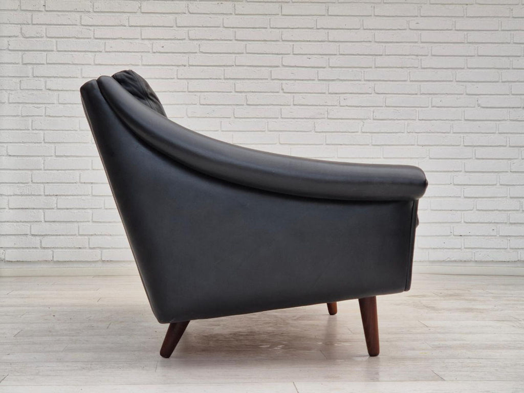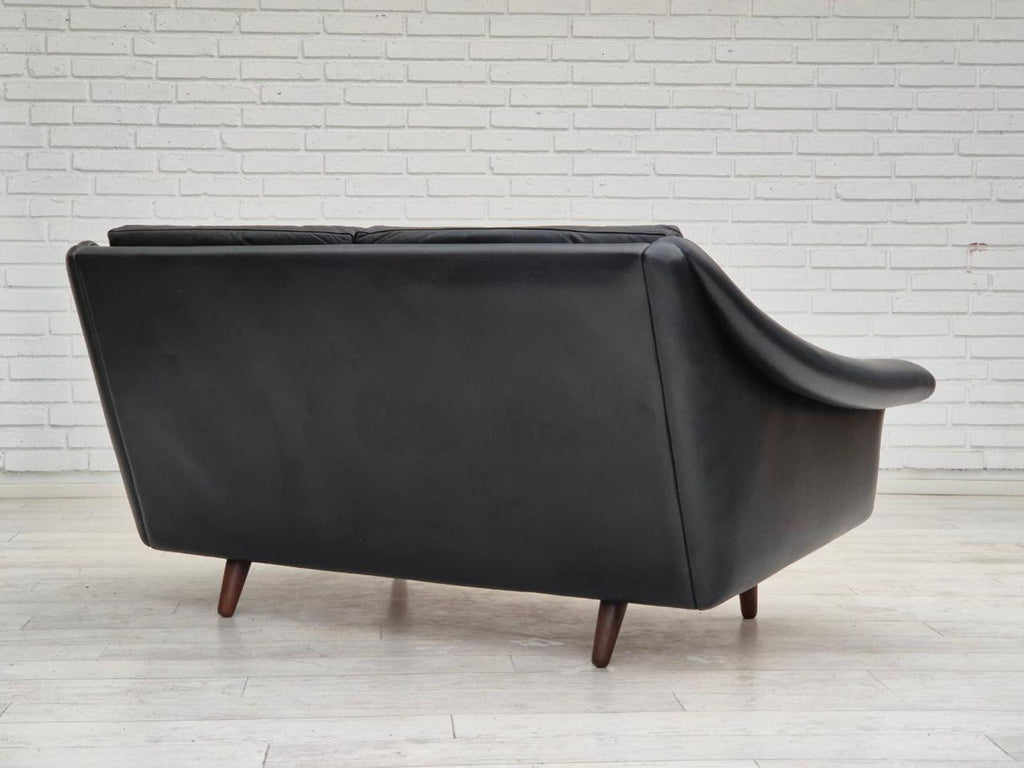 1960s, Danish design by Aage Christiansen for Erhardsen & Andersen, Nykøbing Mors. 2 seater sofa model "Matador" in original very good condition: no smells and no stains. Quality black leather with light nice patina. Teakwood legs. Manufactured by Danish furniture manufacturer Erhardsen & Andersen in about 1965-70s.