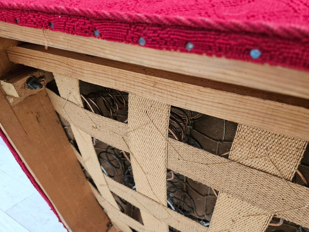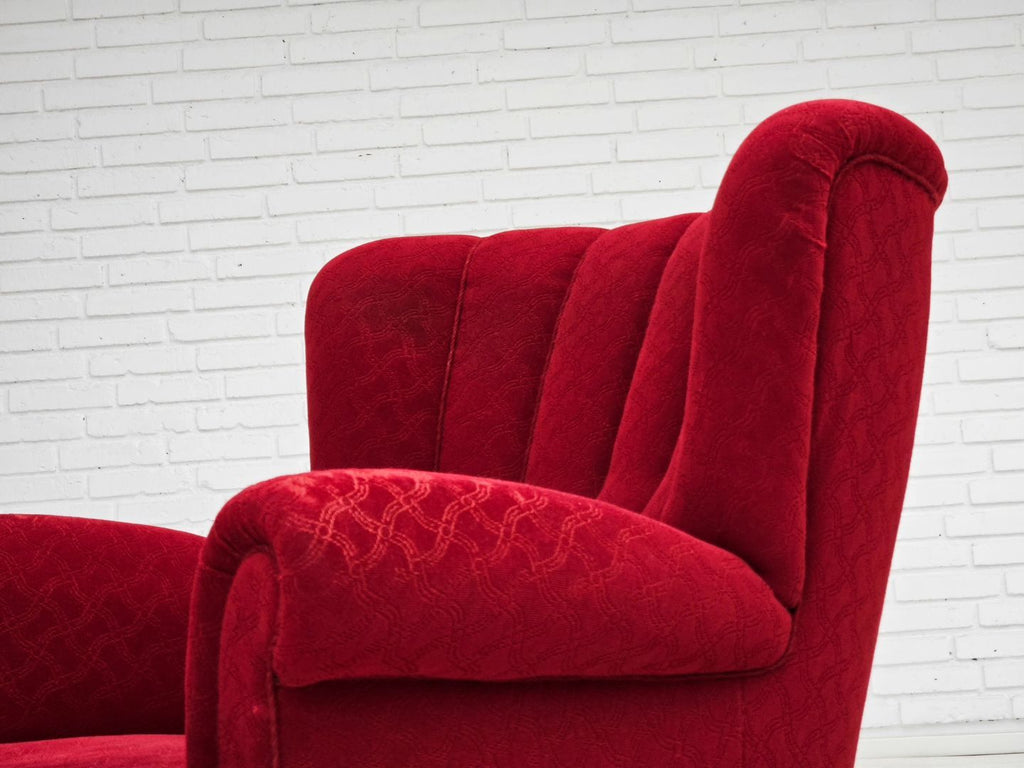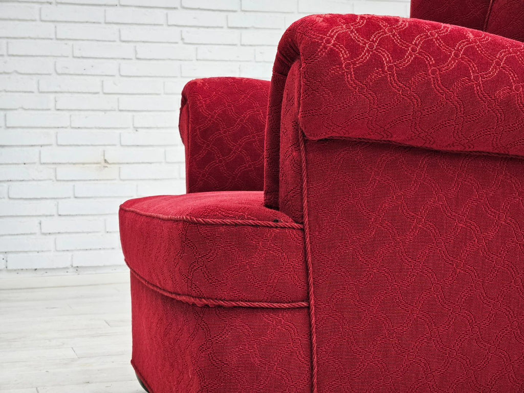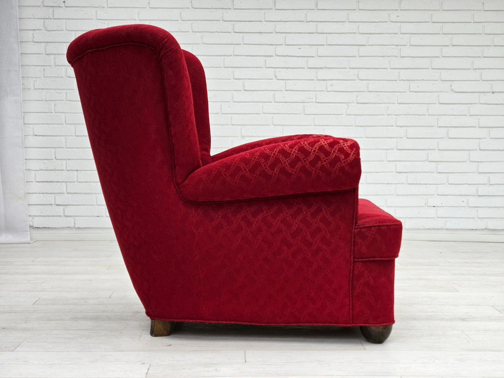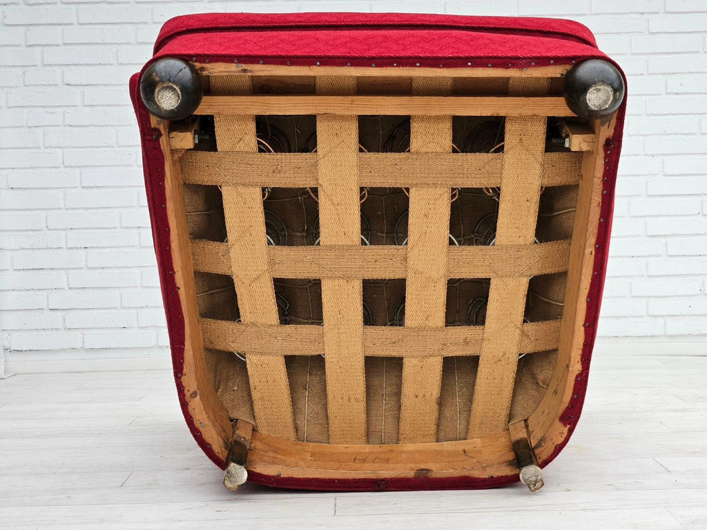 1960년대 덴마크산 릴렉스 체어는 원래 상태가 양호하며 냄새도 얼룩도 없습니다. 오리지널 레드 면/양모 가구 패브릭, 참나무 다리, 좌석의 황동 스프링. 앞좌석 팔걸이의 패브릭 표면이 약간 닳았습니다. 1960년대경 덴마크의 가구 제조업체에서 제조되었습니다.