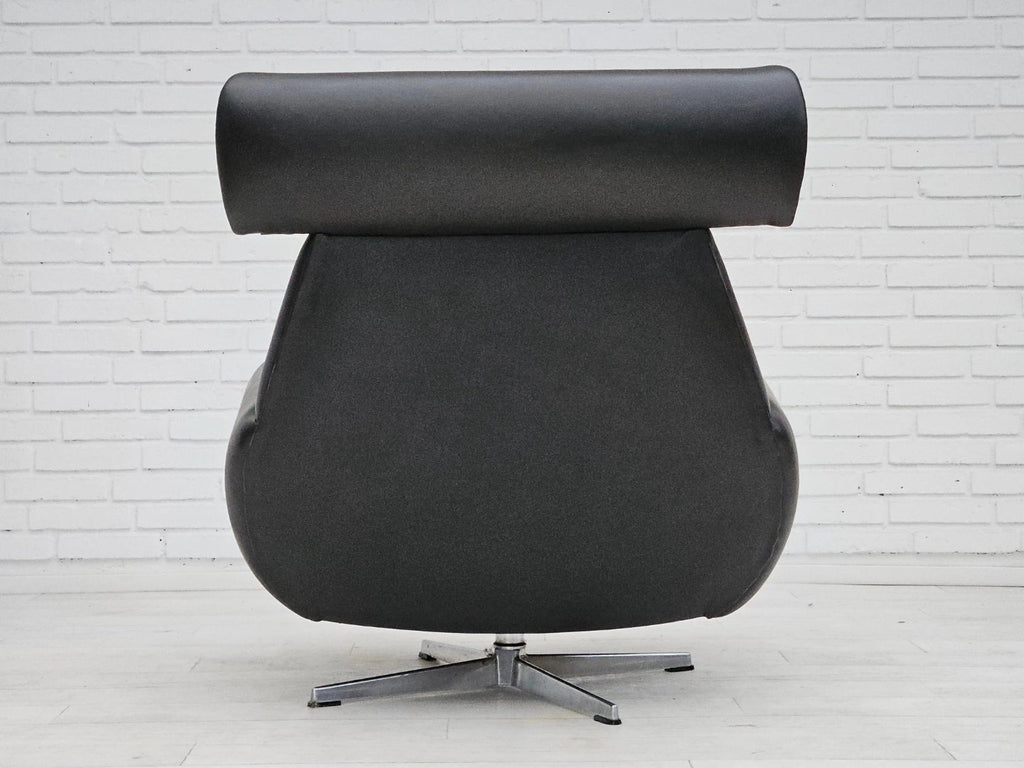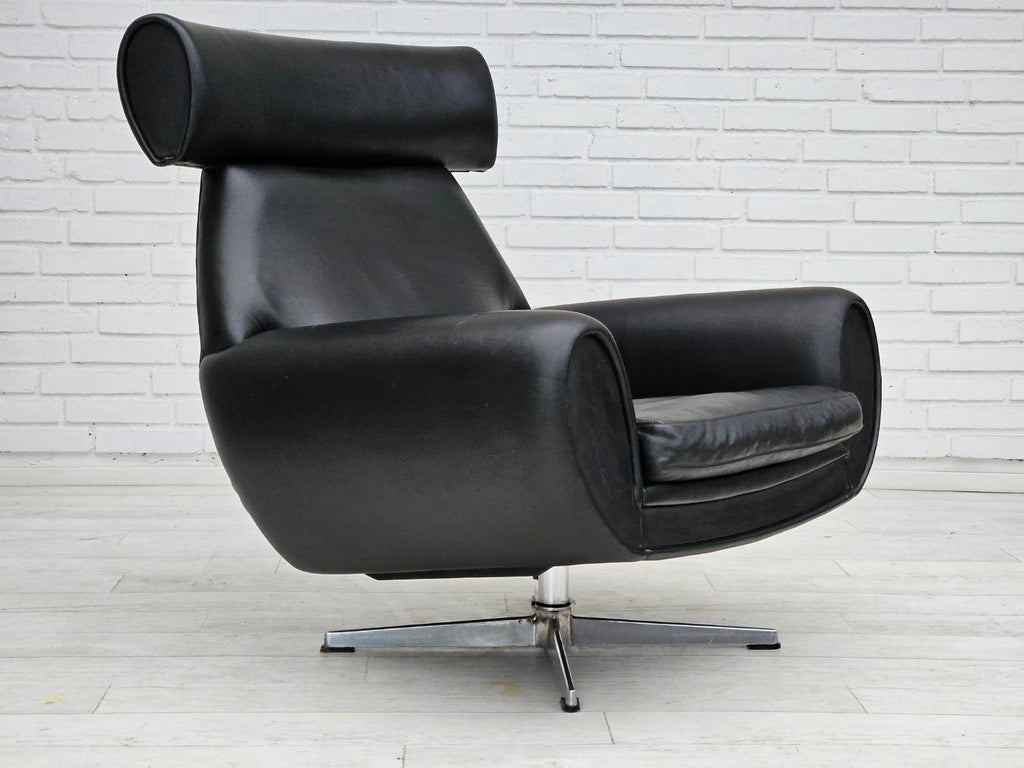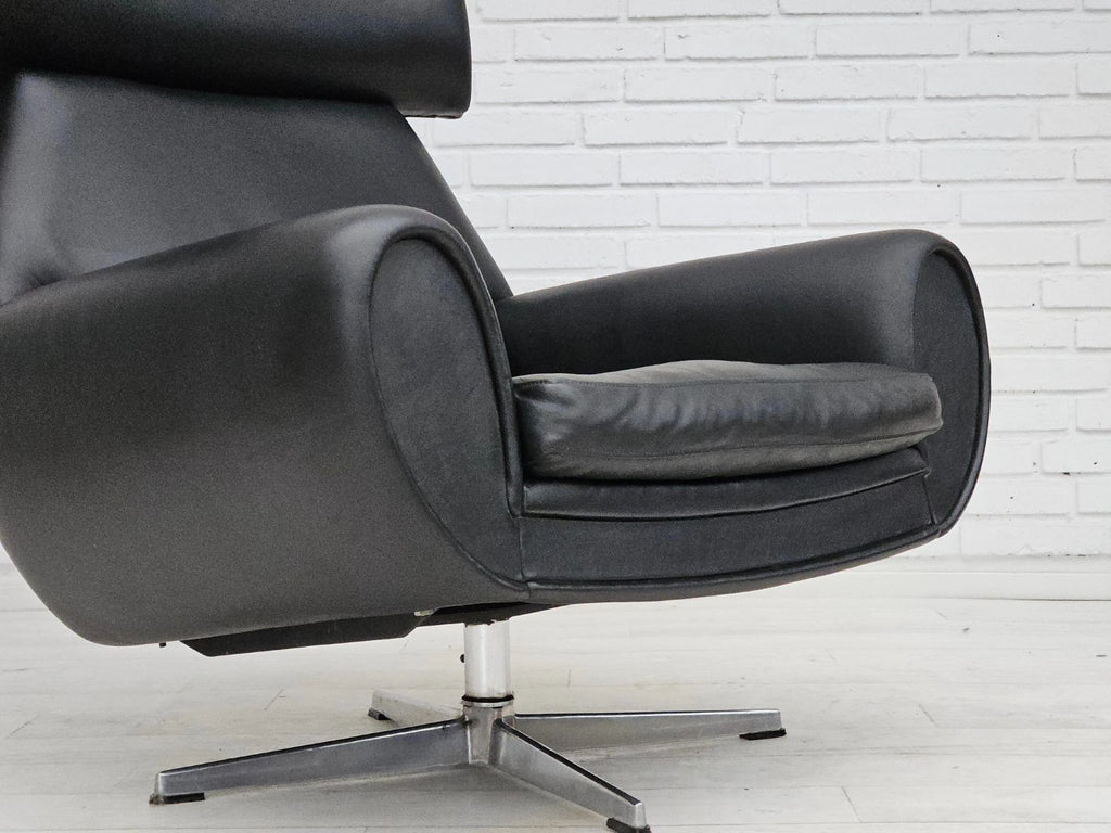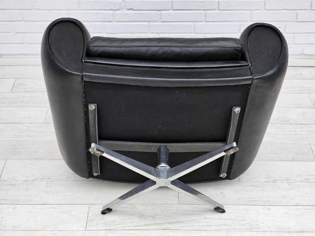 1960s, Danish swivel chair in original very good condition: no smells and no stains. The chair used not too much from the 1960s. Original black leather, cast aluminum base. Manufactured by Danish furniture manufacturer in about 1960-65s.