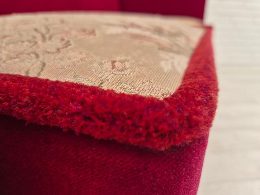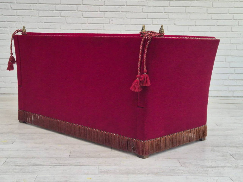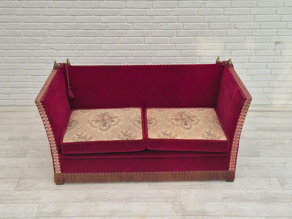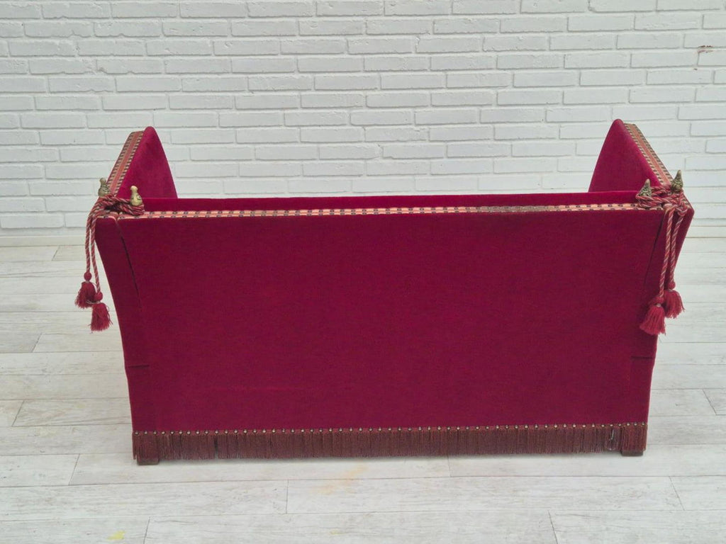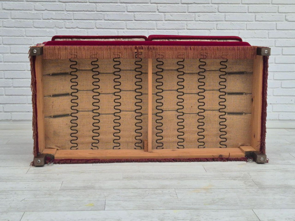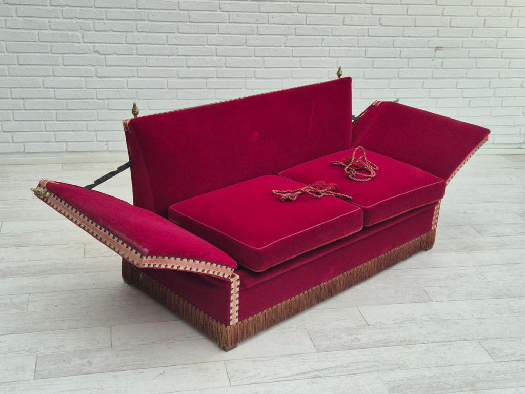 1960년대, 덴마크 "스페인" 드롭 암 소파는 원래 상태가 양호합니다. 냄새도 얼룩도 없습니다. 체리 레드 가구 벨루어, 물푸레나무 다리. 내부에 스프링이 내장된 양면 시트 쿠션입니다. 조절 가능한 팔걸이(등받이 소파 아래 조절 레버). 팔걸이 조절용 장식 코드. 1960~65년대 덴마크 가구 제조업체에서 제조되었습니다.
