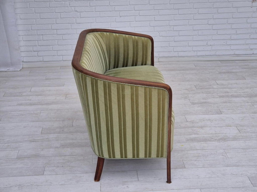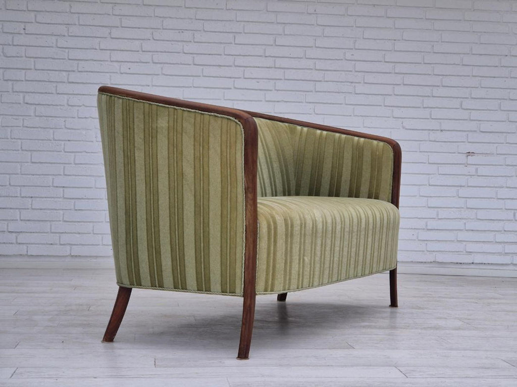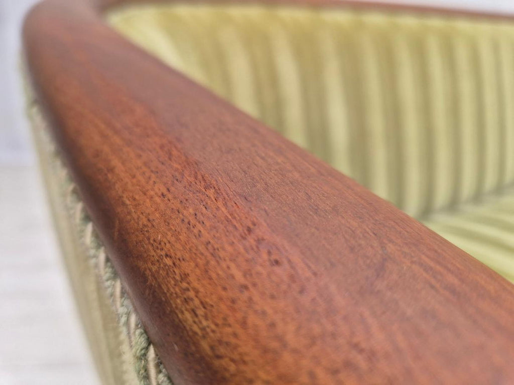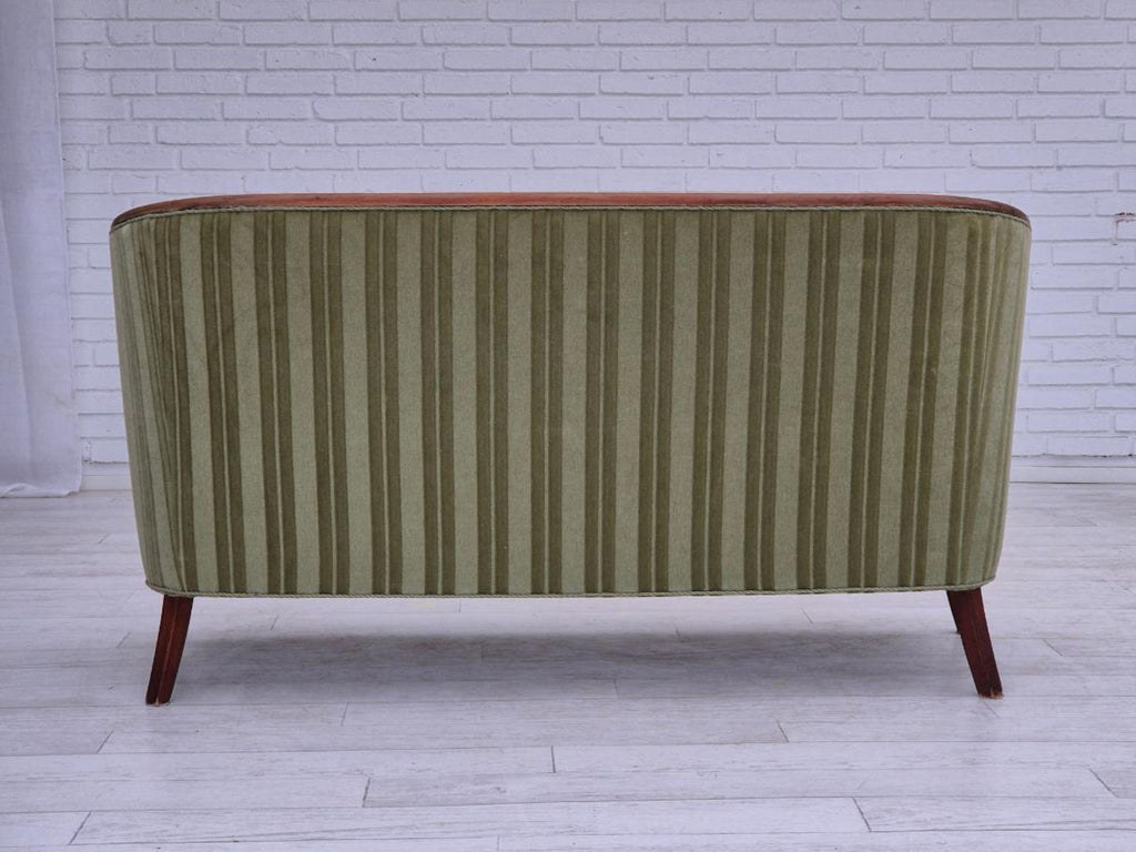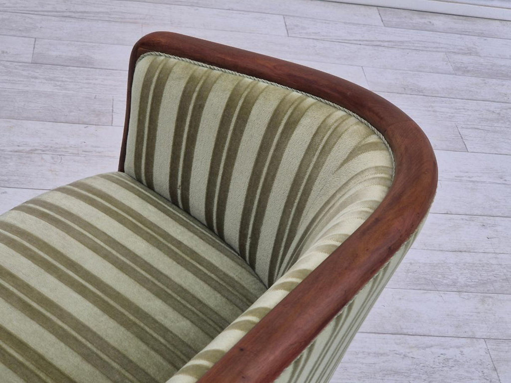 1960년대, 스칸디나비아 2인용 소파. 원래 매우 좋은 상태: 냄새도 없고 얼룩도 없습니다. 오리지널 연녹색 가구 벨루어, 티크재. 좌석에 스프링이 있습니다. 1955~60년대 덴마크 또는 스웨덴 가구 제조업체에서 제조되었습니다.