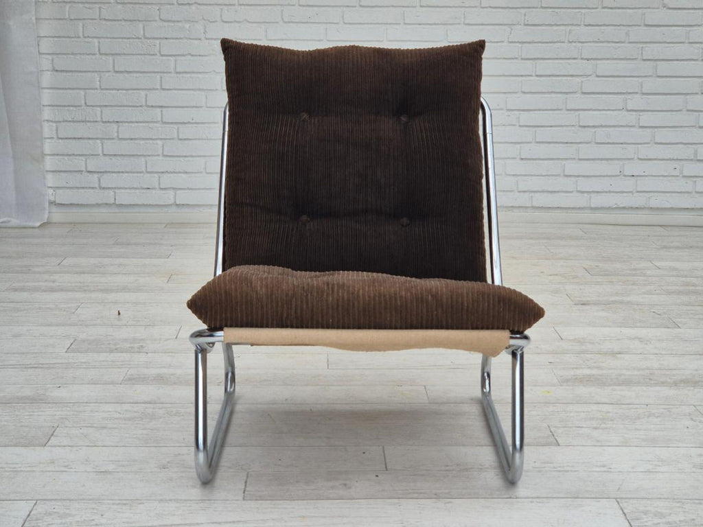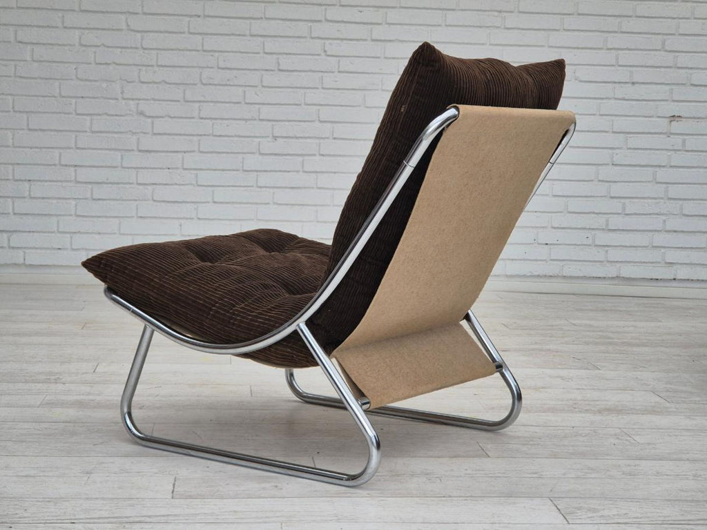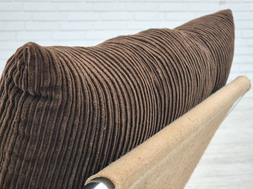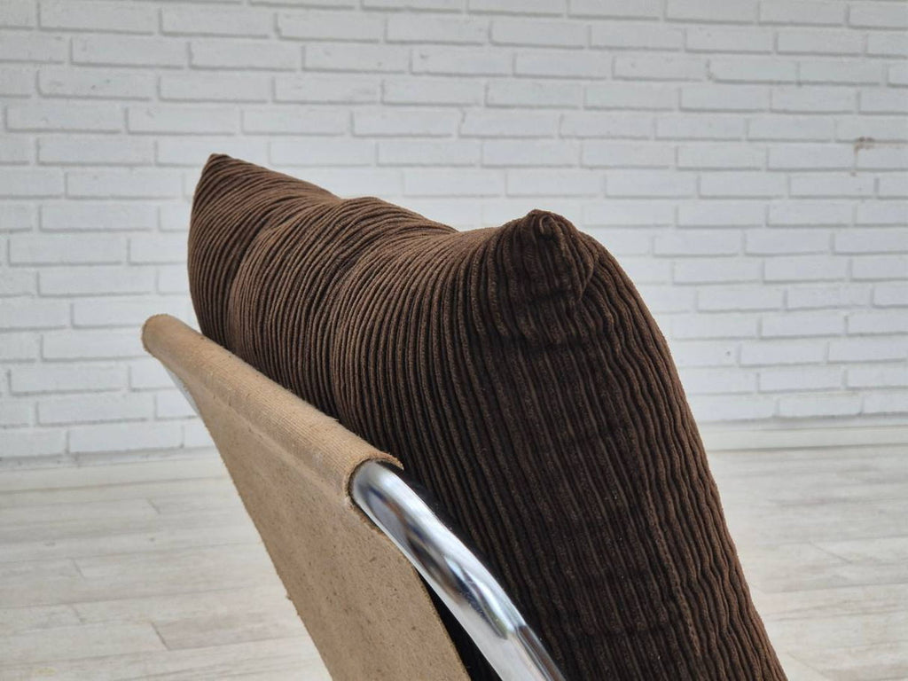 1970년대, 피터 호이트(Peter Hoyte)의 영국 디자인. 원래 상태가 매우 좋은 "슬링" 라운지 의자: 냄새도 얼룩도 없습니다. 브라운 코듀로이, 크롬 스틸, 캔버스. 1970년대쯤 영국에서 제조되었습니다.