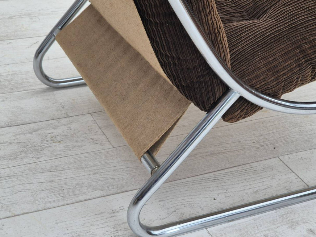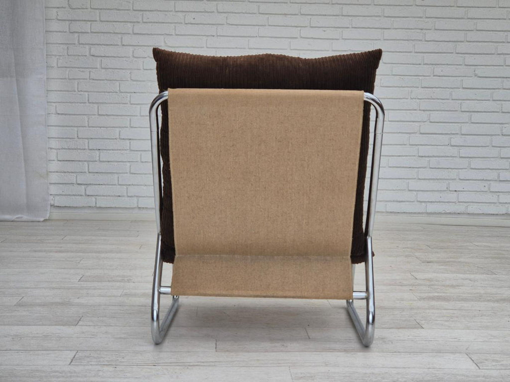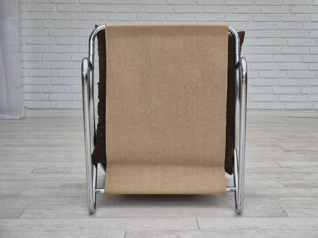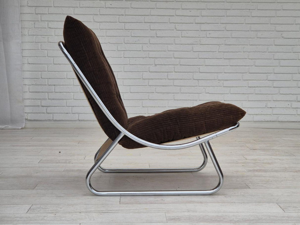 1970년대, 피터 호이트(Peter Hoyte)의 영국 디자인. 원래 상태가 매우 좋은 "슬링" 라운지 의자: 냄새도 얼룩도 없습니다. 브라운 코듀로이, 크롬 스틸, 캔버스. 1970년대쯤 영국에서 제조되었습니다.