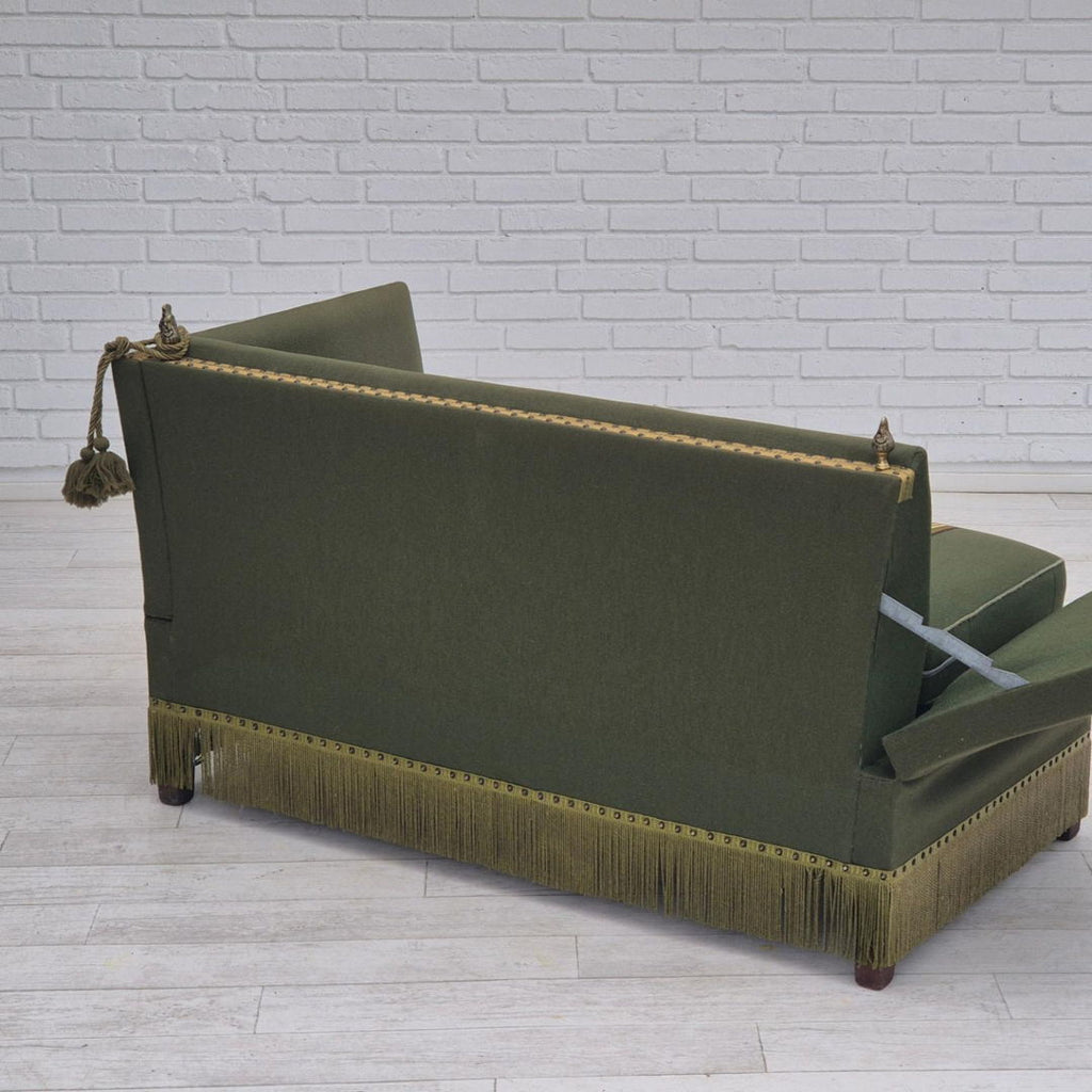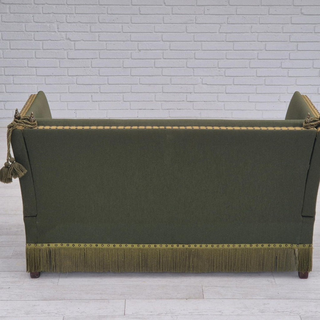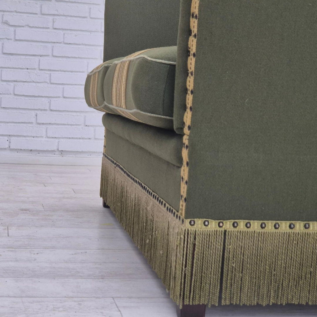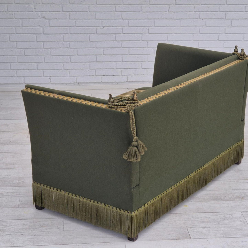 1970s, Danish 2 seater drop arm sofa in original very good condition: no smells and no stains. Green furniture wool, beech wood legs Adjustable armrests (adjustment lever under the back sofa). Decorative cords for adjusting armrests. Manufactured by Danish furniture manufacturer in about 1965-70s.