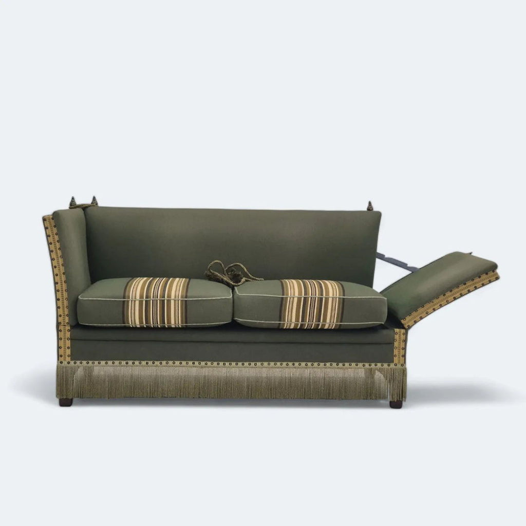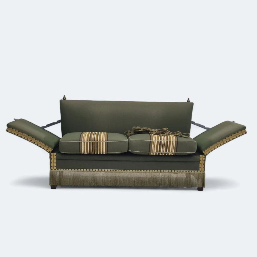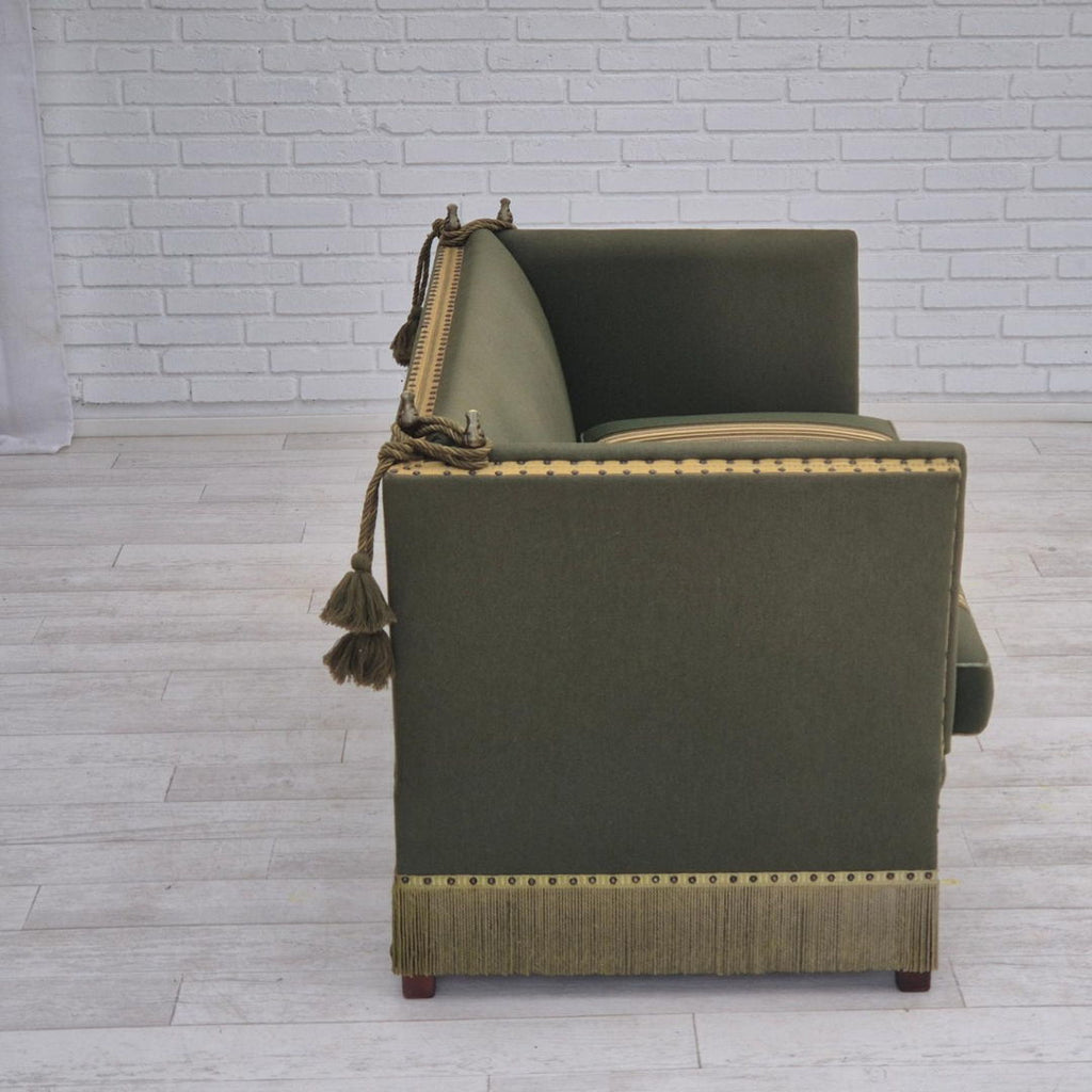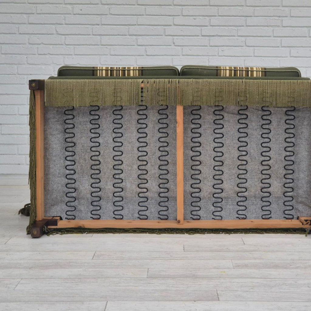 1970s, Danish 2 seater drop arm sofa in original very good condition: no smells and no stains. Green furniture wool, beech wood legs Adjustable armrests (adjustment lever under the back sofa). Decorative cords for adjusting armrests. Manufactured by Danish furniture manufacturer in about 1965-70s.