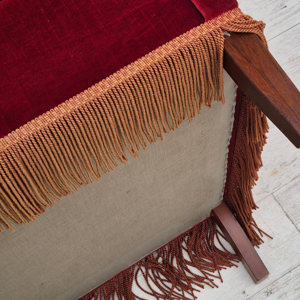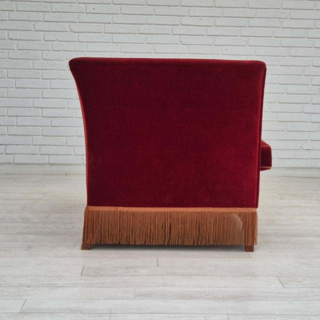 1970년대, 덴마크산 2인용 소파 오리지널 상태 매우 좋음: 냄새도 없고, 얼룩도 없고, 구조가 안정적입니다. 빨간색 가구 벨루어, 물푸레나무 다리, 시트 쿠션의 스프링. 1970년대 덴마크 가구 제조사가 제조한 제품입니다.
