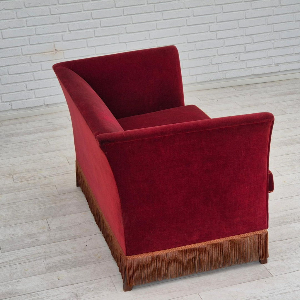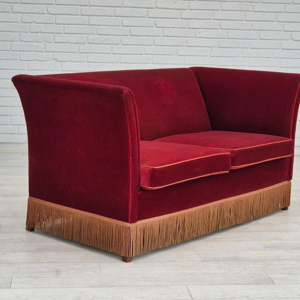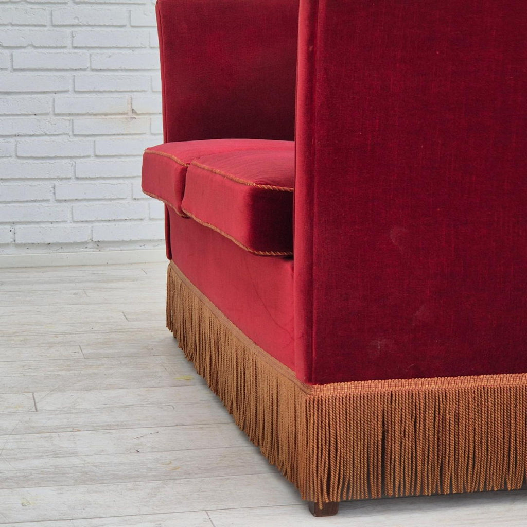 1970s, Danish 2 seater sofa in original very good condition: no smells, no stains, stable construction. Red furniture velour, ash wood legs, springs in the seat cushions. Manufactured by Danish furniture maker in about 1970s.