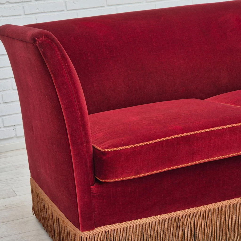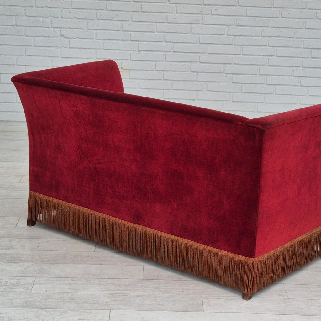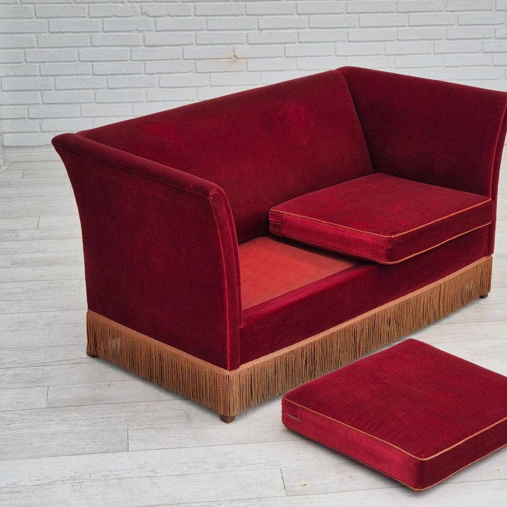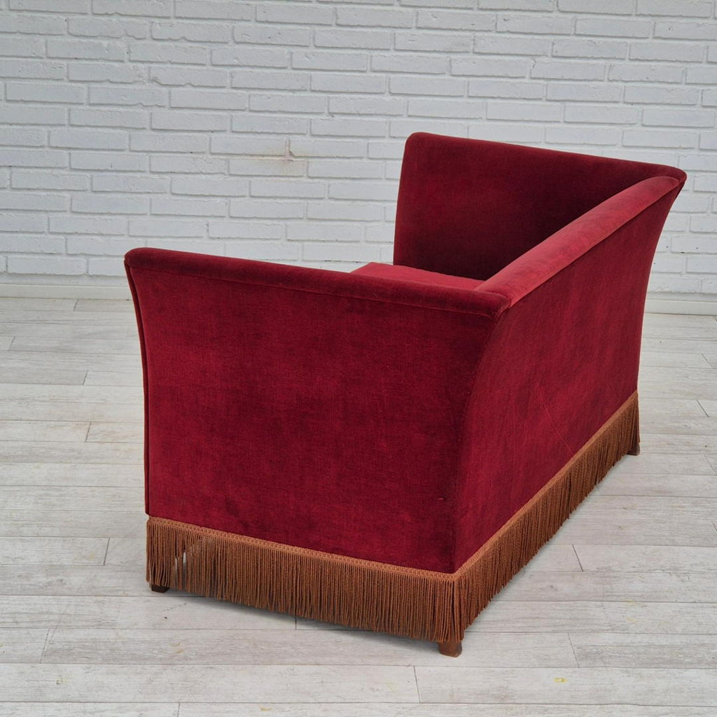 1970s, Danish 2 seater sofa in original very good condition: no smells, no stains, stable construction. Red furniture velour, ash wood legs, springs in the seat cushions. Manufactured by Danish furniture maker in about 1970s.