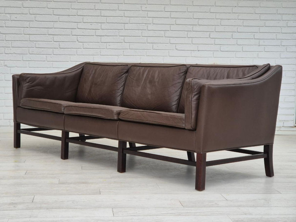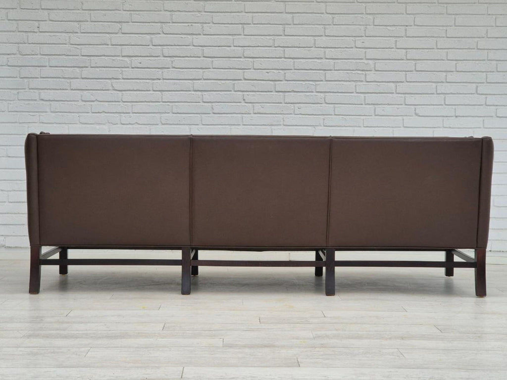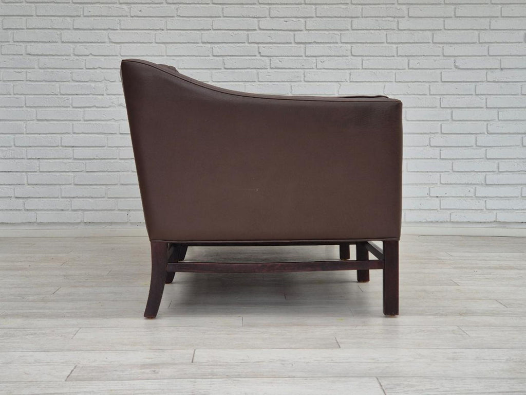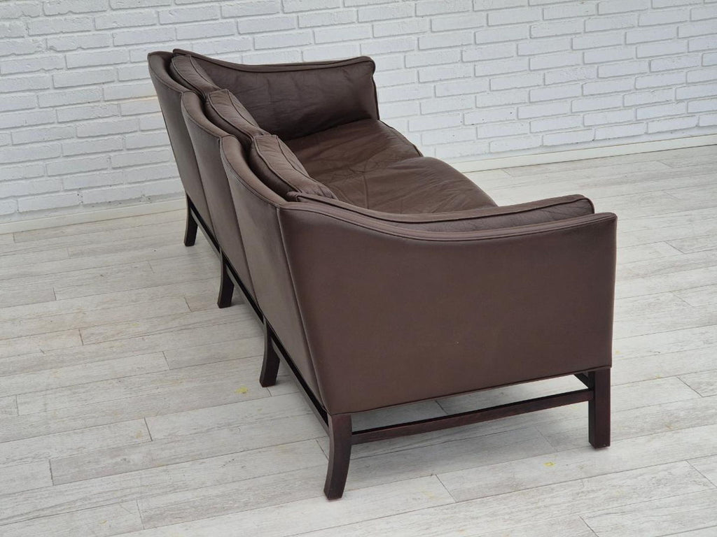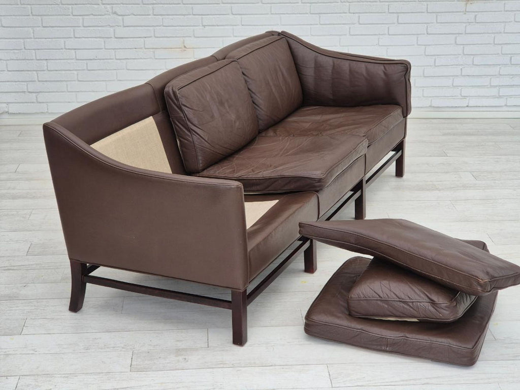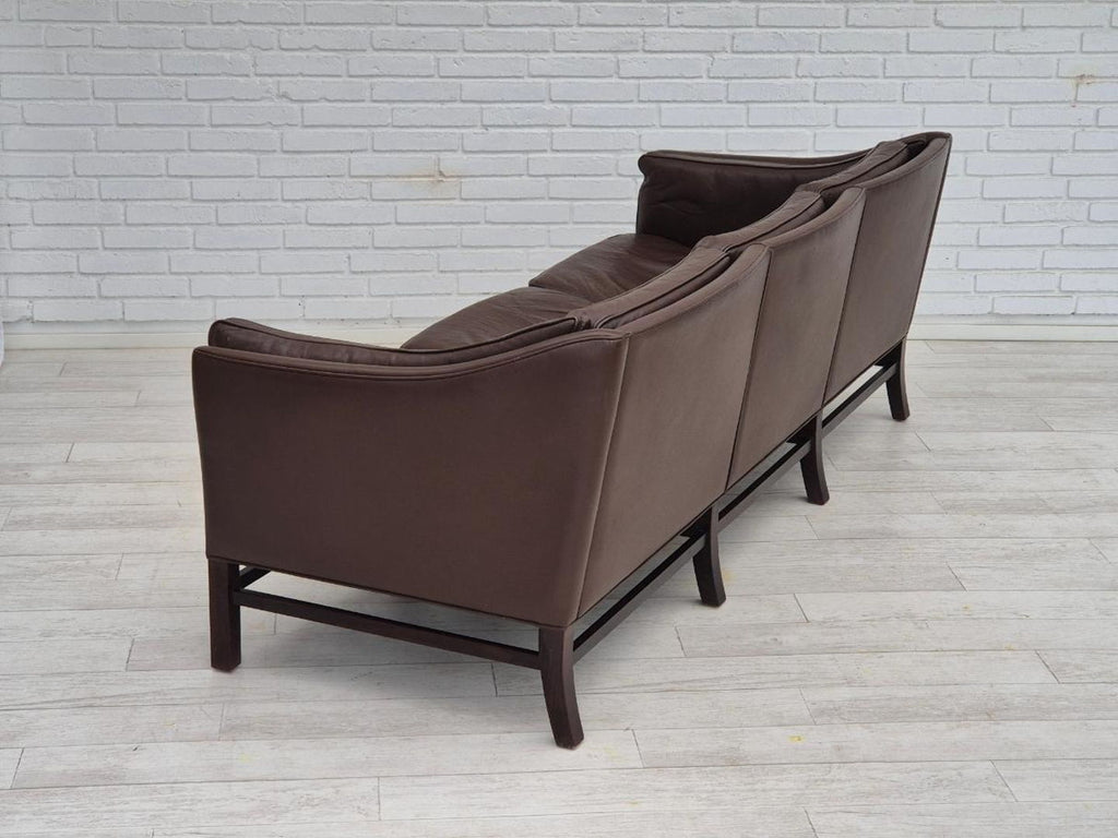 1970년대, Grant Møbelfabrik을 위해 Georg Thams가 디자인한 덴마크 디자인. 원래 상태가 매우 좋은 3인용 소파: 냄새도 얼룩도 없습니다. 오리지널 브라운 가죽, 너도밤나무 다리. 1970~75년대 덴마크 가구 제조업체인 Grant Møbelfabrik이 제조했습니다.
