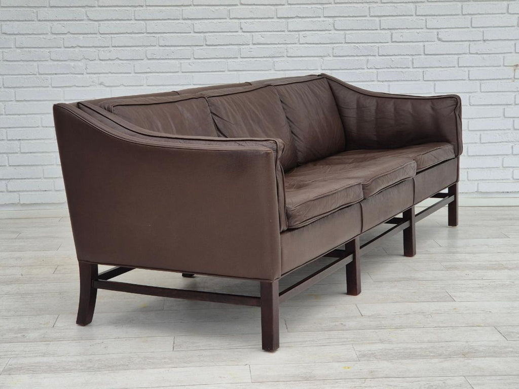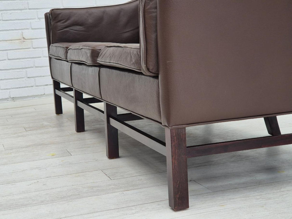 1970s, Danish design by Georg Thams for Grant Møbelfabrik. 3 seater sofa in original very good condition: no smells and no stains. Original brown leather, beech wood legs. Manufactured by Danish furniture manufacturer Grant Møbelfabrik in about 1970-75s.