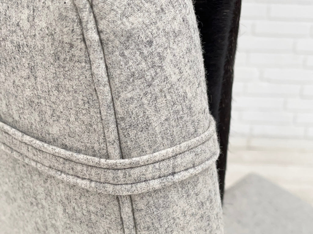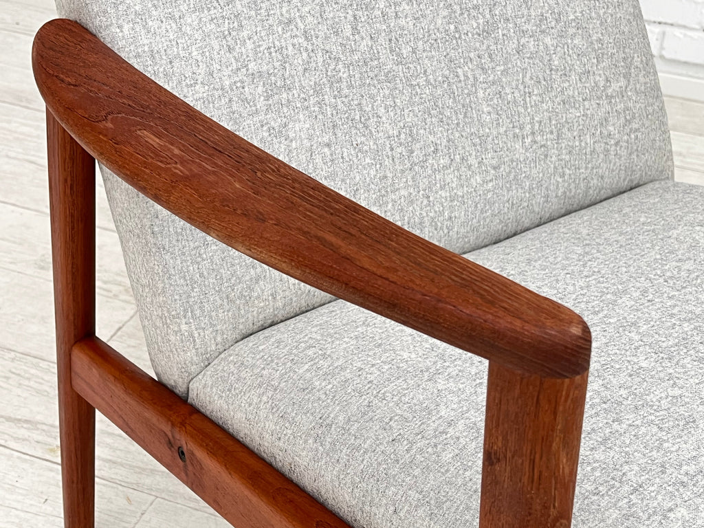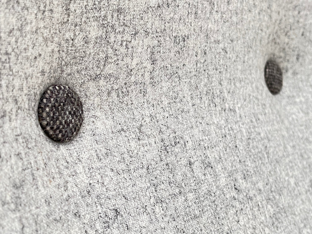 천연 코코넛 매트를 사용, 고급 밝은 회색 실내 장식 패브릭으로 덮개를 씌웠습니다. 천연소가죽의 새로운 목베개. 티크 팔걸이. 가구 울 패브릭의 회색 버튼.