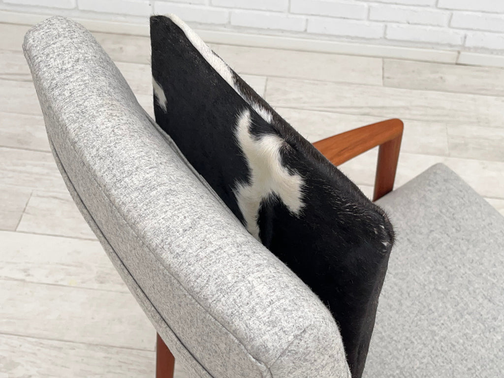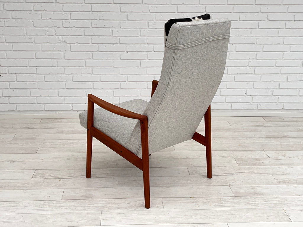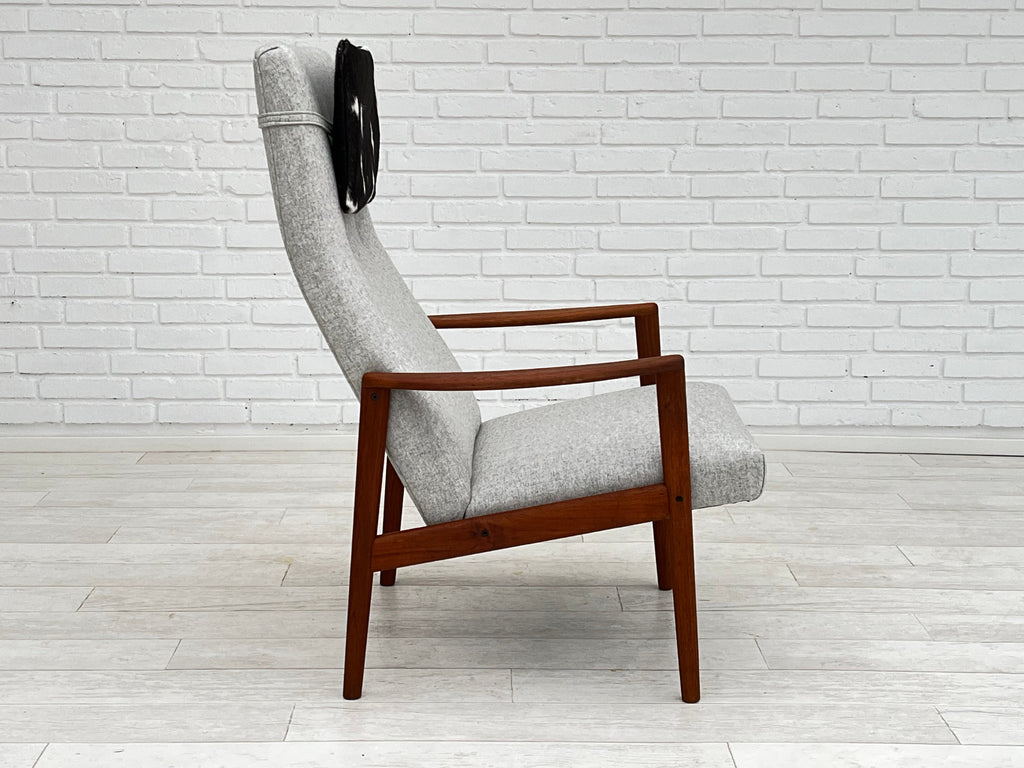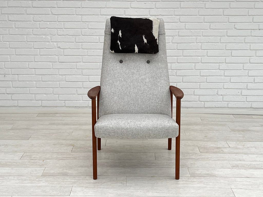 1970s, Danish high-backed armchair, teak, fabric, cowskind