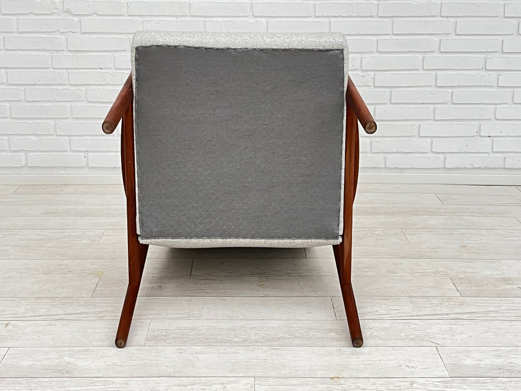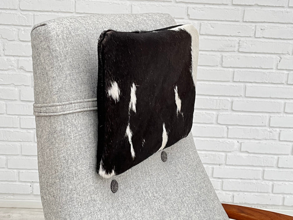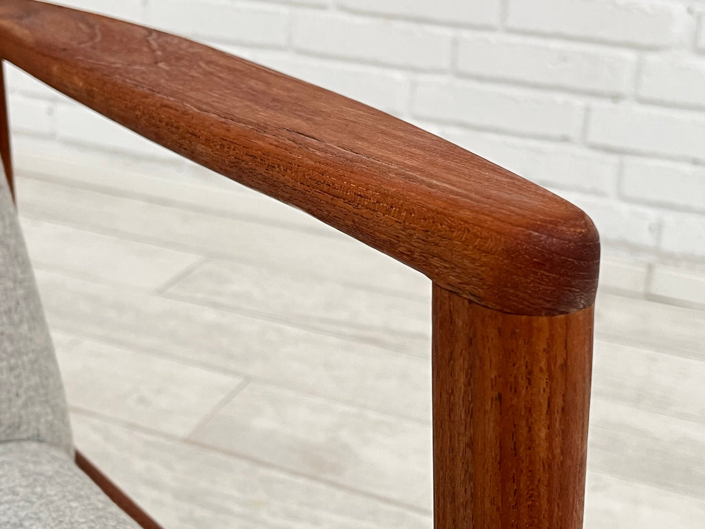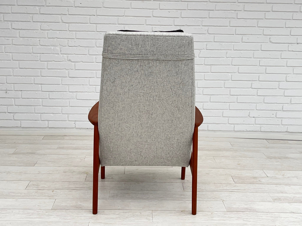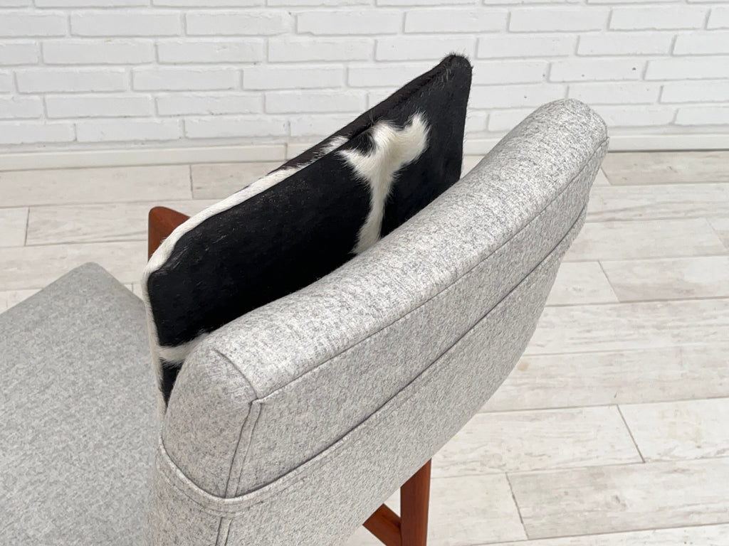 1970s, Danish high-backed armchair, teak, fabric, cowskind