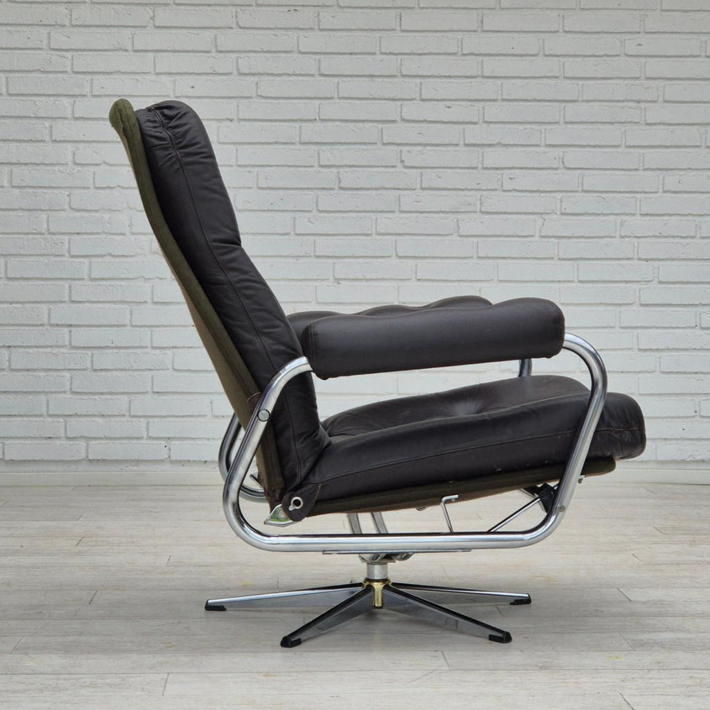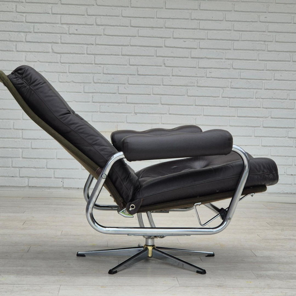 1970년대, 원래 상태가 좋은 덴마크 회전의자: 냄새도 얼룩도 없습니다. 등받이가 있는 조절 가능한 좌석. 브라운 가죽, 크롬 스틸, 캔버스. 1970~75년경 덴마크 가구 제조업체에서 제조되었습니다.