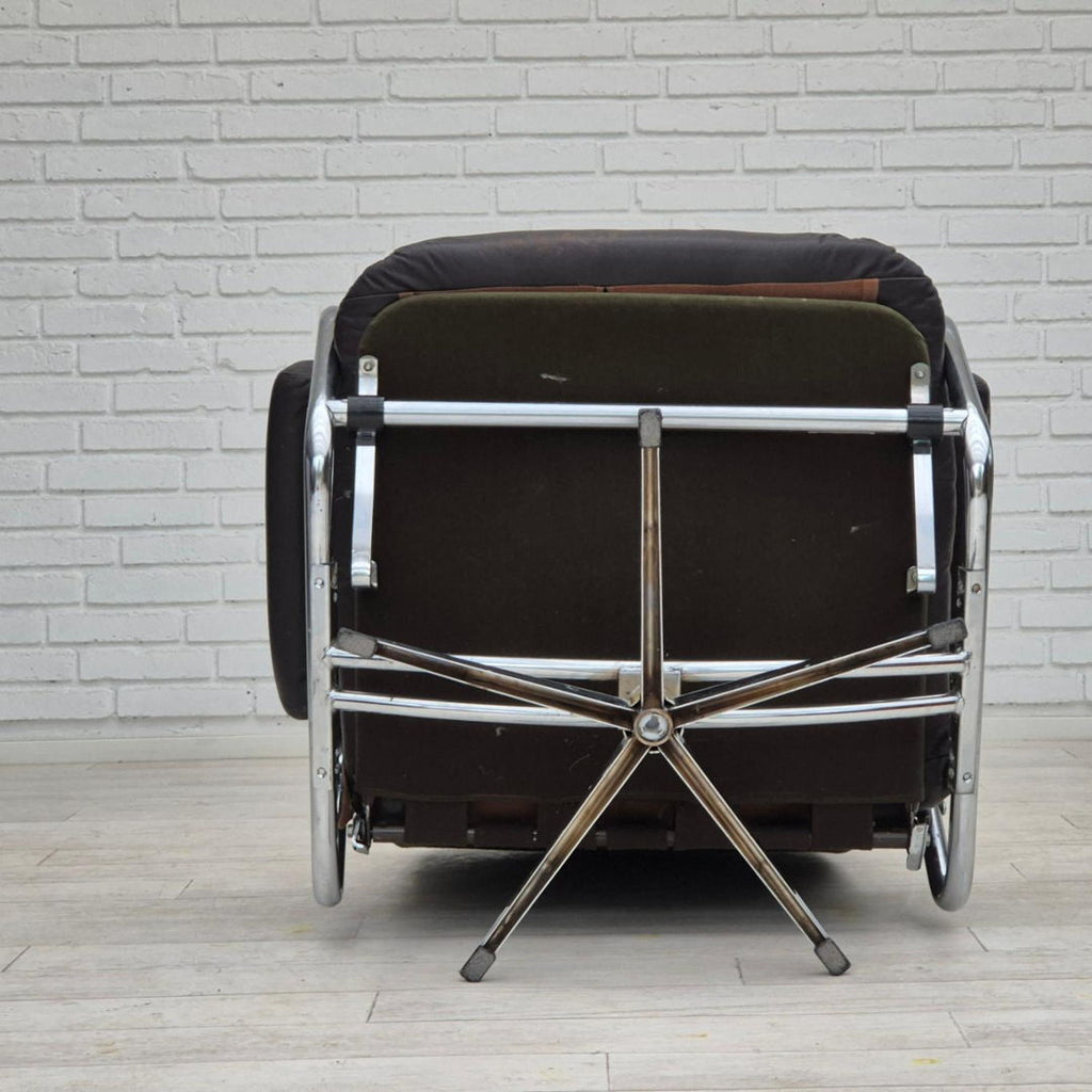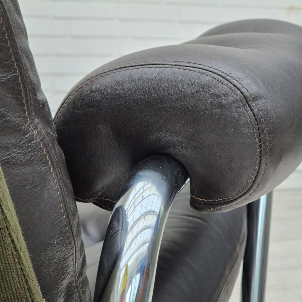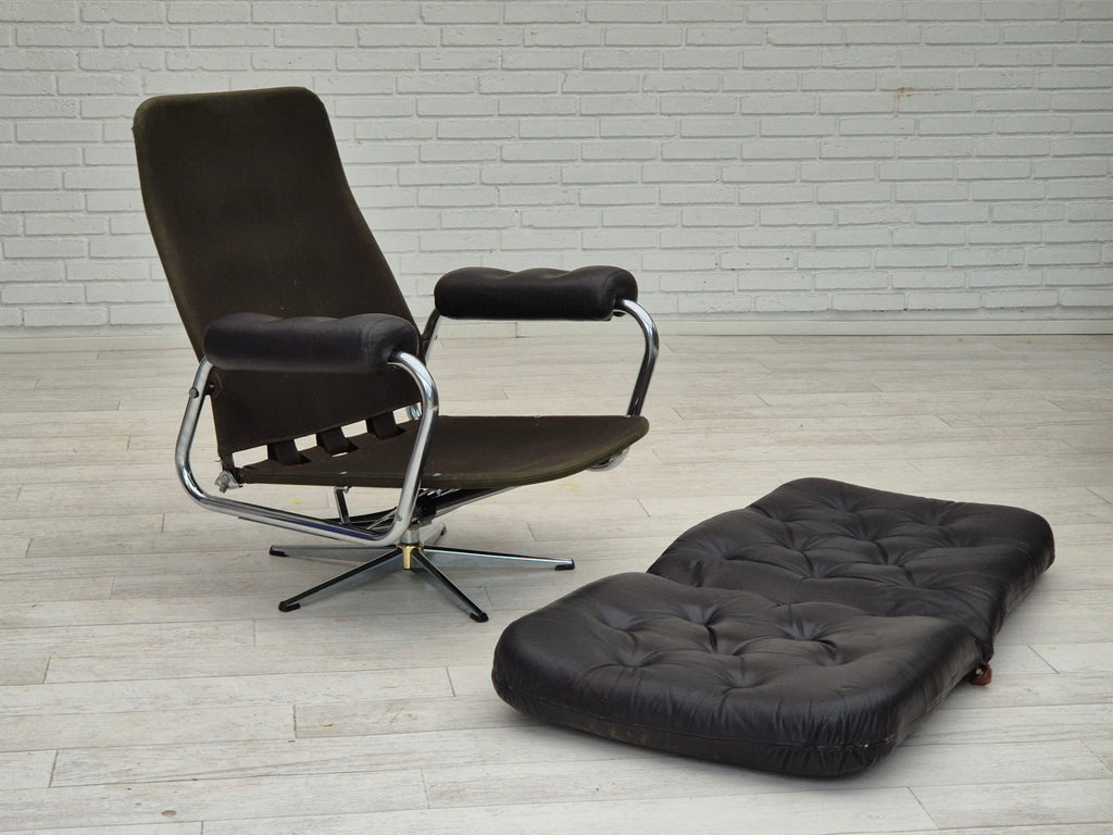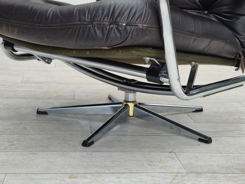 1970s, Danish swivel chair in original good condition: no smells and no stains. Adjustable seat with backrest. Brown leather, chrome steel, canvas. Manufactured by Danish furniture maker in about 1970-75.