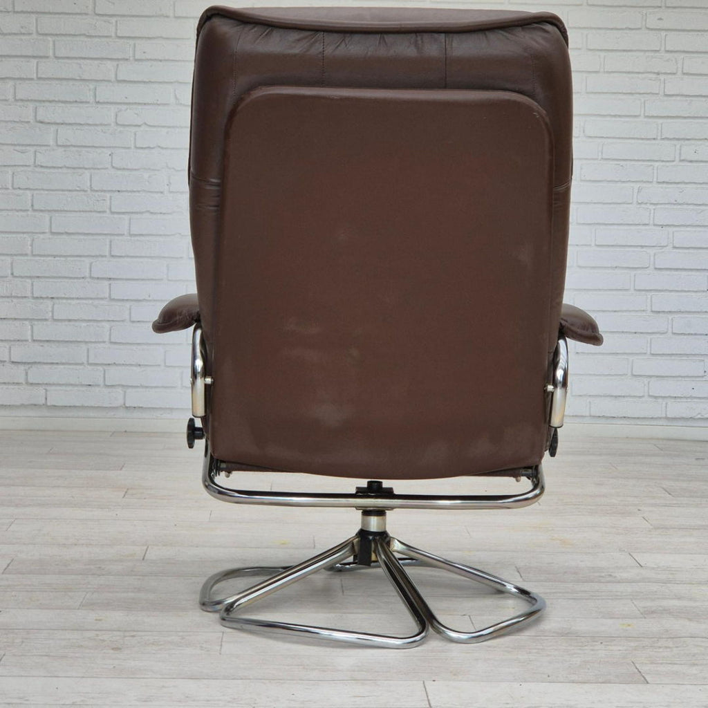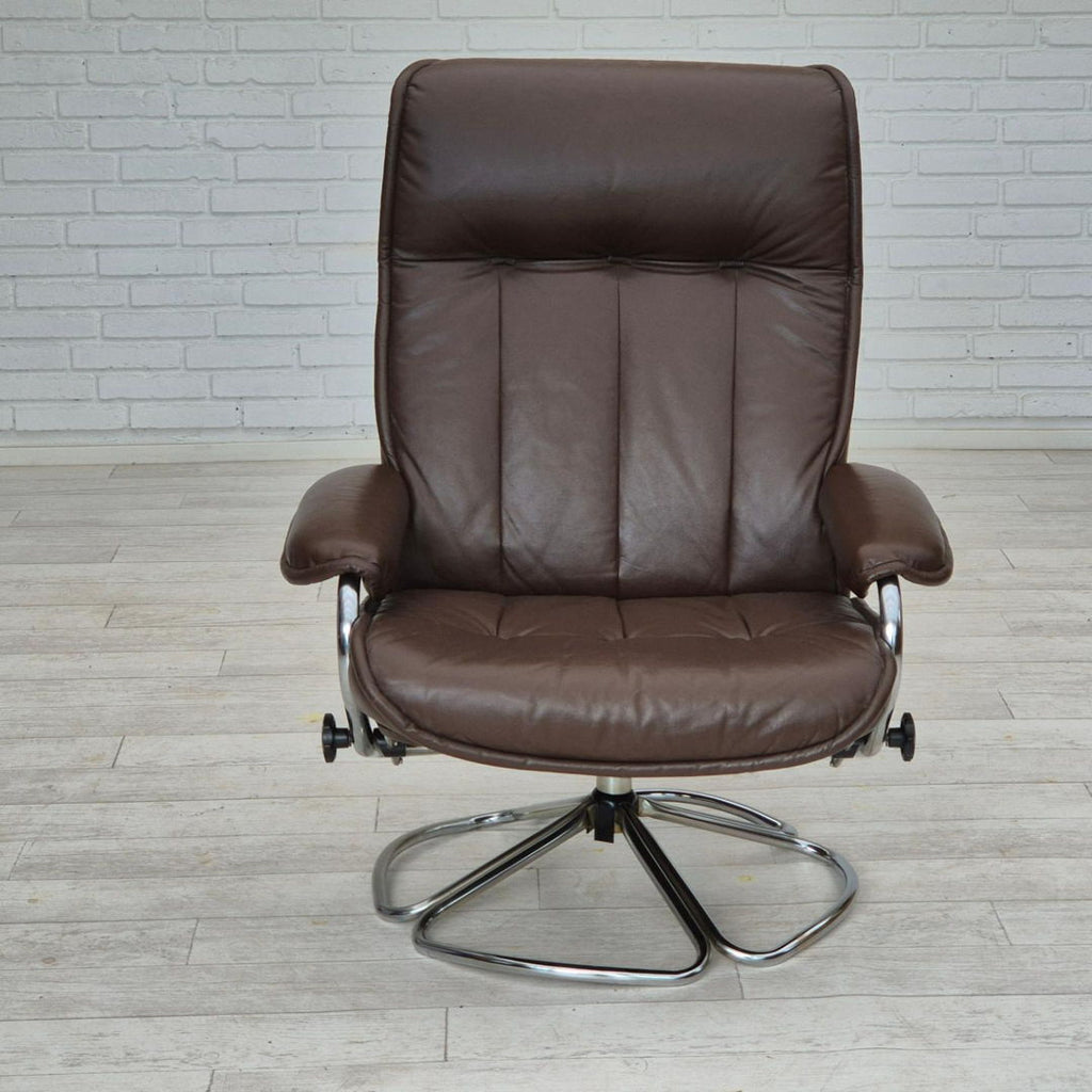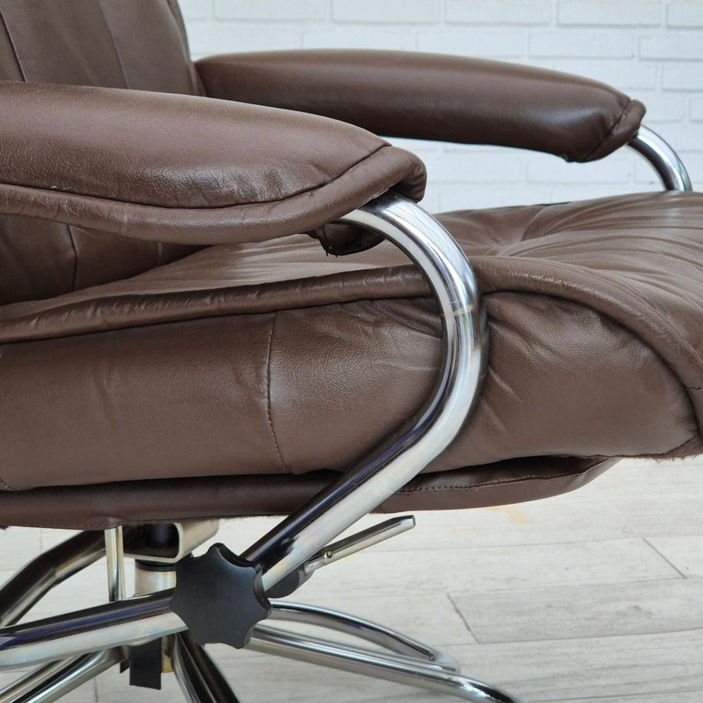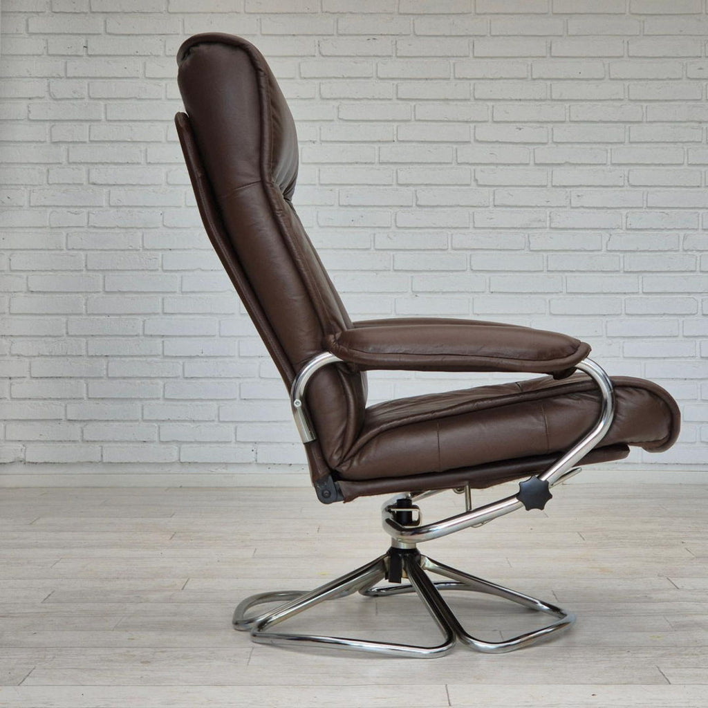 1970년대, 원래 상태가 매우 좋은 스칸디나비아 회전 의자: 냄새도 얼룩도 없습니다. 브라운 가죽, 크롬 스틸. 조절 가능한 좌석/등받이. 70년대 후반 노르웨이 또는 덴마크 가구 제조업체에서 제조되었습니다.