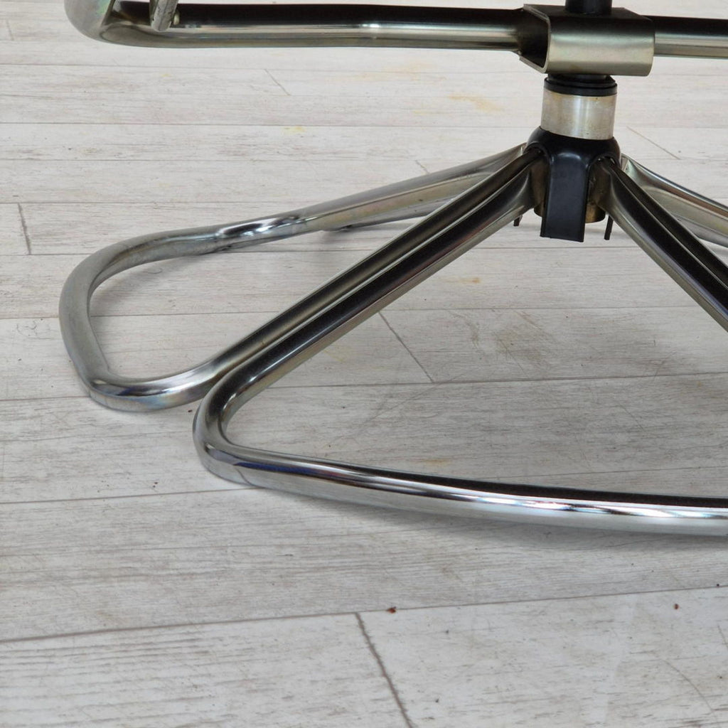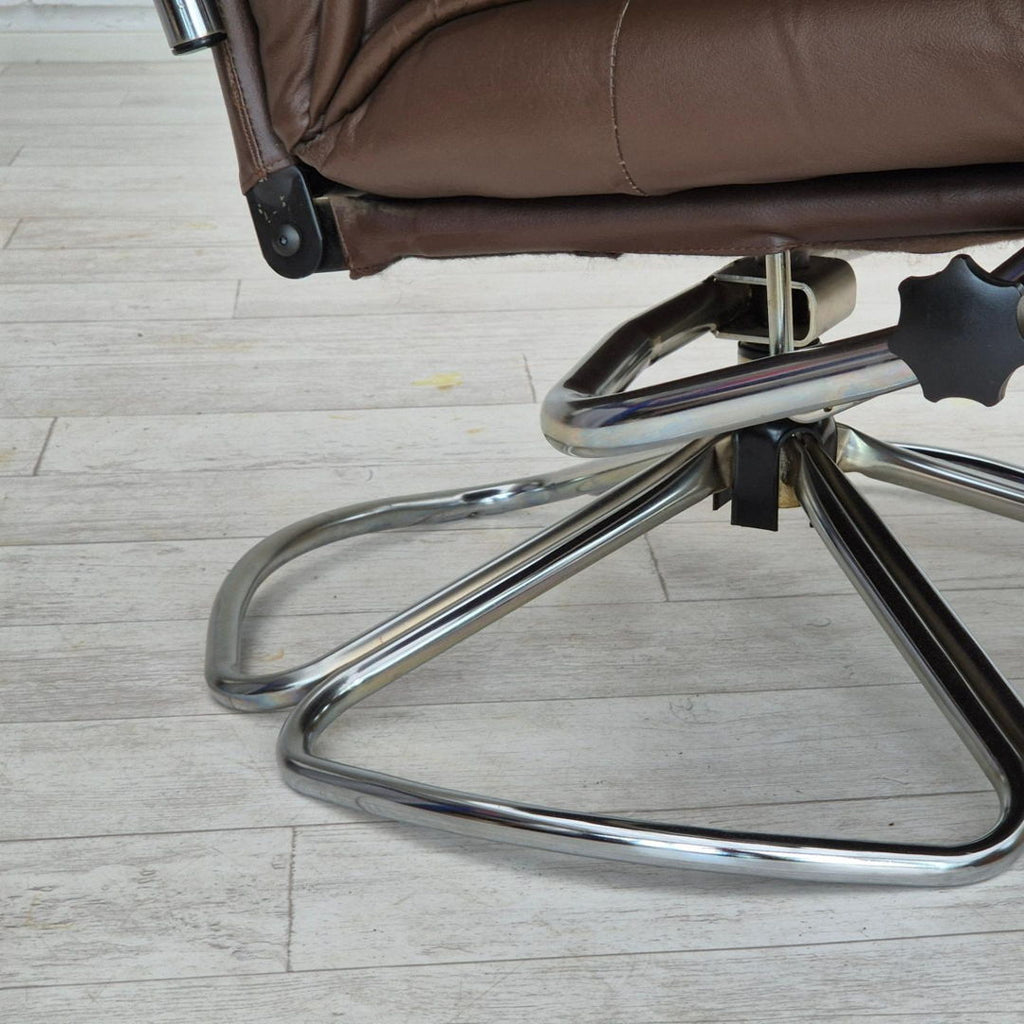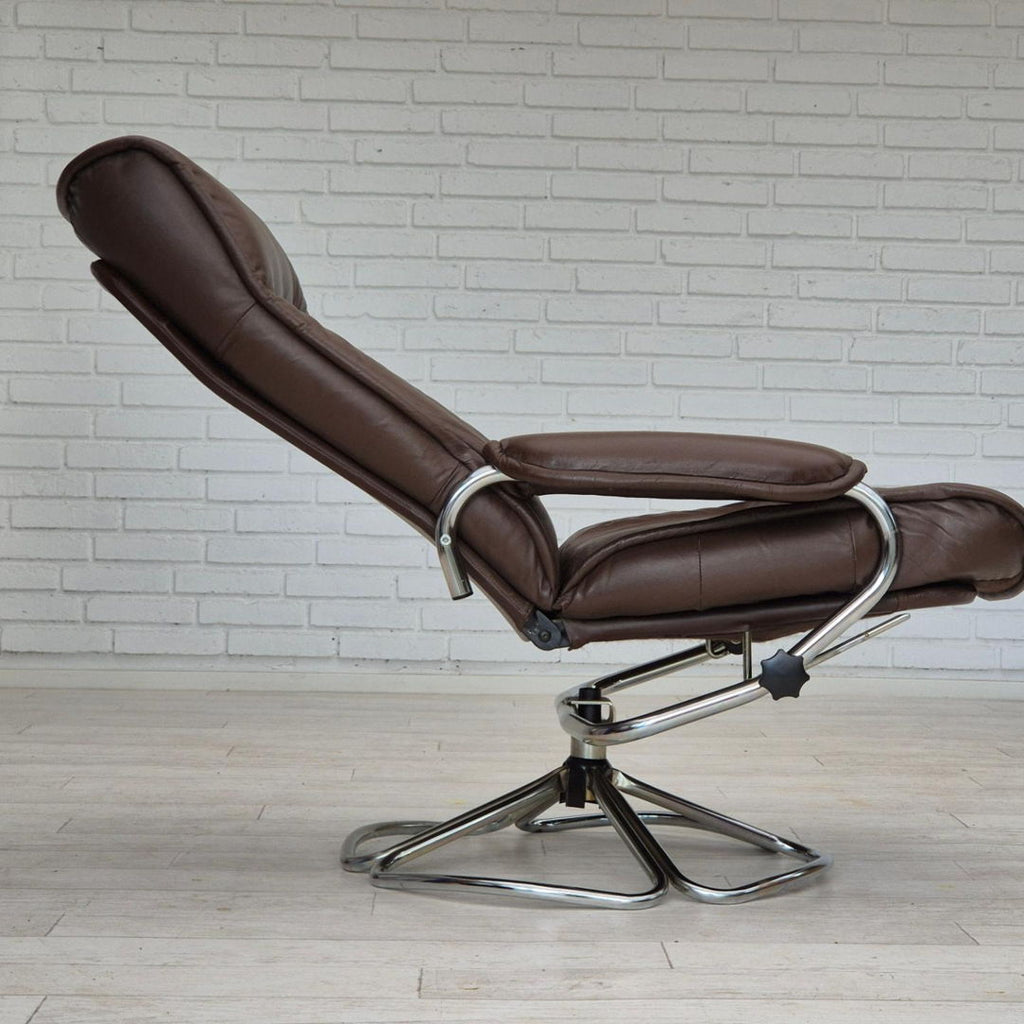 1970s, Scandinavian swivel chair in original very good condition: no smells and no stains. Brown leather, chrome steel. Adjustable seat/back. Manufactured by Norwegian or Danish furniture manufacturer in the late 70s.