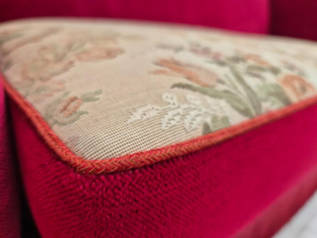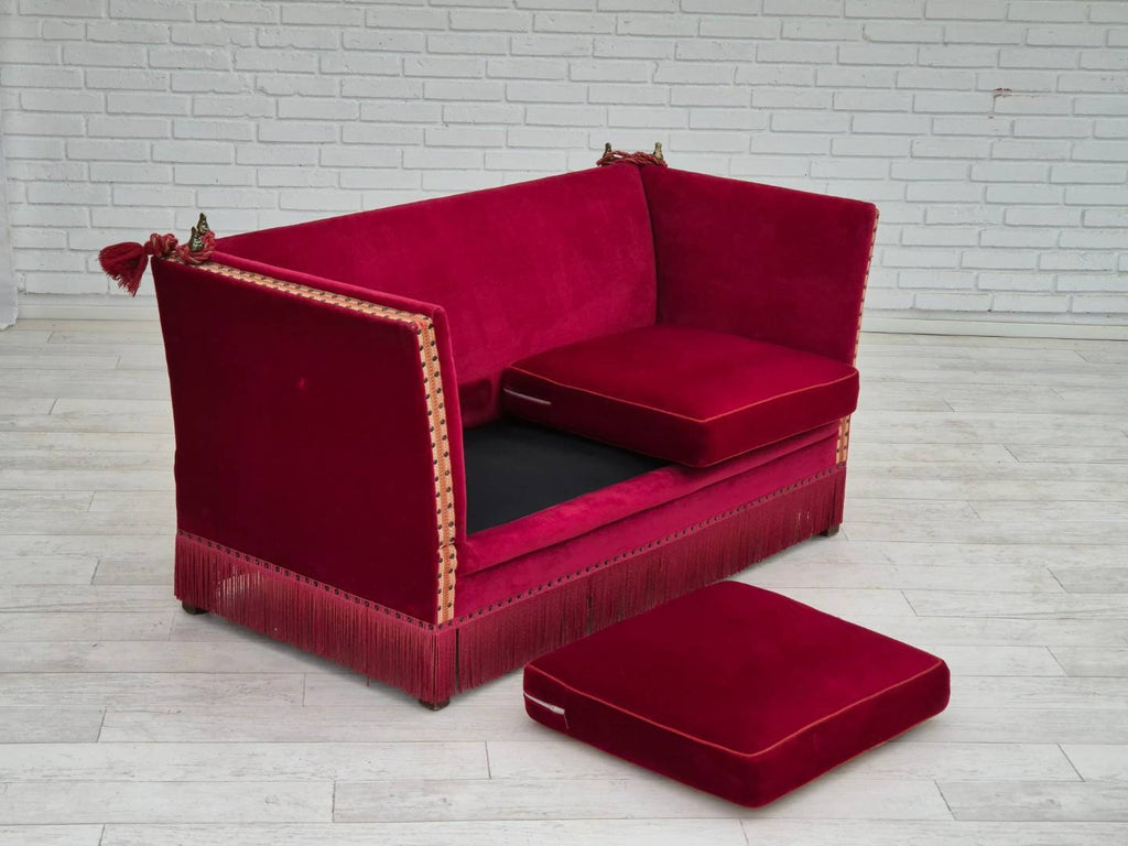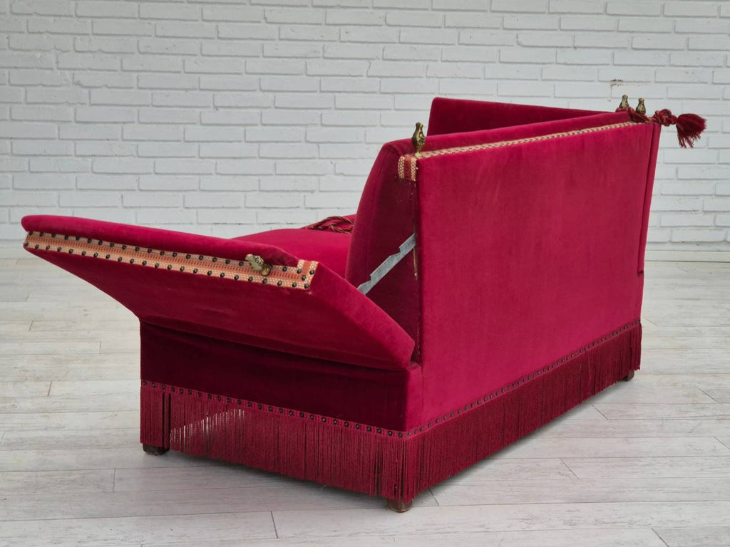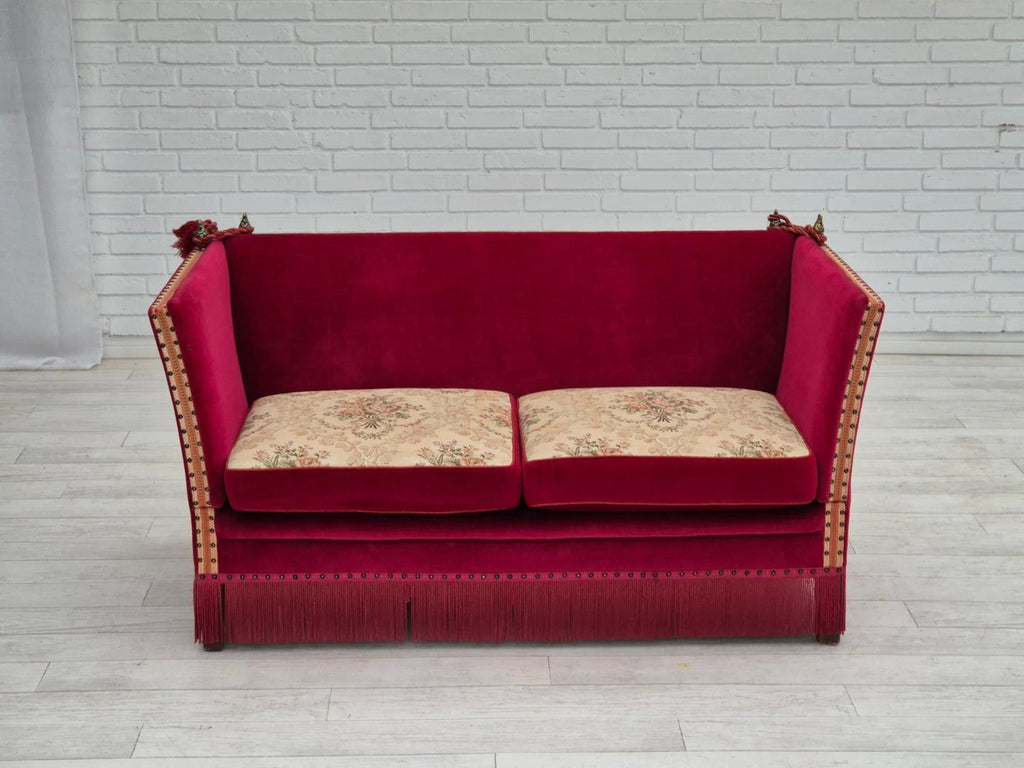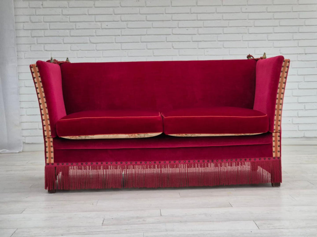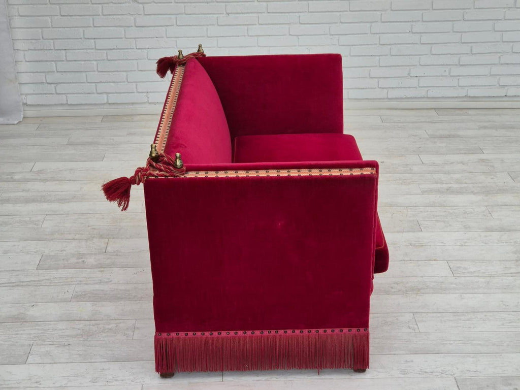 1970s, Danish velour 2 seater drop arm sofa, cherry-red velour, original condition.