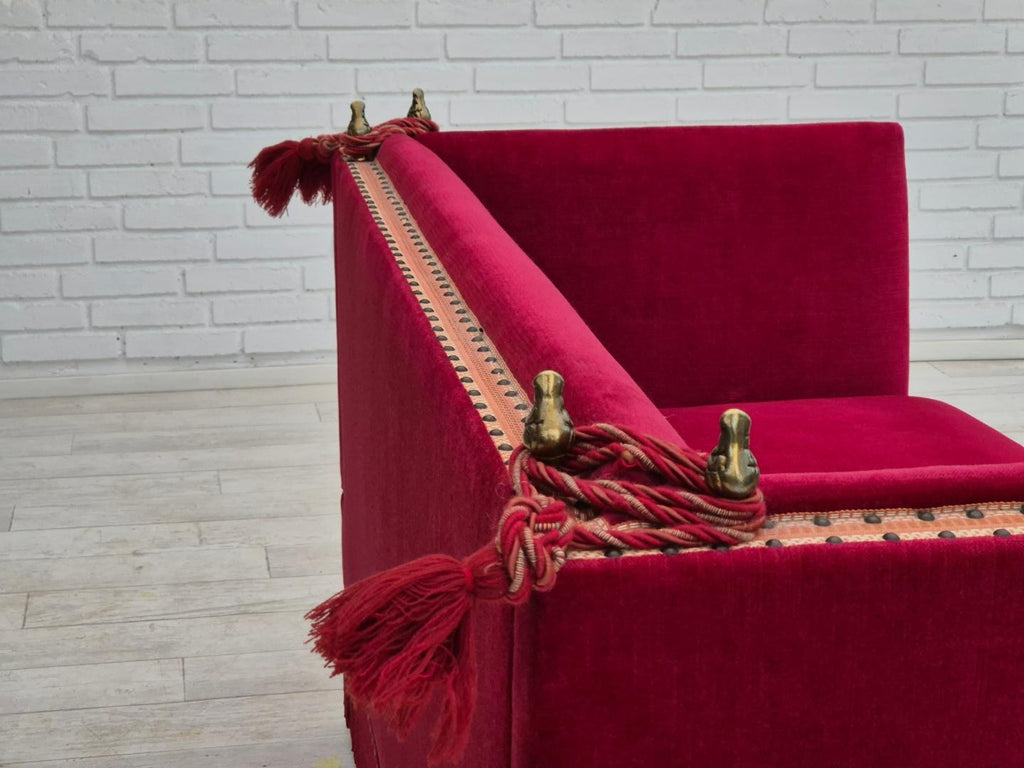 1970년대, 덴마크 "스페인" 드롭 암 소파는 원래 상태가 양호합니다. 냄새도 얼룩도 없습니다. 체리 레드 가구 벨루어, 물푸레 나무 다리. 내부에 스프링이 내장된 양면 시트 쿠션입니다. 조절 가능한 팔걸이(등받이 소파 아래 조절 레버). 팔걸이 조절용 장식 코드. 1965~70년대 덴마크 가구 제조업체에서 제조되었습니다.