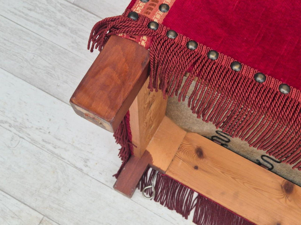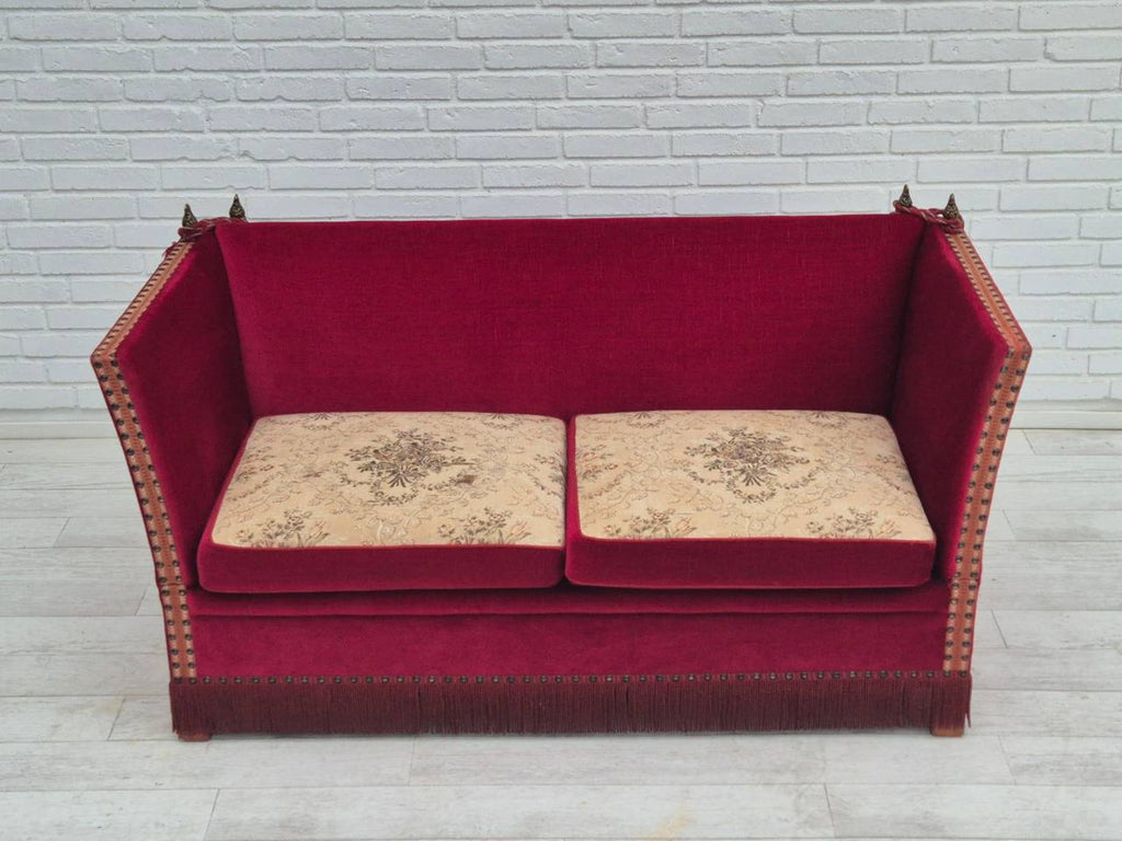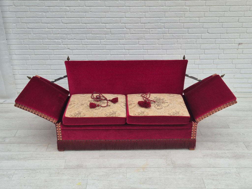 1970년대, 덴마크 "스페인" 드롭 암 소파는 원래 상태가 양호합니다. 냄새도 얼룩도 없습니다. 체리 레드 가구 벨루어, 물푸레 나무 다리. 내부에 스프링이 내장된 양면 시트 쿠션입니다. 조절 가능한 팔걸이(등받이 소파 아래 조절 레버). 팔걸이 조절용 장식 코드. 1965~70년대 덴마크 가구 제조업체에서 제조되었습니다.
