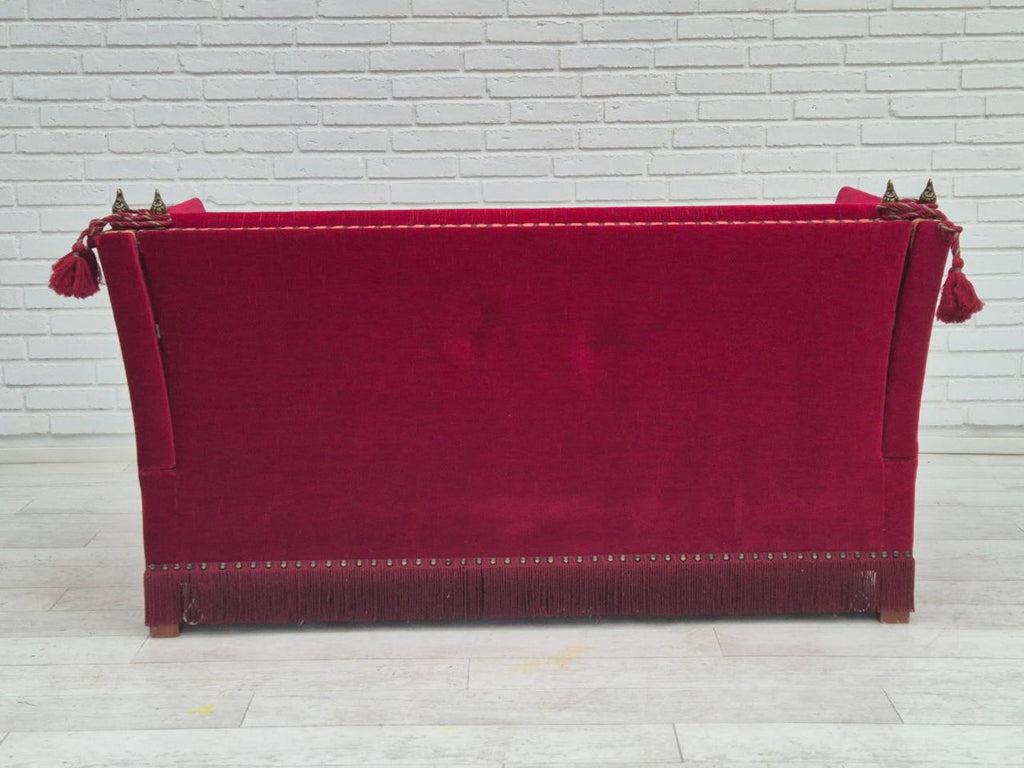 1970s, Danish "Spanish" drop arm sofa in original good condition: no smells and no stains. Cherry red furniture velour, ash wood legs. Double-sided seat cushions with springs inside. Adjustable armrests (adjustment lever under the back sofa). Decorative cords for adjusting armrests. Manufactured by Danish furniture manufacturer in about 1965-70s.