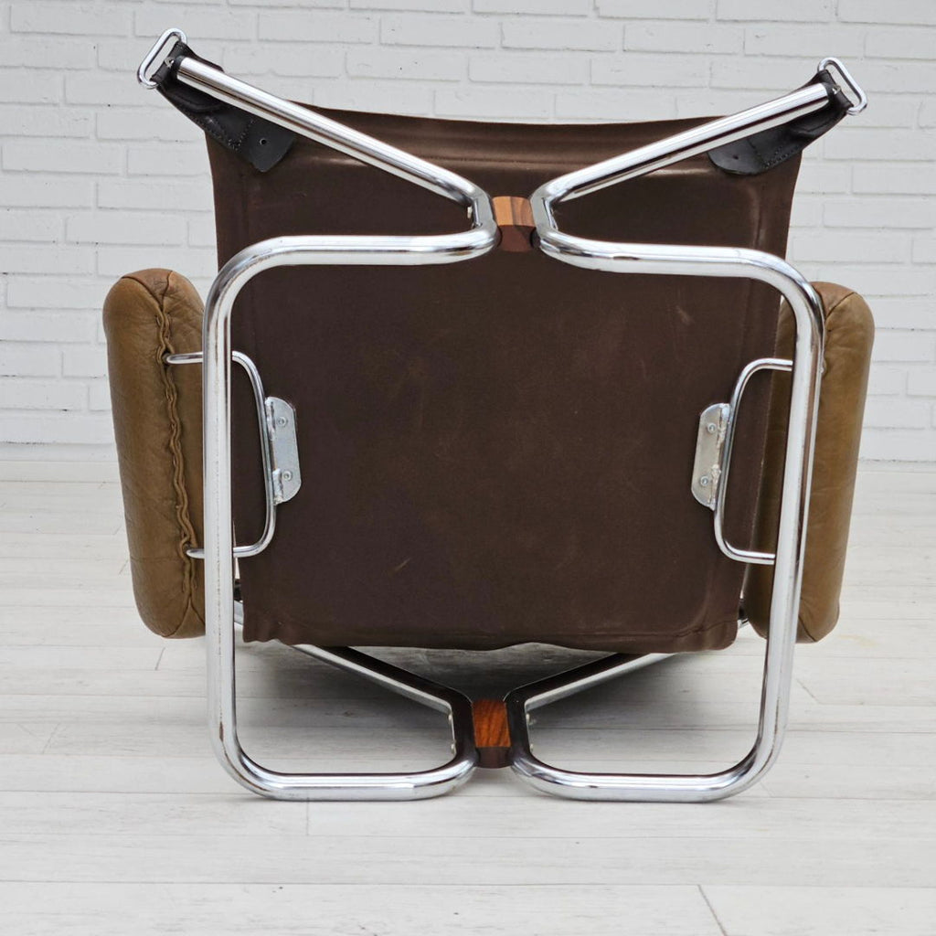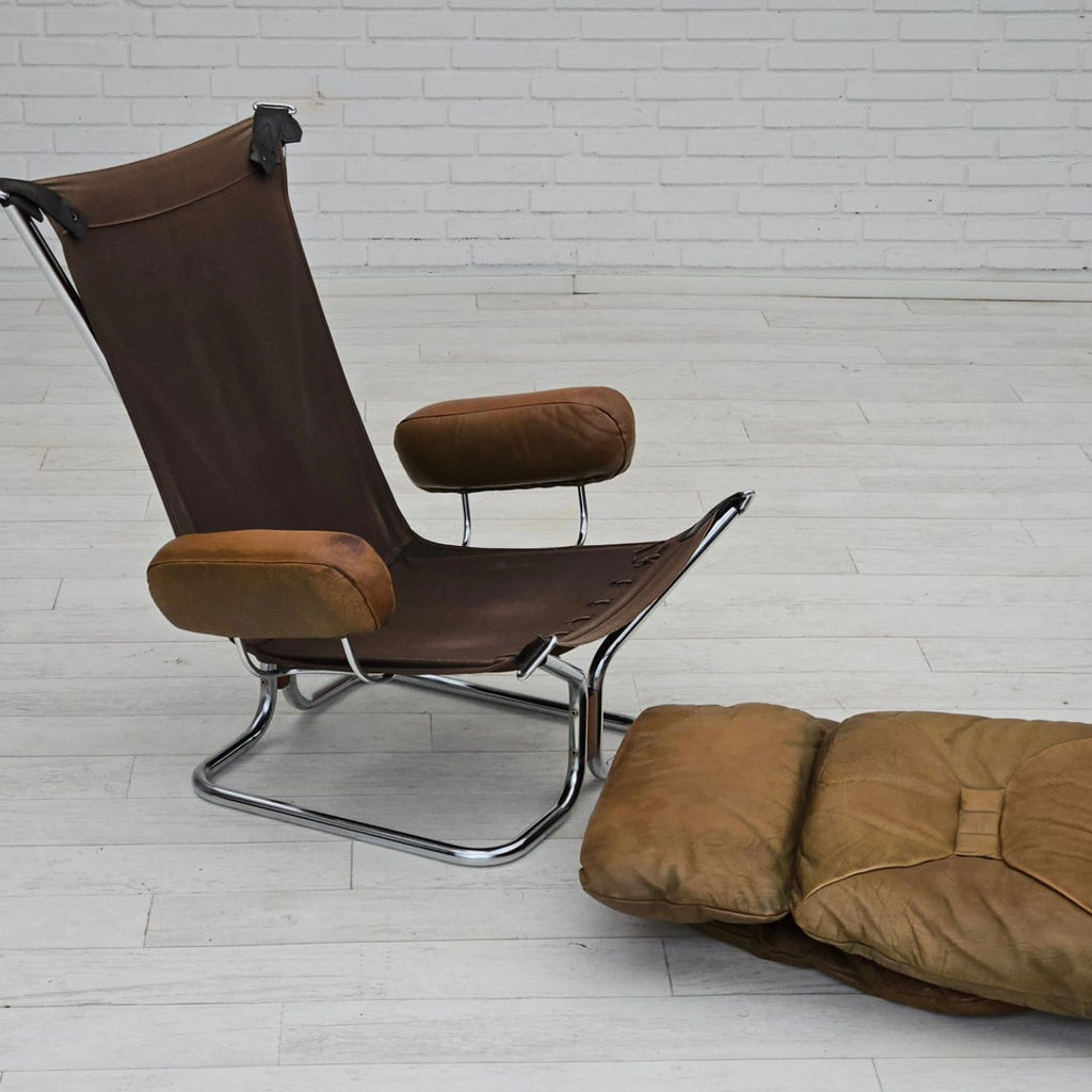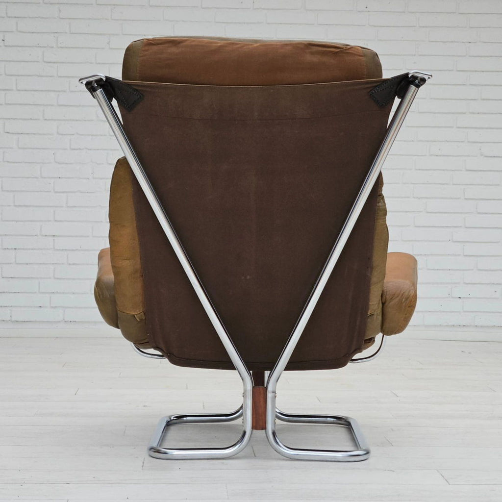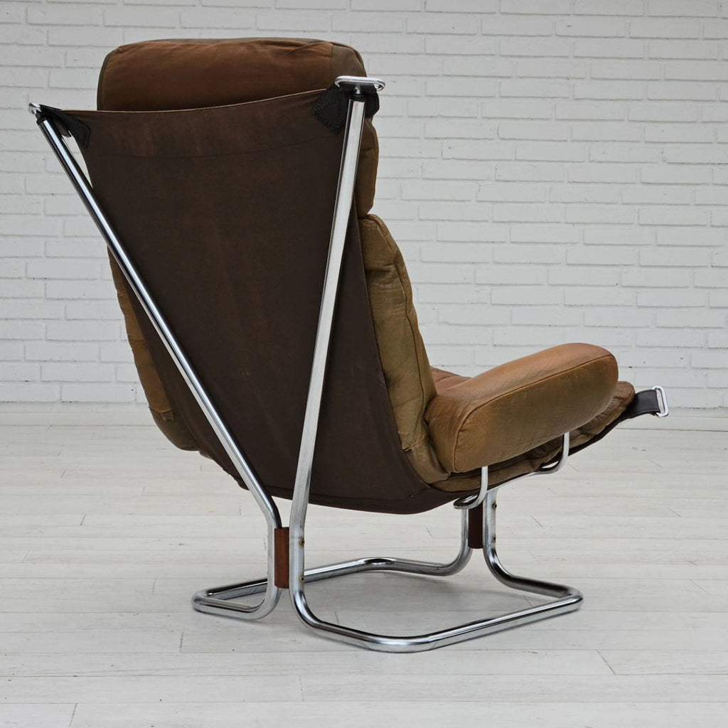 1970s, Norwegian design by Harald Relling. Original very good condition with patina: no smells and no stains. Original brown leather, chrome steel, teakwood, canvas. Manufactured by Norwegian furniture manufacturer Westnofa in about 1970s.