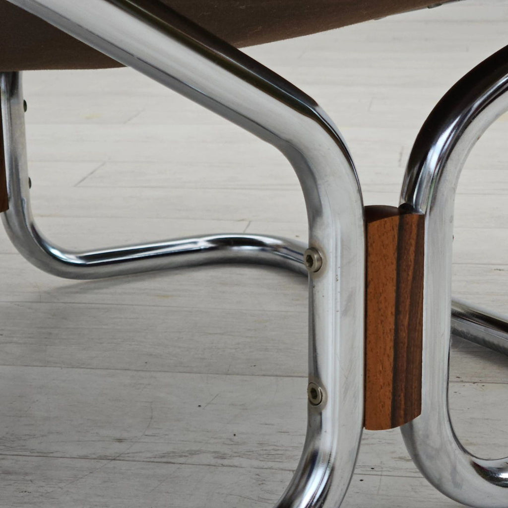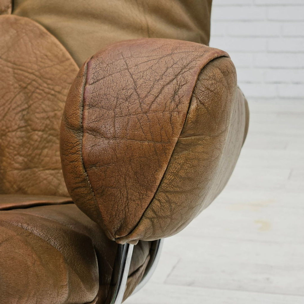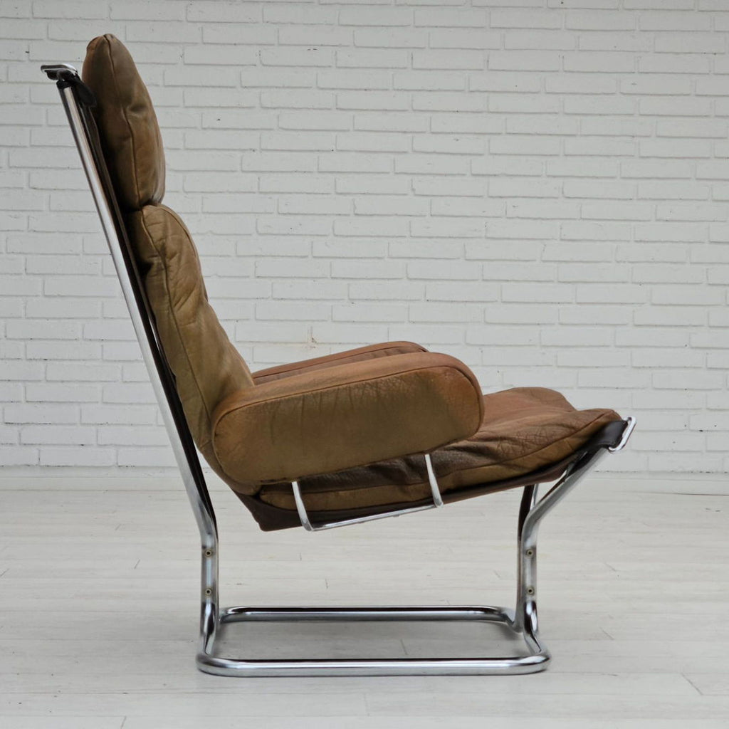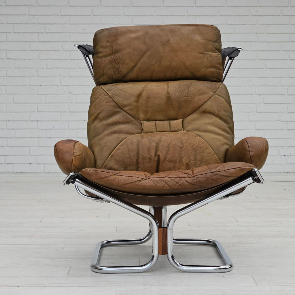 1970s, Norwegian design by Harald Relling. Original very good condition with patina: no smells and no stains. Original brown leather, chrome steel, teakwood, canvas. Manufactured by Norwegian furniture manufacturer Westnofa in about 1970s.