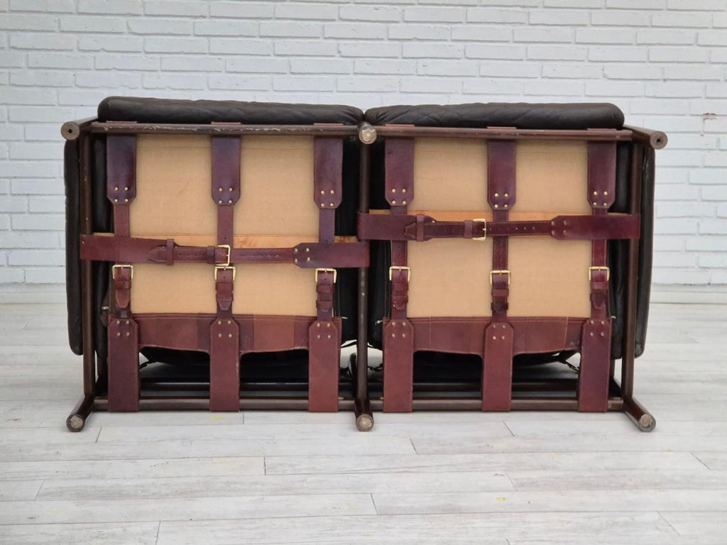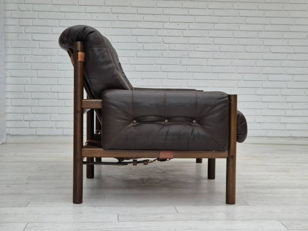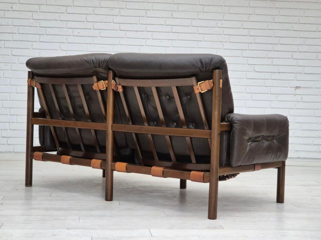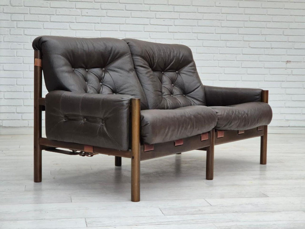 1970년대, Ivar Opsvik이 Bruksbo 노르웨이를 위해 노르웨이 디자인. 2인용 소파, 모델 "Safari". 원래 매우 좋은 상태: 냄새도 없고 얼룩도 없습니다. 브라운 가죽, 캔버스, 너도밤나무. 1970년대경 노르웨이의 가구 제조업체에서 제조되었습니다.