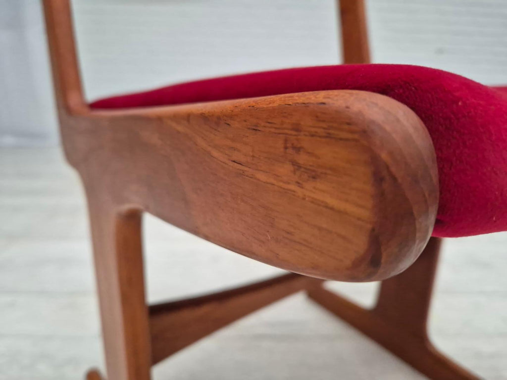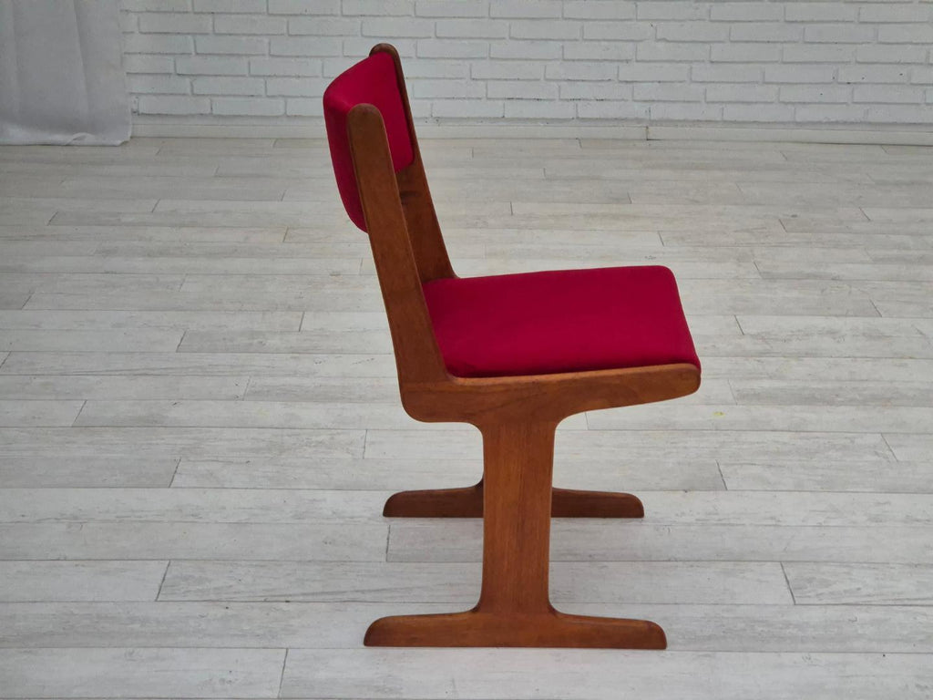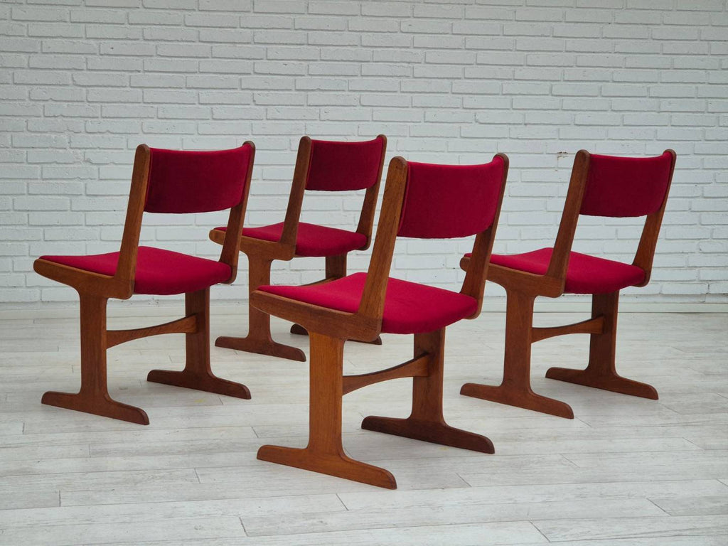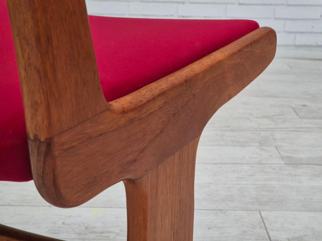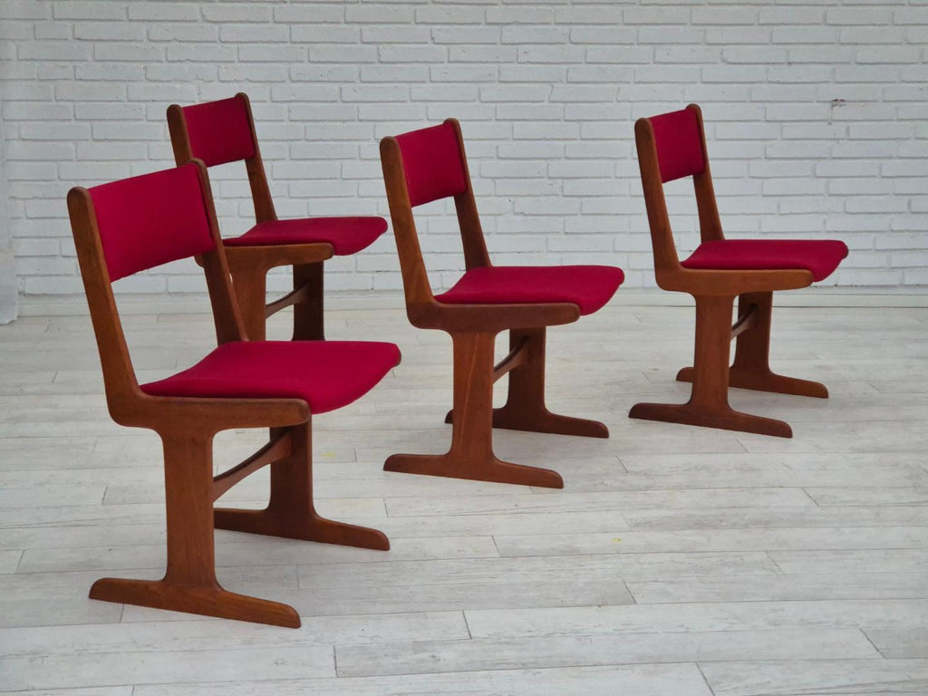 1970s, set of 4 reupholstered Danish chairs, teak wood, cherry-red furniture velour.