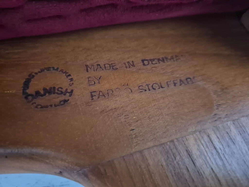 1970년대, 덮개를 씌운 덴마크 의자 4개 세트. 재생된 티크 목재, 체리 레드 가구 벨루어. 덴마크 가구 제조업체인 Farsø Møbelfabrik이 1970년경에 제조했습니다. 장인이 다시 덮개를 씌웠습니다.