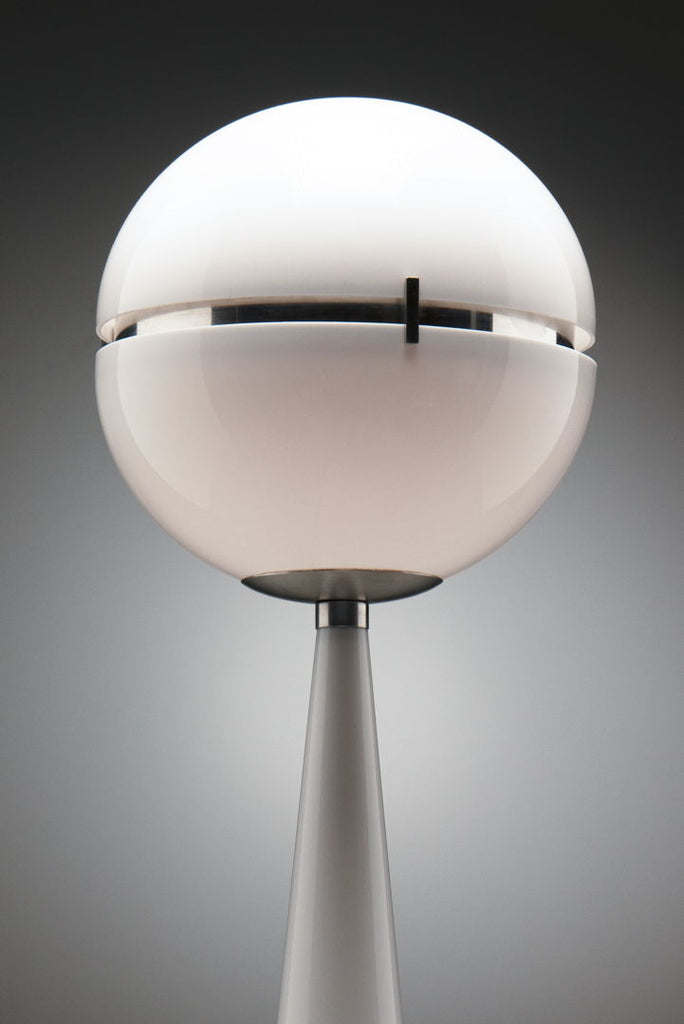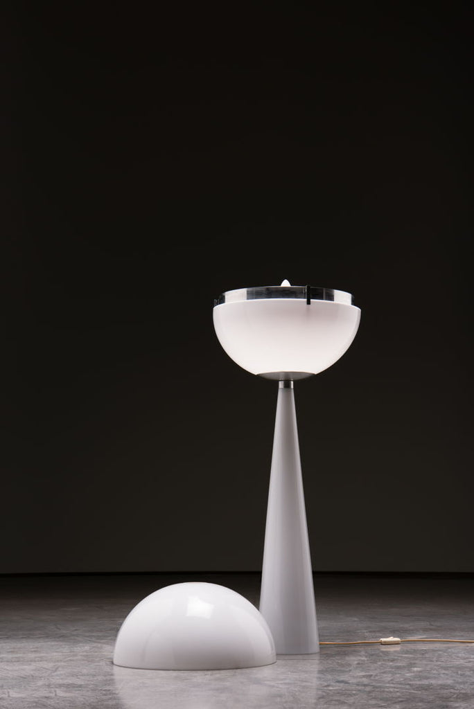 Acciarri를 연상시키는 스타일로 디자인된 1970년대 우주 시대 이탈리아 플로어 램프입니다. 램프는 흰색 플라스틱으로 제작된 원뿔 위에 구형 디자인이 특징입니다. 구는 알루미늄 링으로 분리된 두 개의 반쪽으로 구성됩니다. 내부에 빨간색 알루미늄 링이 포함된 독특한 구조는 매력적이고 독특한 조명 효과를 만들어냅니다.