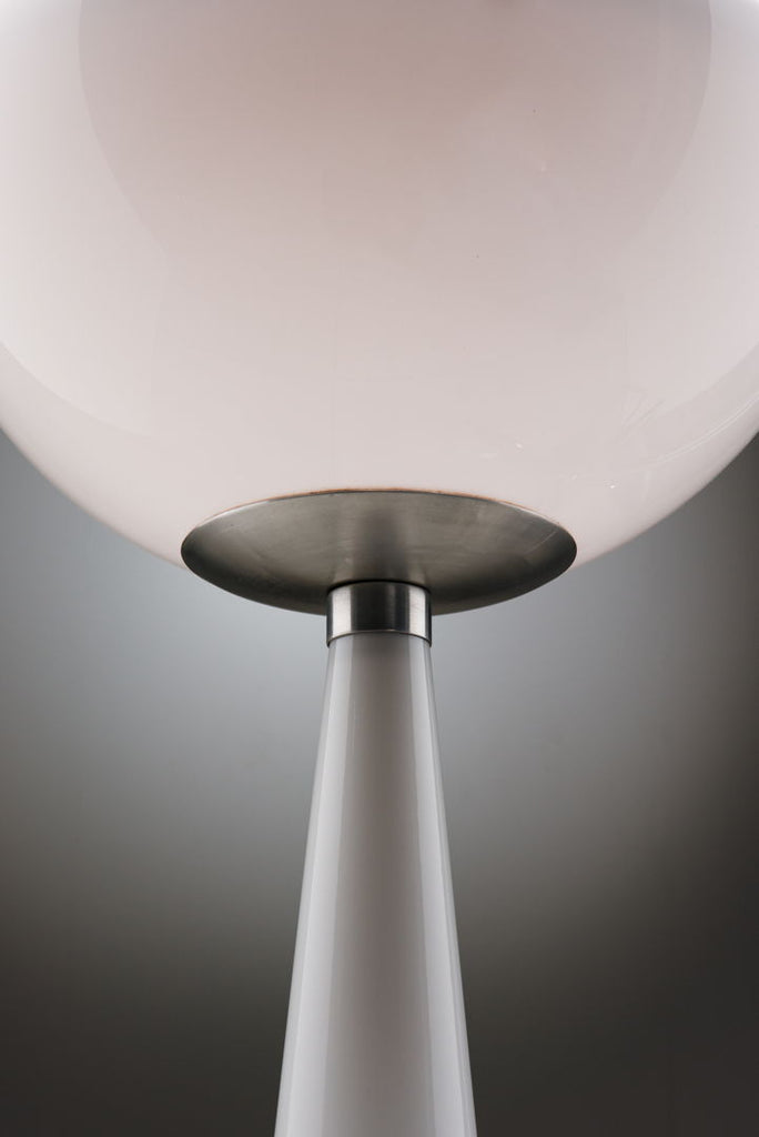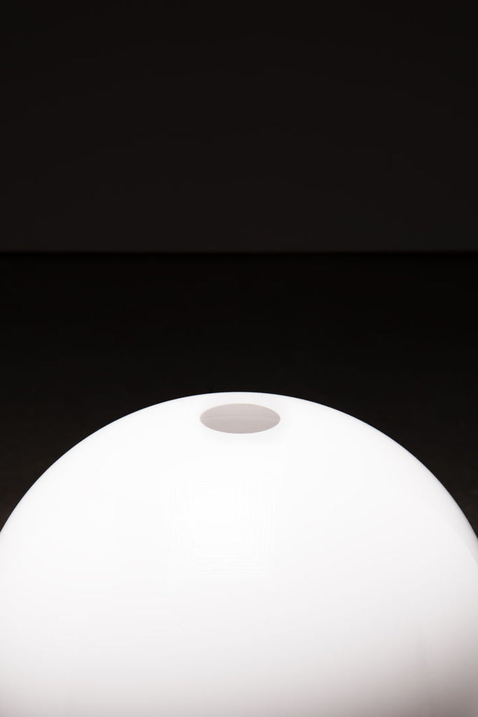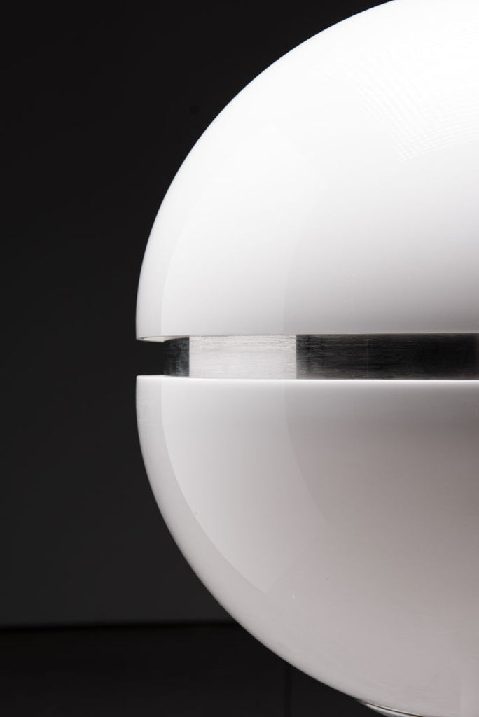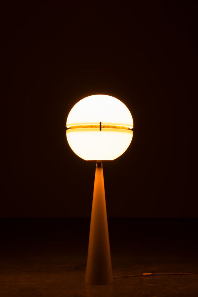 Italian floor lamp from the 1970s Space-Age era, designed in the style reminiscent of Acciarri. The lamp features a spherical design atop a cone crafted from white plastic. The sphere is composed of two halves, separated by an aluminum ring. The unique construction, along with the inclusion of a red aluminum ring inside, produces a charming and distinctive lighting effect.