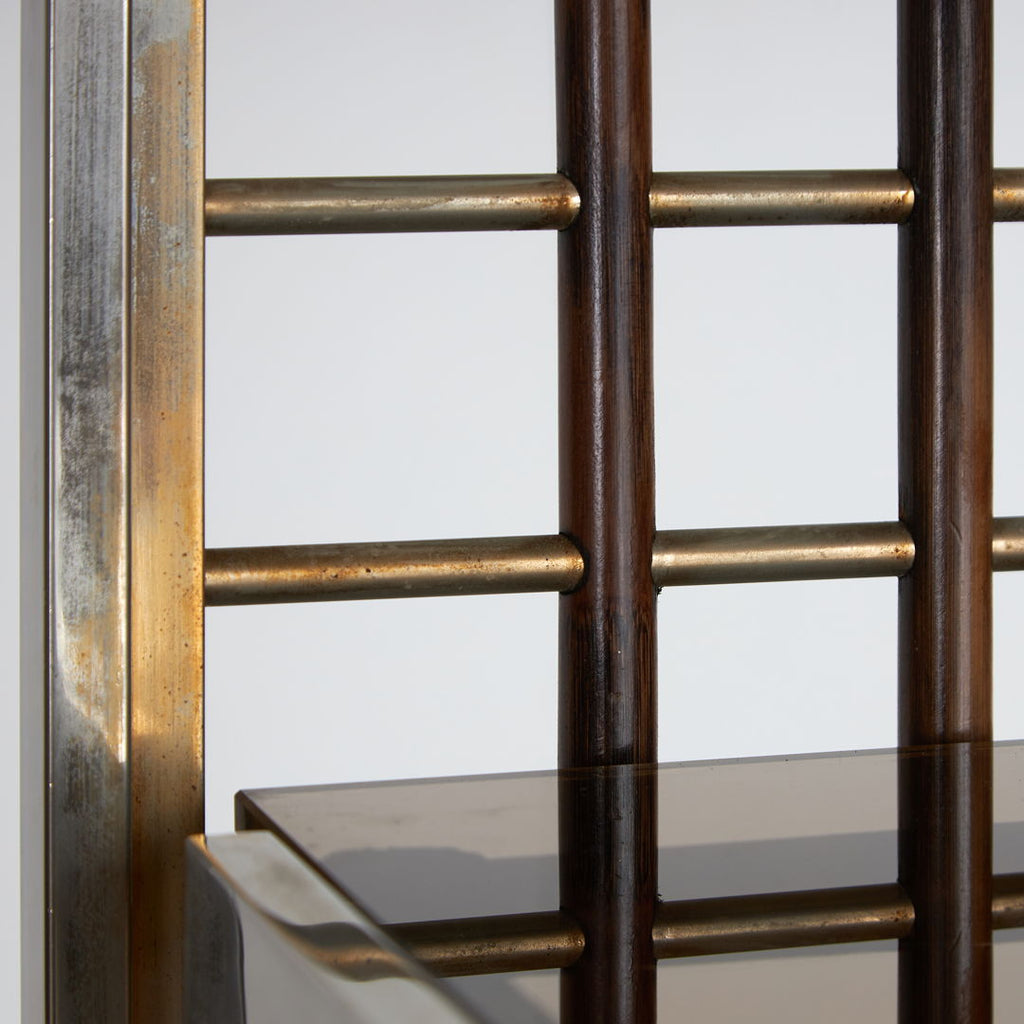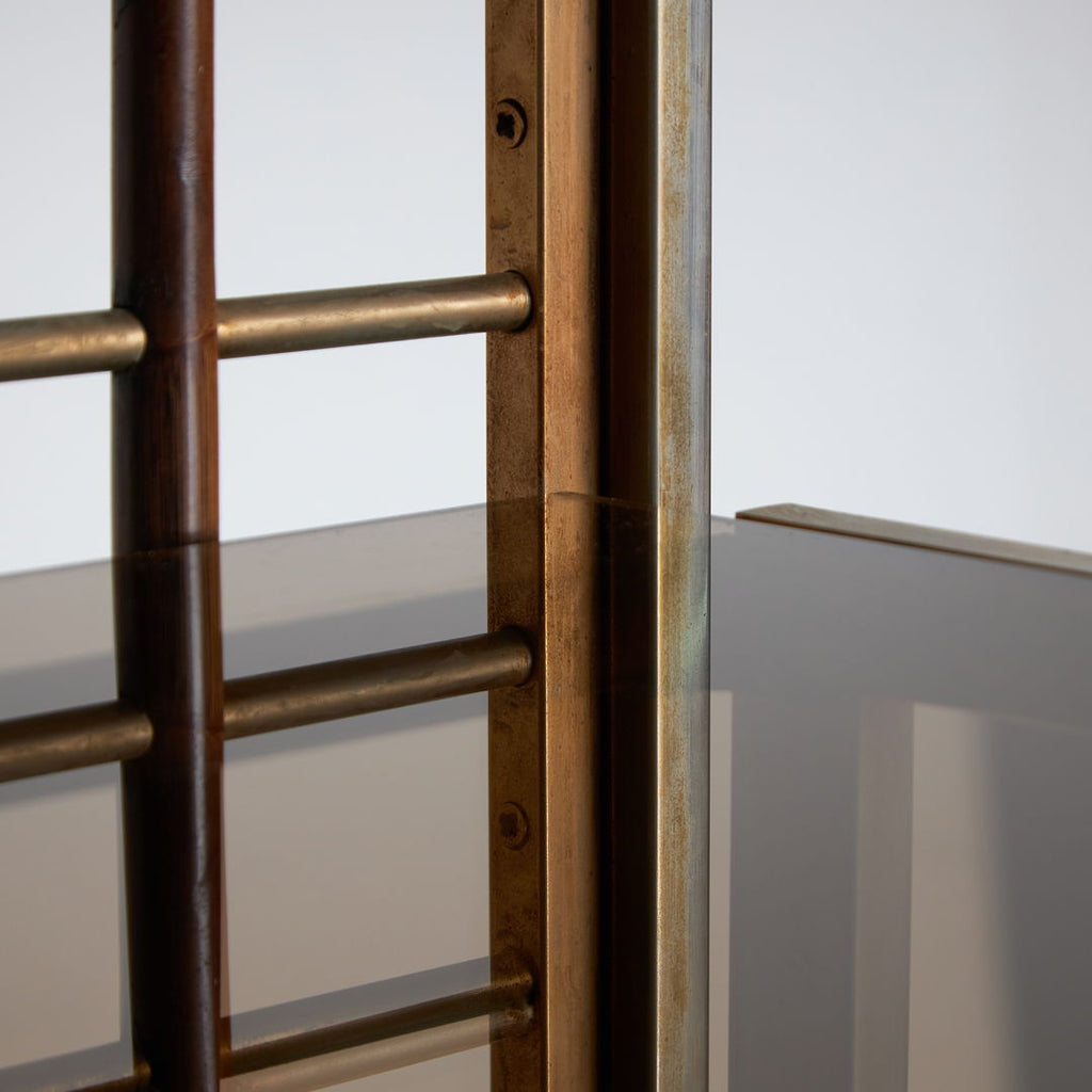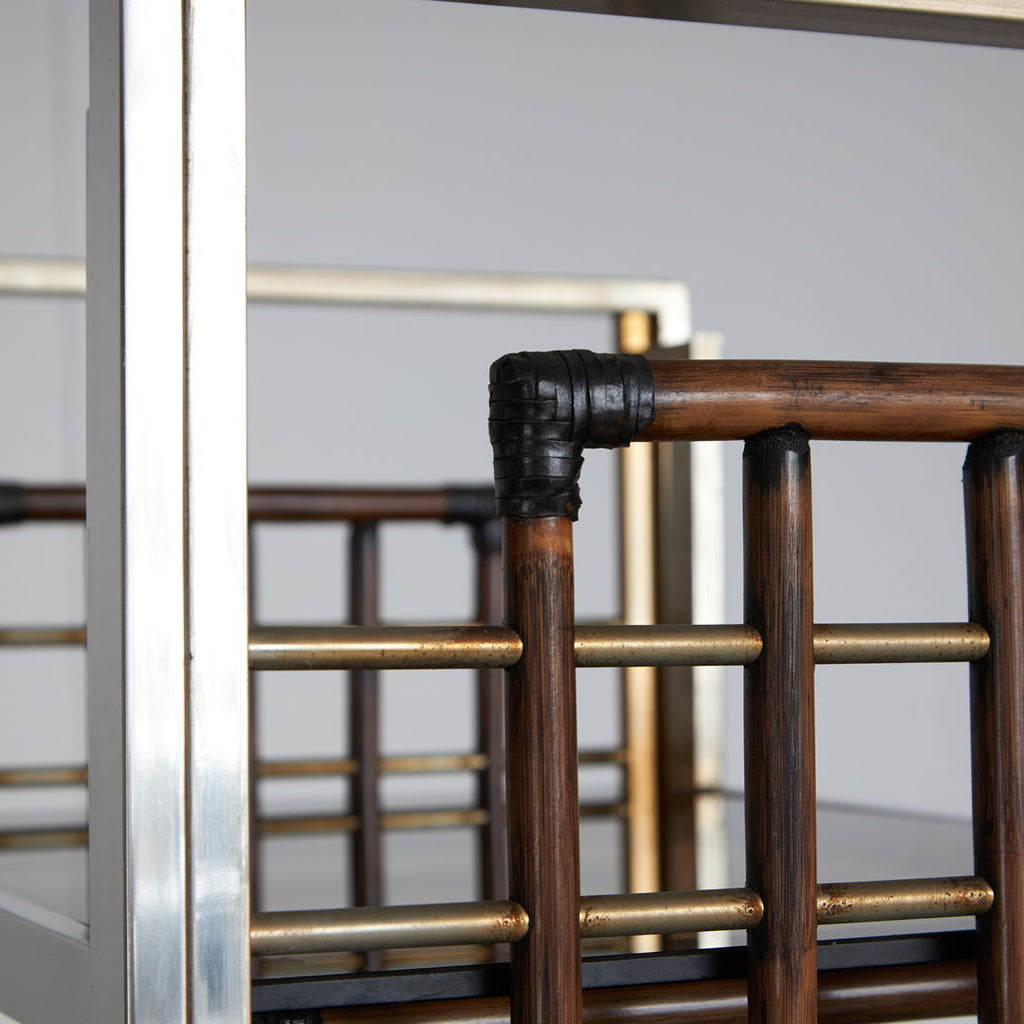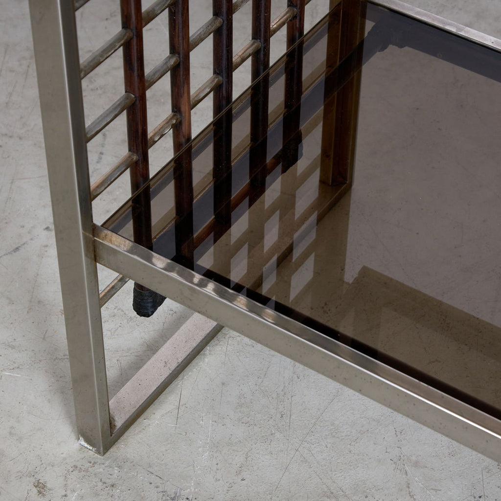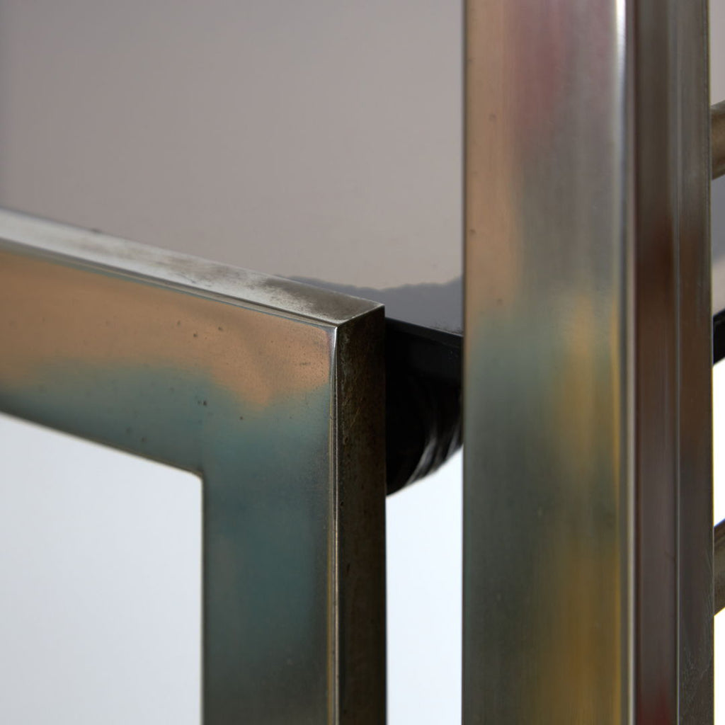 This 1970’s shelving unit is stylishly crafted from chromed brass, featuring decorative bamboo sections and four smoked glass tops. While there are some indications of wear and abrasion on the frame, this piece remains robust and carefully built, evidencing its age and prior usage.