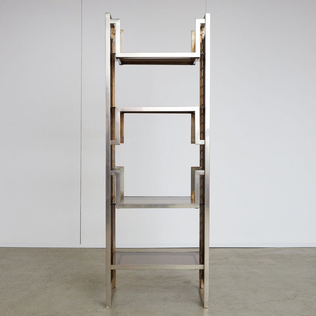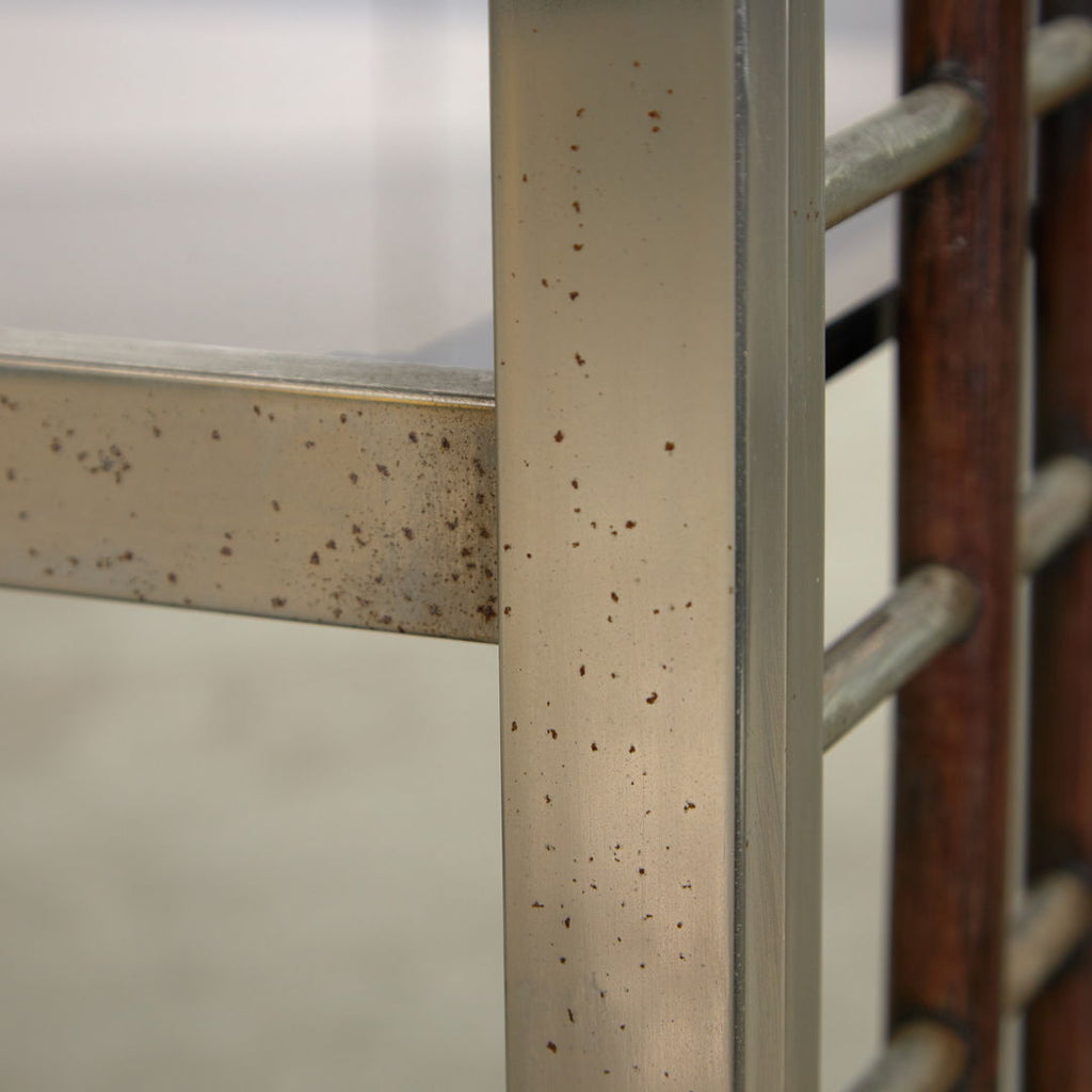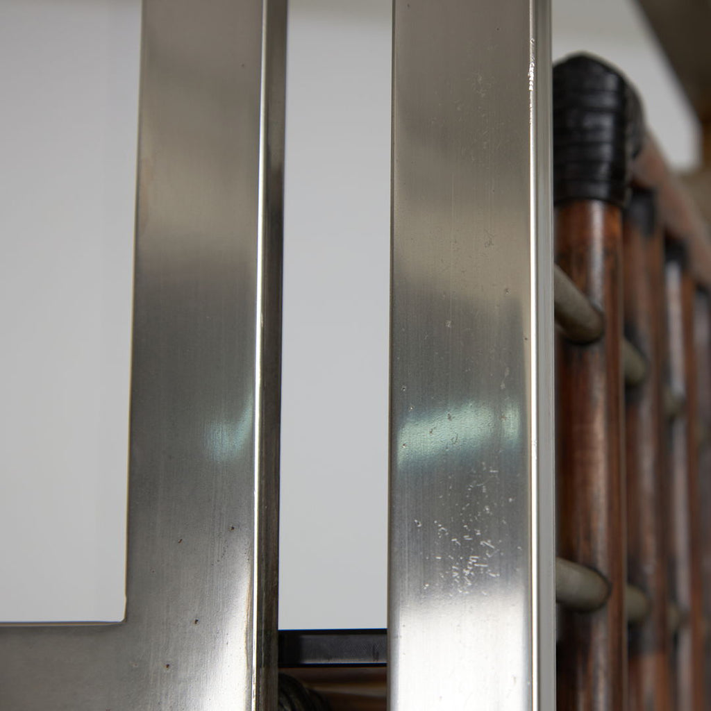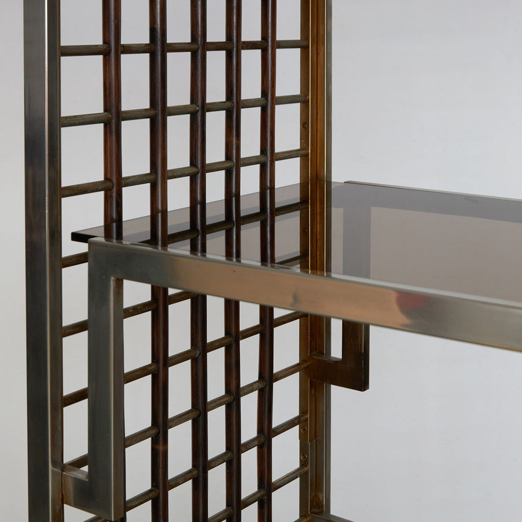 This 1970’s shelving unit is stylishly crafted from chromed brass, featuring decorative bamboo sections and four smoked glass tops. While there are some indications of wear and abrasion on the frame, this piece remains robust and carefully built, evidencing its age and prior usage.