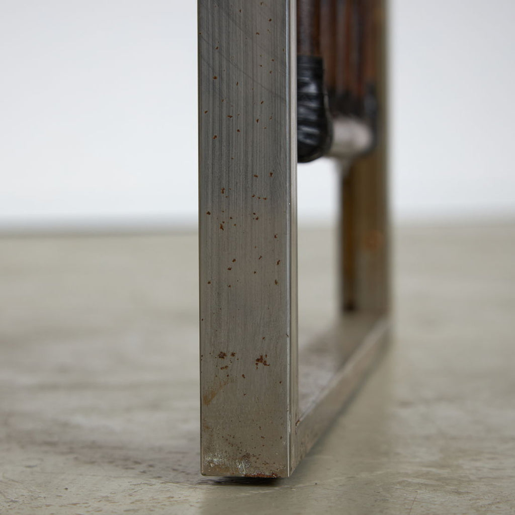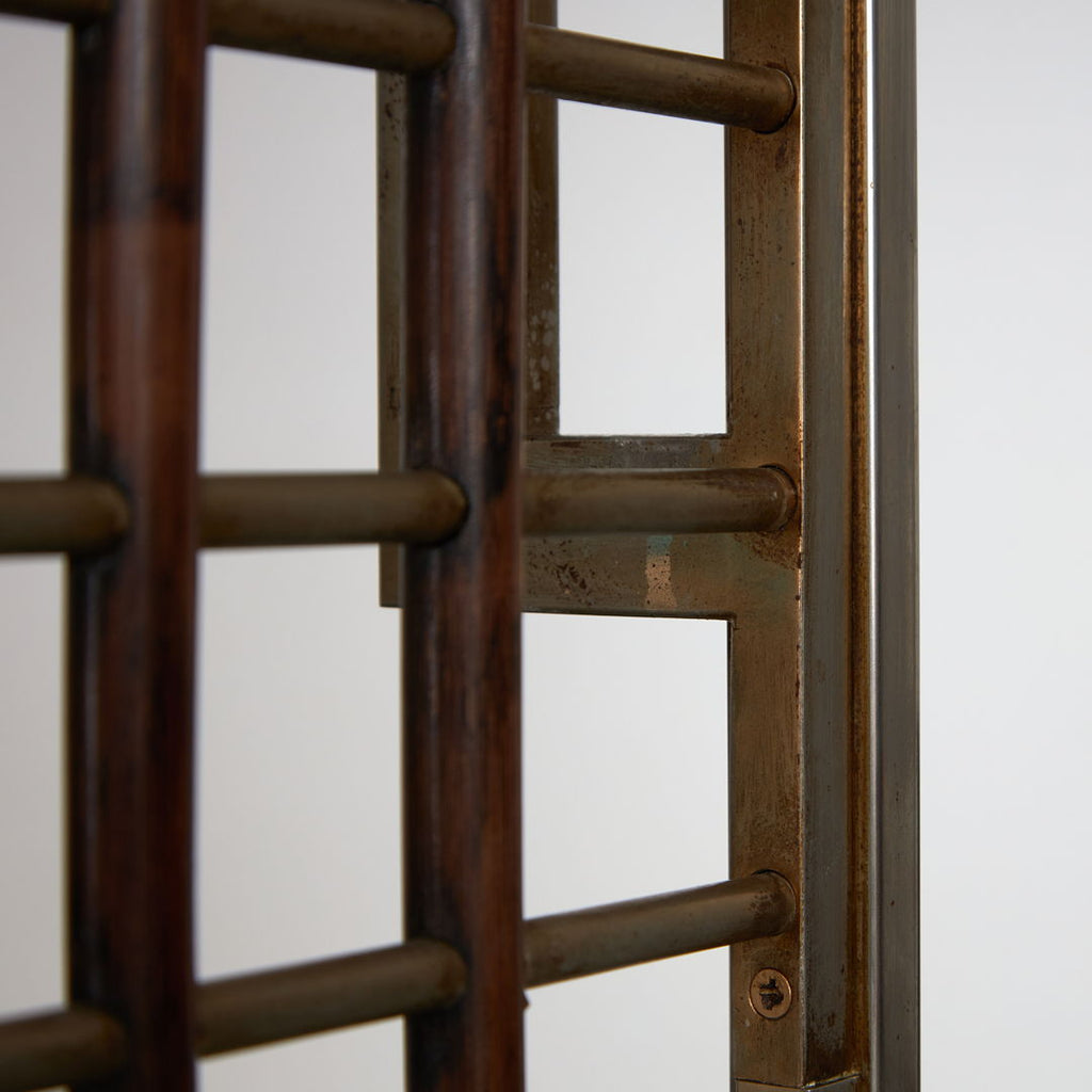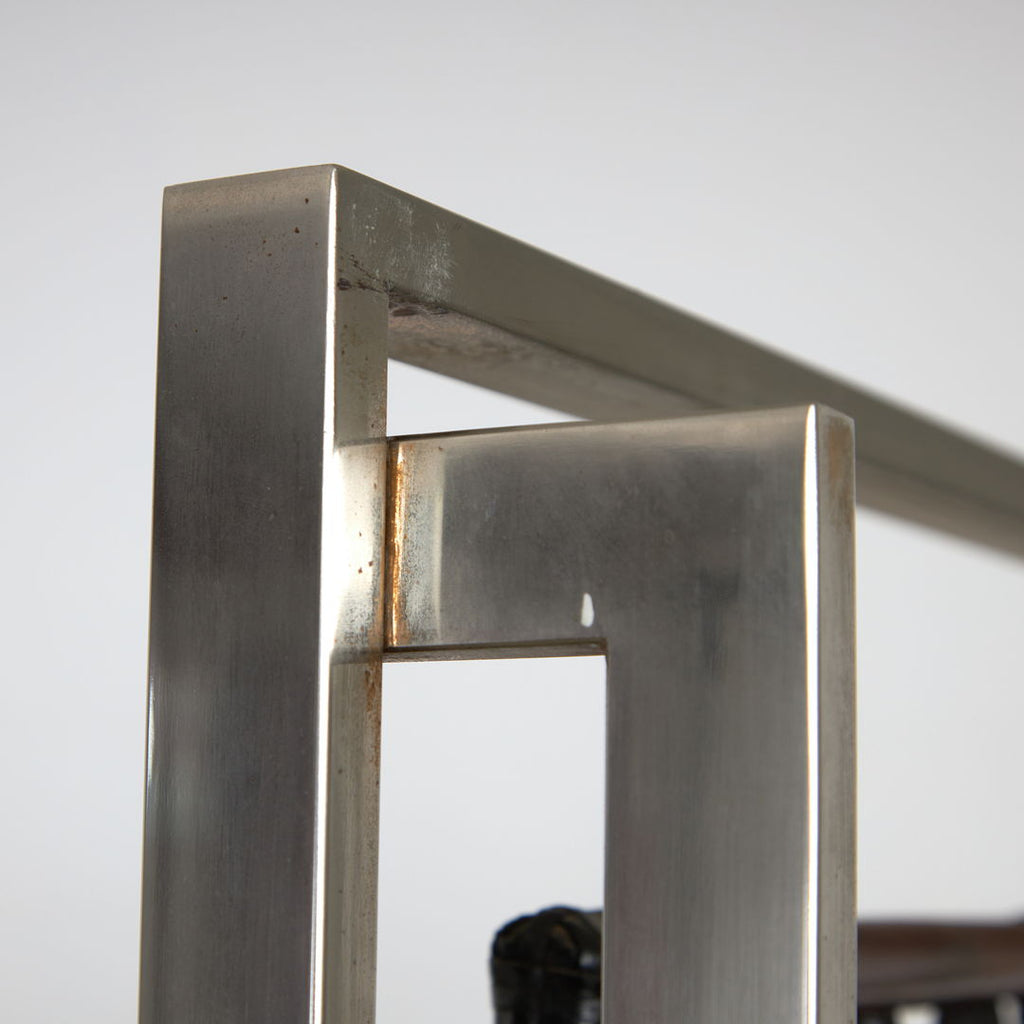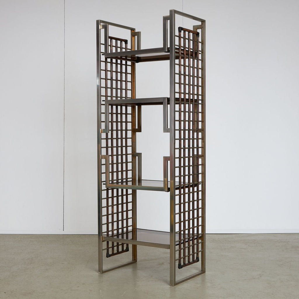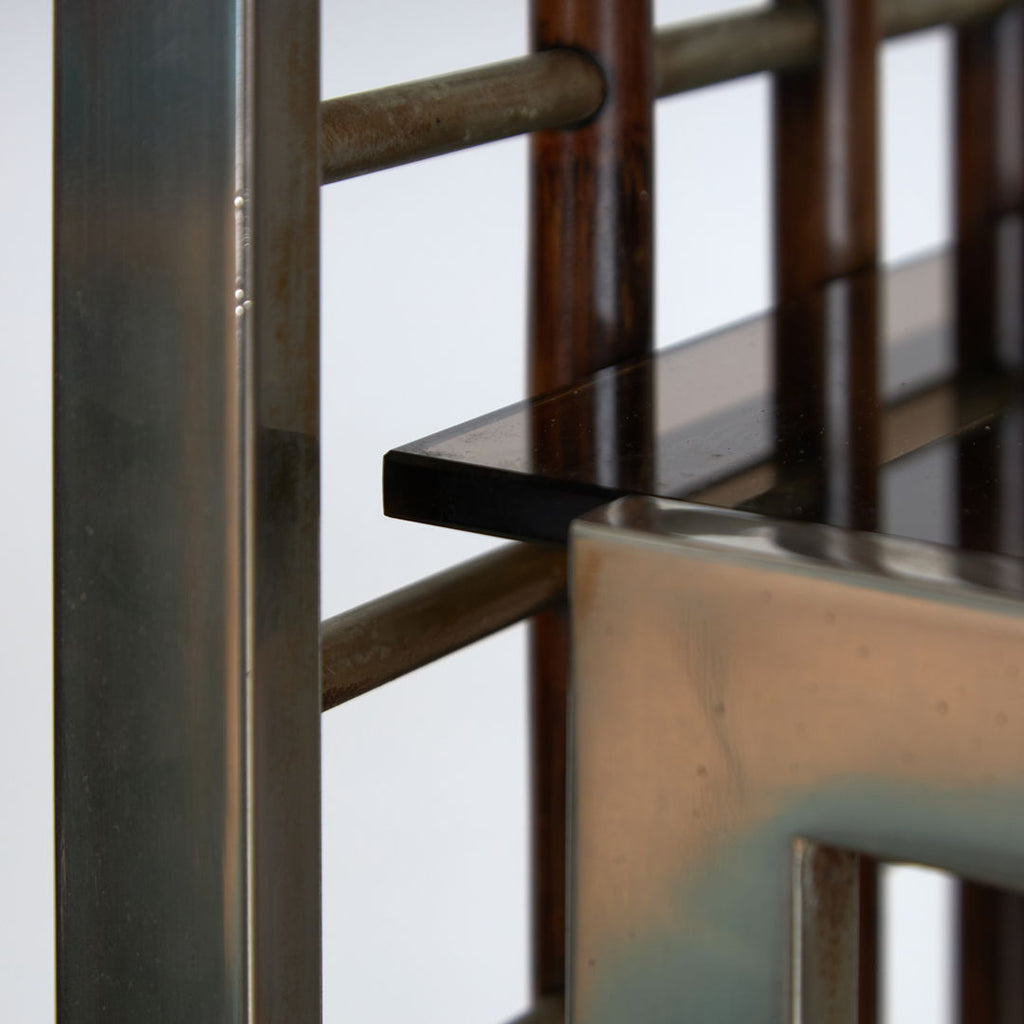 This 1970’s shelving unit is stylishly crafted from chromed brass, featuring decorative bamboo sections and four smoked glass tops. While there are some indications of wear and abrasion on the frame, this piece remains robust and carefully built, evidencing its age and prior usage.