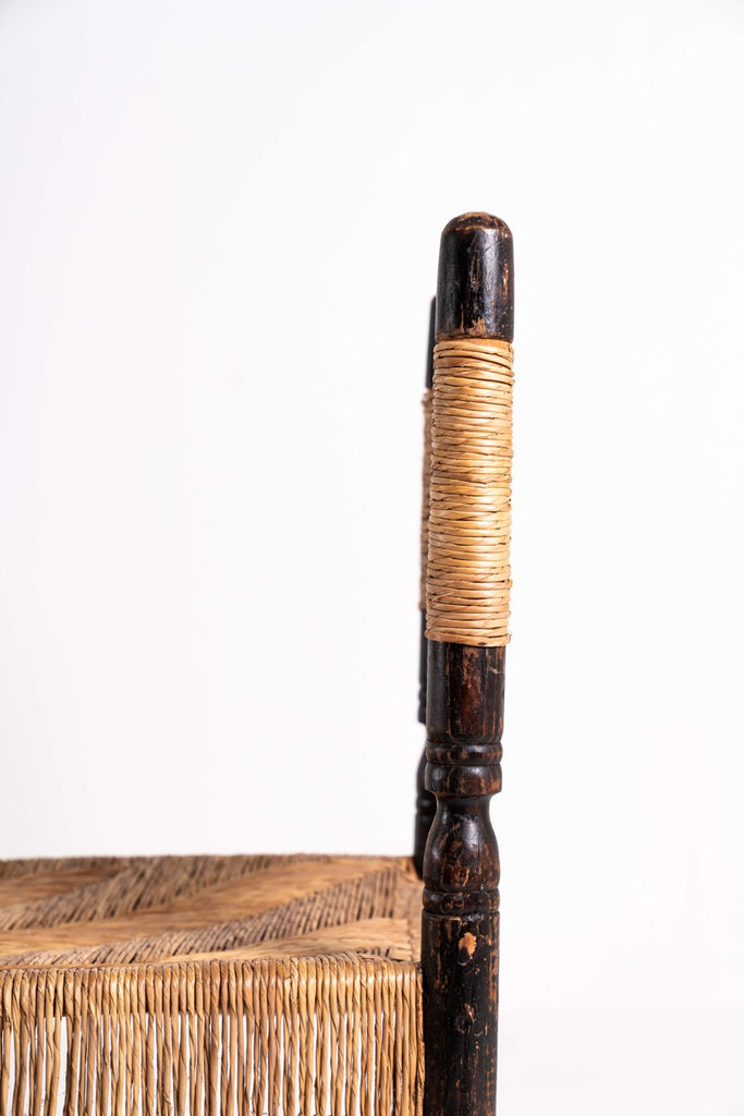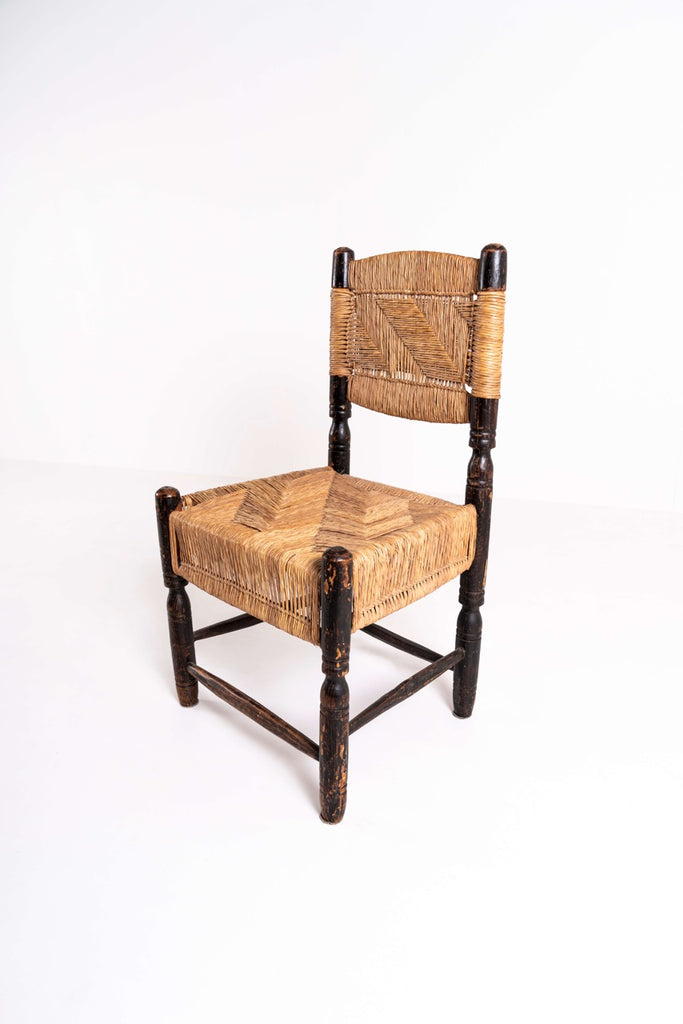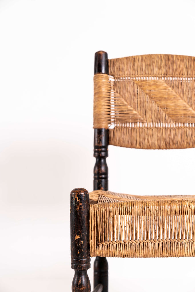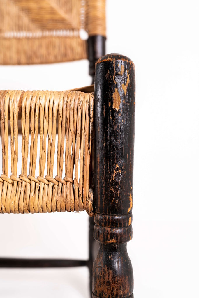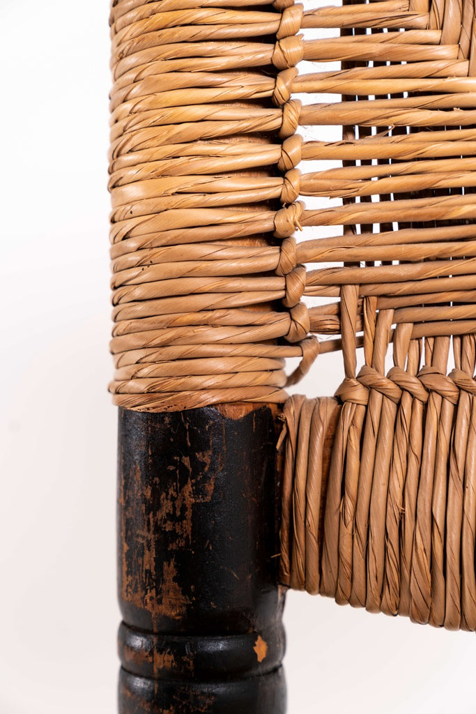 이 의자의 파티나는 너무 잘 어울려 복원작업을 진행하지 않았습니다. 견고한 나무와 직조 시트로 인해 약간 스페인 또는 멕시코처럼 보입니다. 파티나를 제외하고 의자는 페이퍼코드 부분에 손상 없이 정말 좋은 상태입니다. 2개가 있습니다.