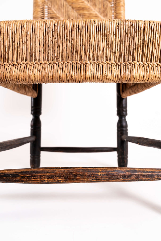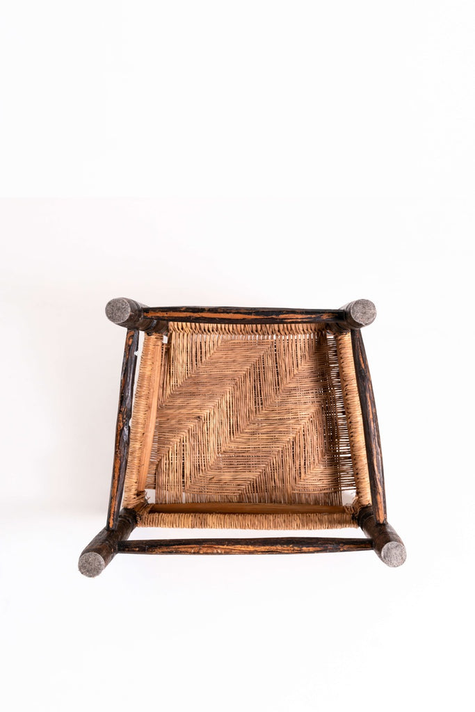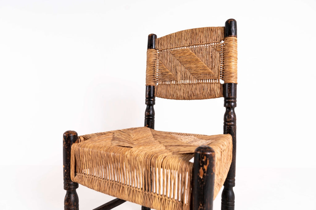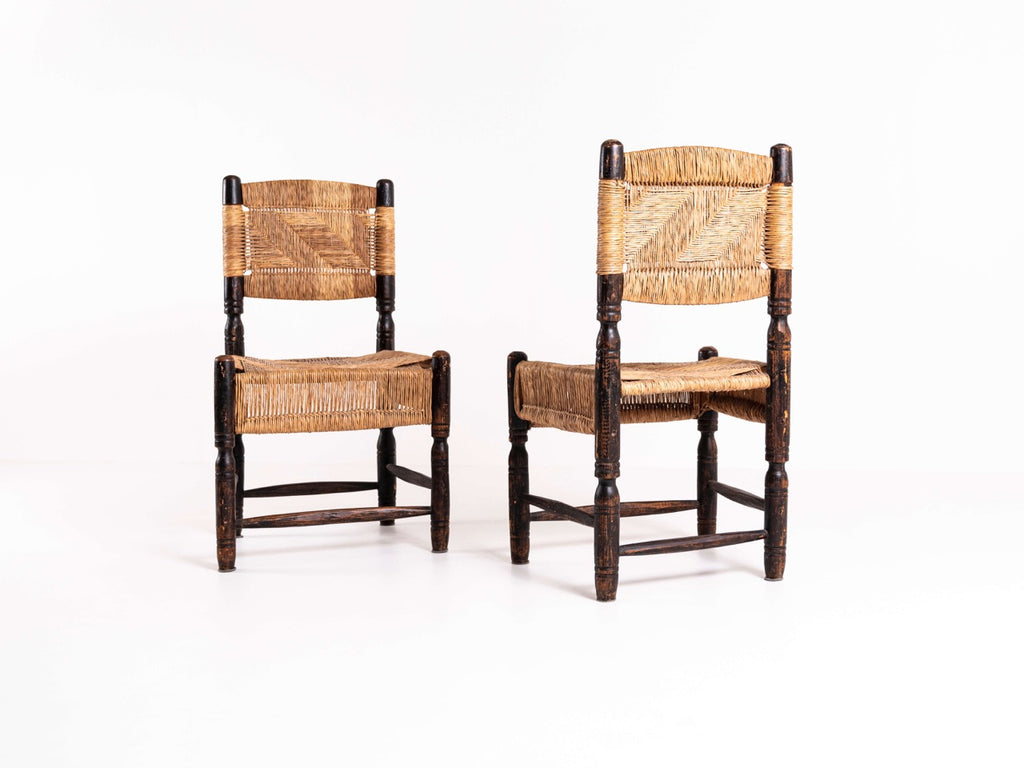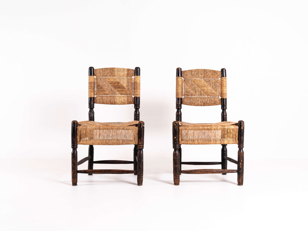 이 의자의 파티나는 너무 잘 어울려 복원작업을 진행하지 않았습니다. 견고한 나무와 직조 시트로 인해 약간 스페인 또는 멕시코처럼 보입니다. 파티나를 제외하고 의자는 페이퍼코드 부분에 손상 없이 정말 좋은 상태입니다. 2개가 있습니다.