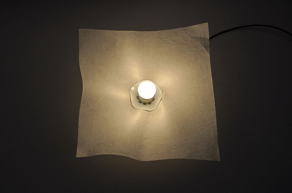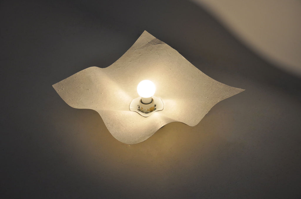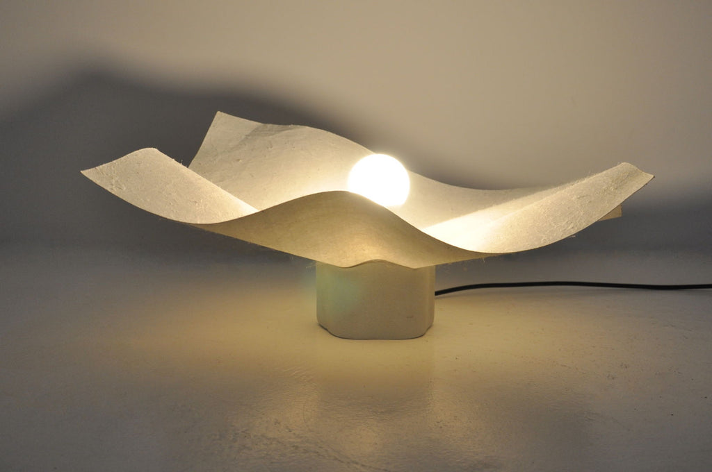 마리오 벨리니(Mario Bellini) 세라믹 베이스의 크림색 램프. 램프의 시간과 수명으로 인해 마모되었습니다.
