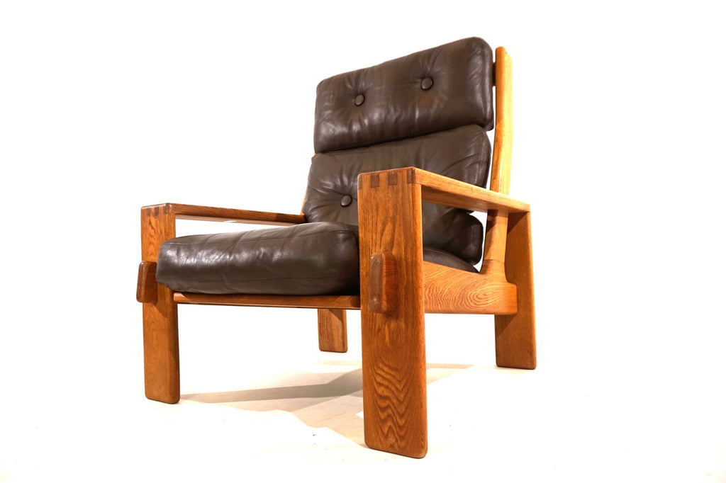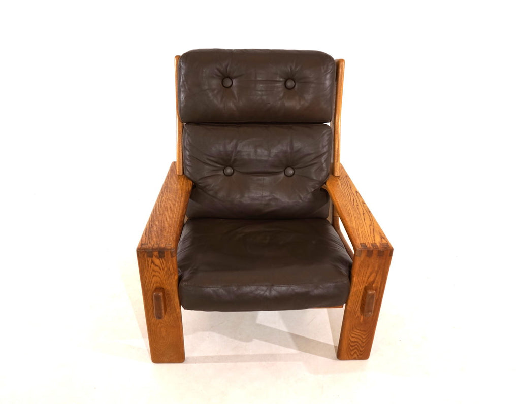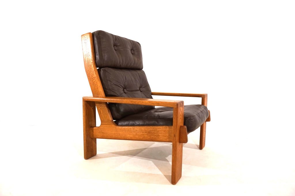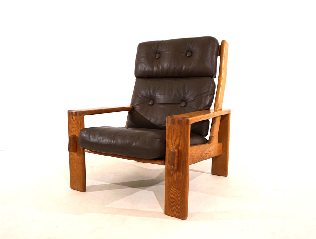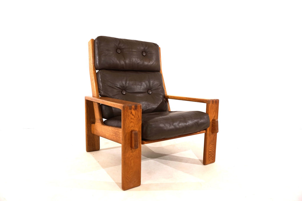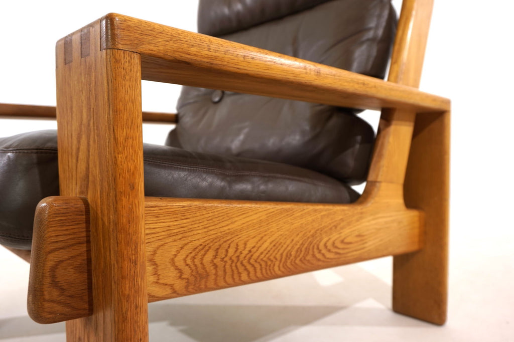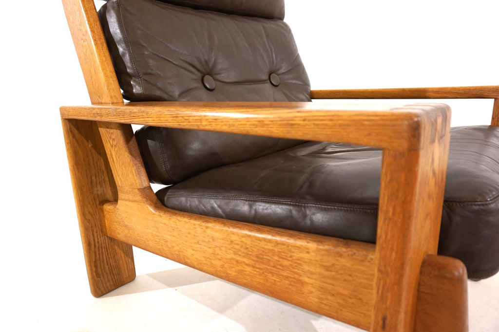 This Bonanza armchair from the 1960s comes in the rare high-back version and in dark brown leather with an oak frame. The armchair shows hardly any signs of wear on the leather, the thick leather is soft and supple. The solid oak frame is in excellent condition. The armchair offers very good seating comfort. Finnish designer Esko Pajamies designed this armchair for Asko Finland in the 1960s, creating a design classic. The Finnish furniture manufacturer Asko was founded in 1919 and made a name for itself in the 1960s and 1970s by collaborating with top designers and delivering innovative design.