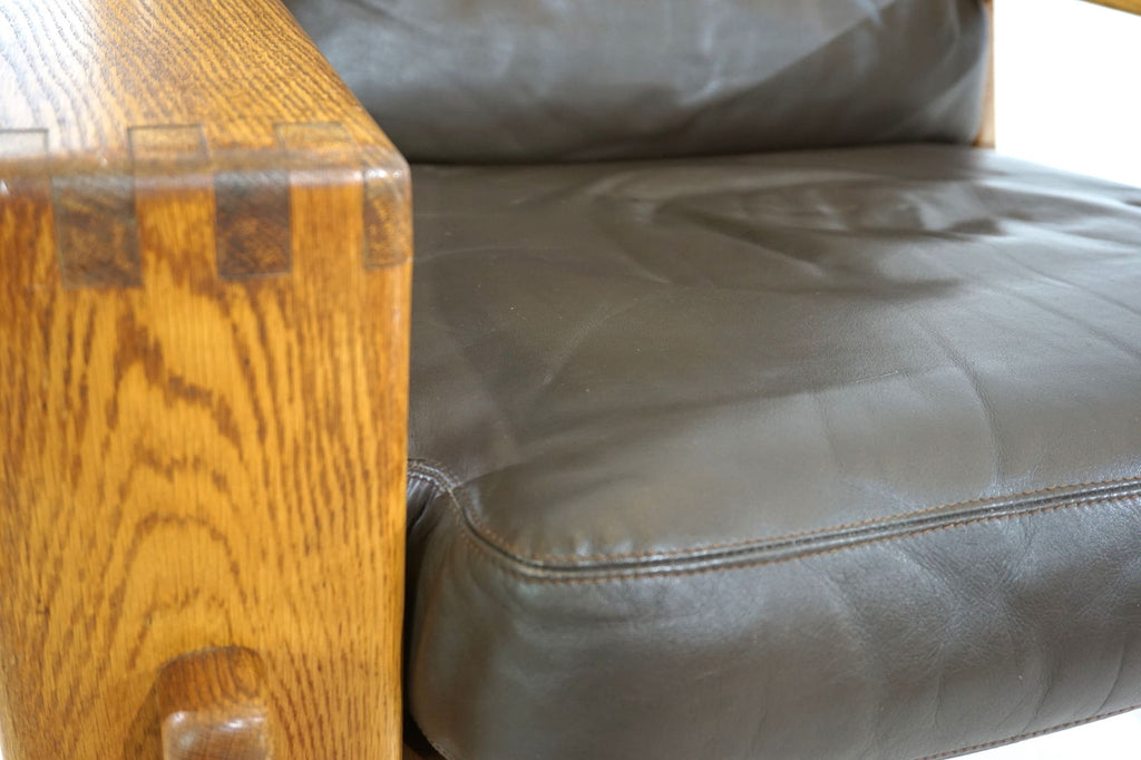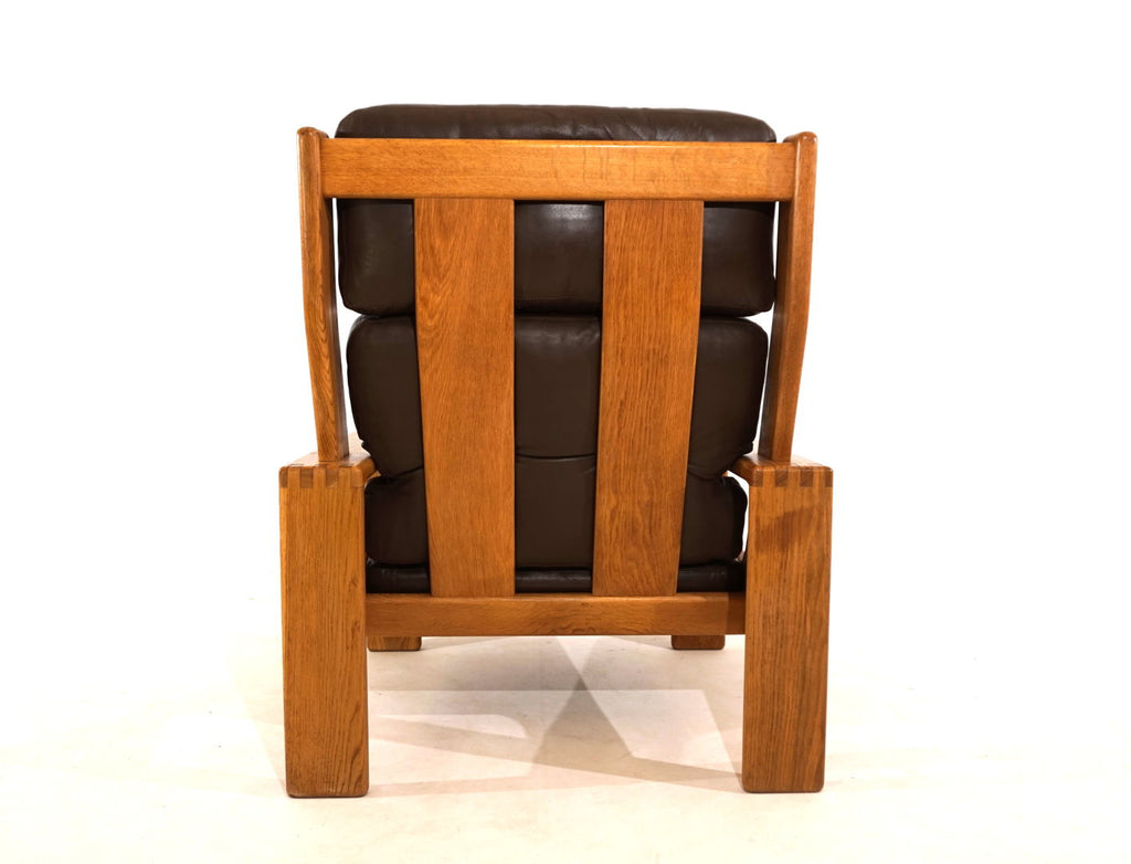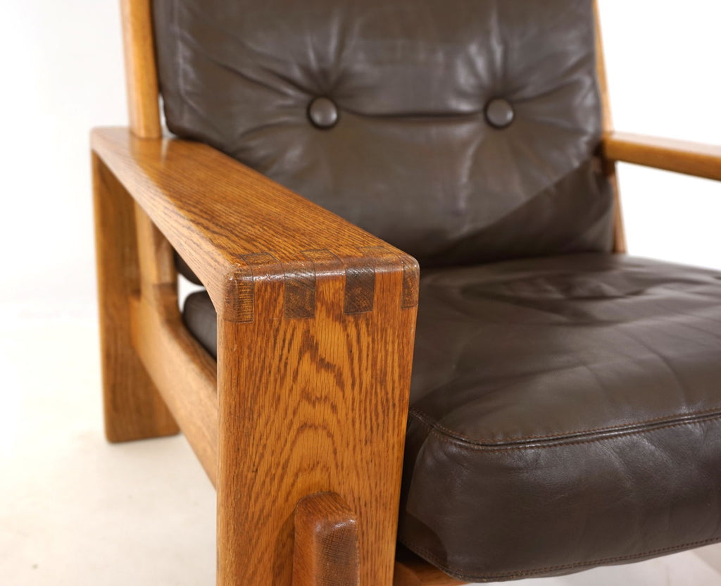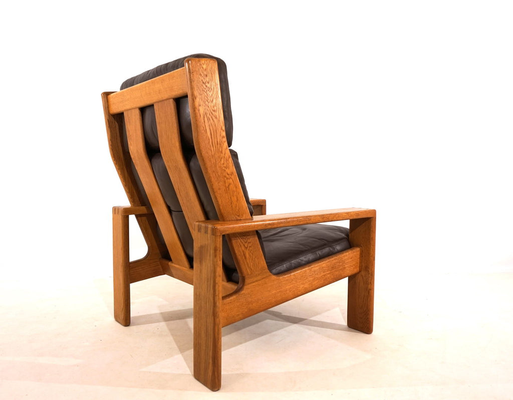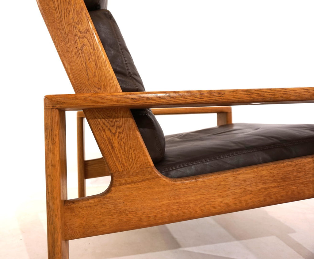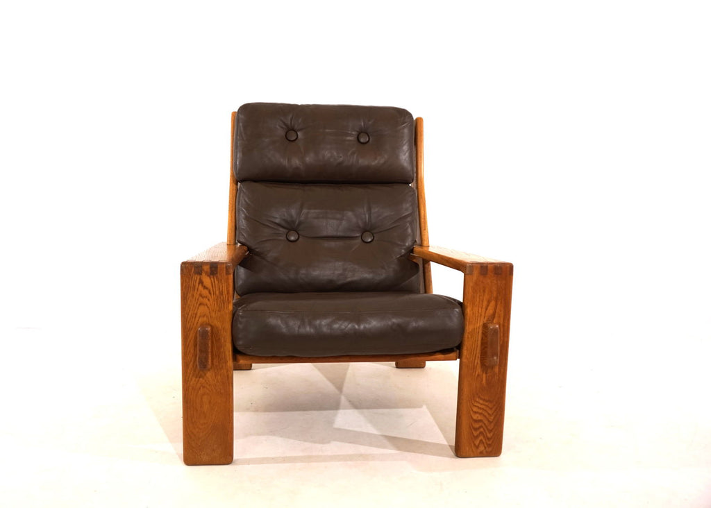 This Bonanza armchair from the 1960s comes in the rare high-back version and in dark brown leather with an oak frame. The armchair shows hardly any signs of wear on the leather, the thick leather is soft and supple. The solid oak frame is in excellent condition. The armchair offers very good seating comfort. Finnish designer Esko Pajamies designed this armchair for Asko Finland in the 1960s, creating a design classic. The Finnish furniture manufacturer Asko was founded in 1919 and made a name for itself in the 1960s and 1970s by collaborating with top designers and delivering innovative design.