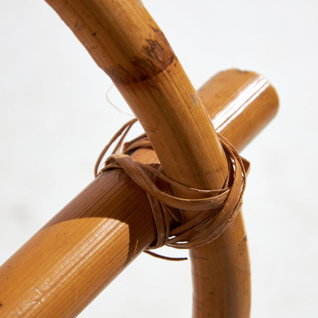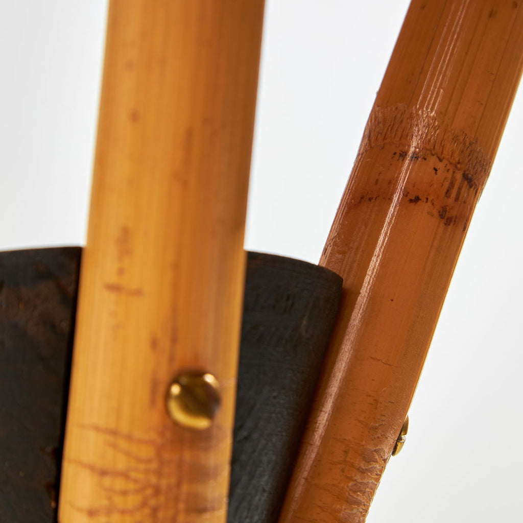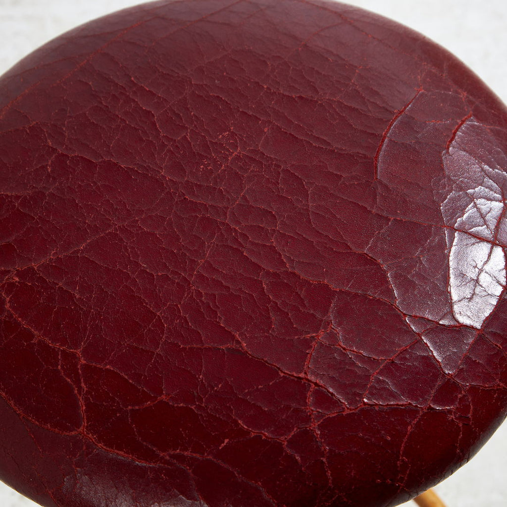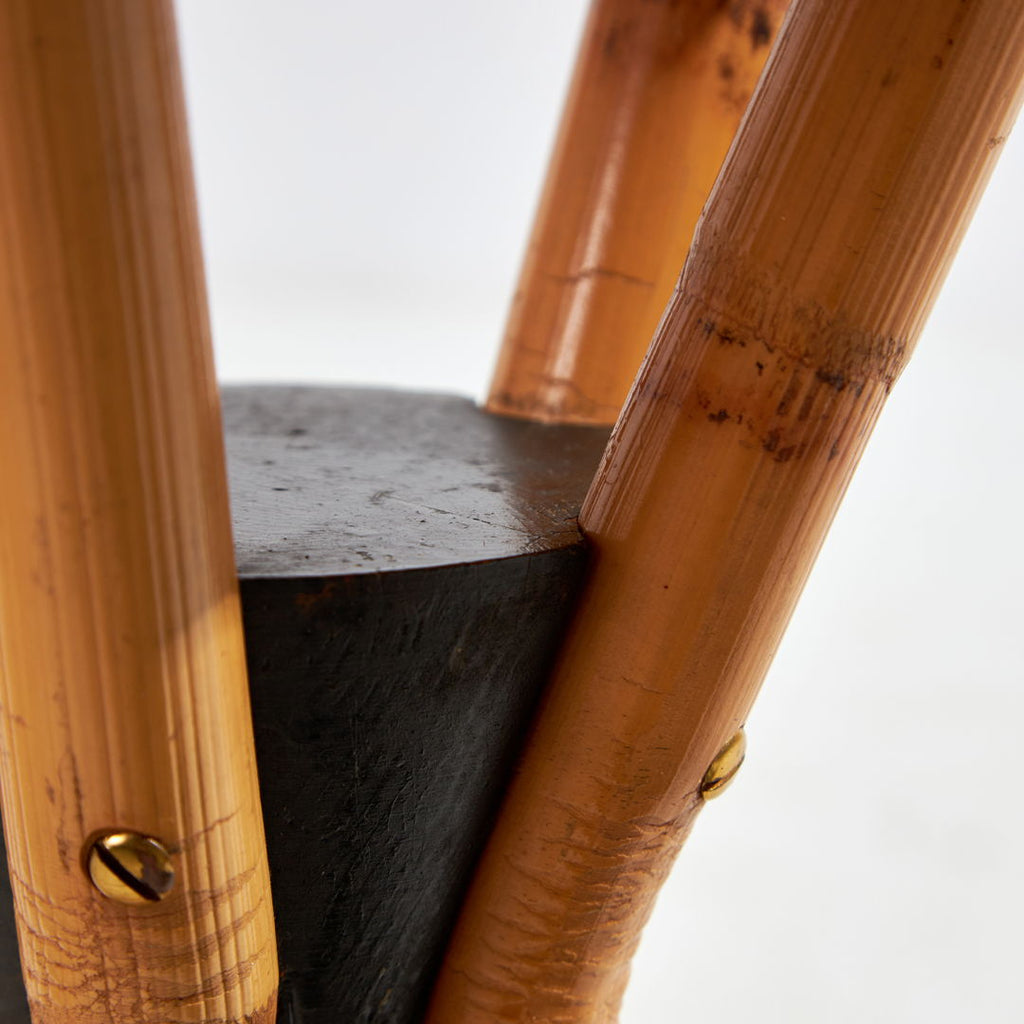 1970년대 가죽 커버를 씌운 대나무 바 스툴. 대나무와 가죽 부분에 약간의 상처와 사용감이 있습니다. 가격은 개당 가격입니다.