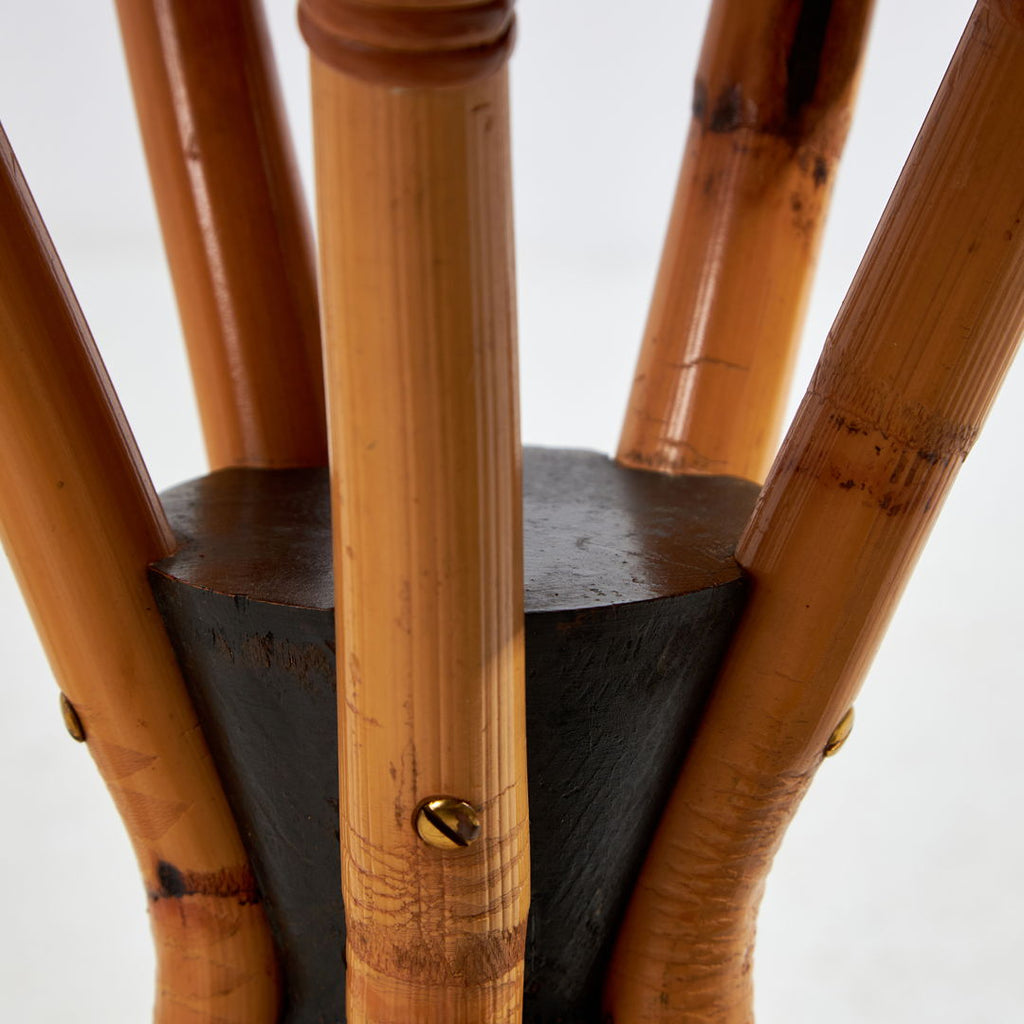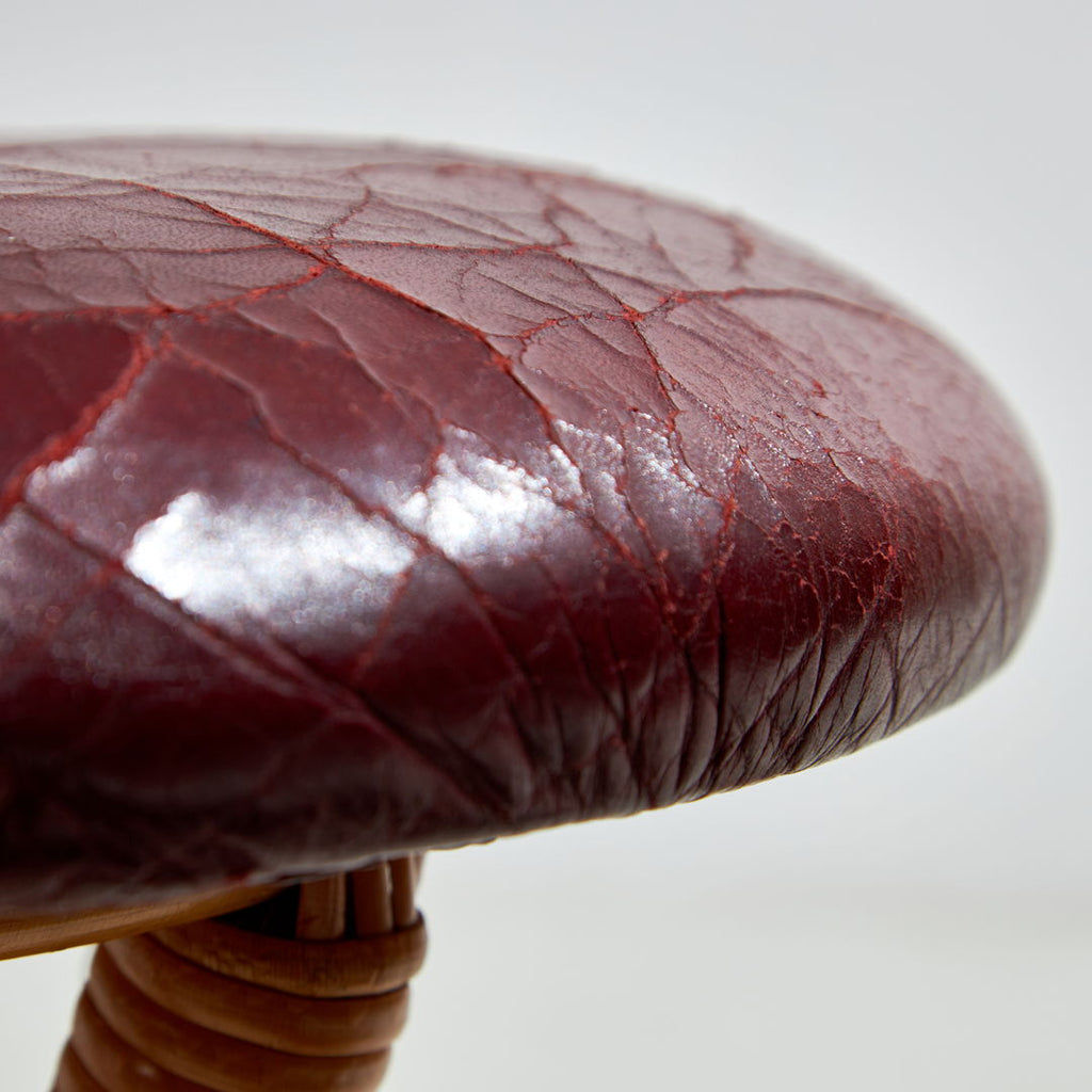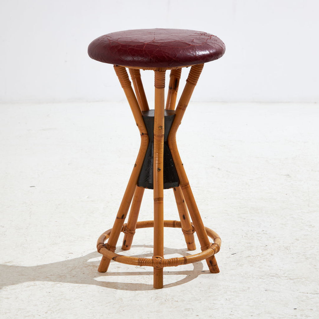 Bamboo bar stool with leather upholstery from the 1970s. With some scratches and wear on the bamboo and leather parts.
